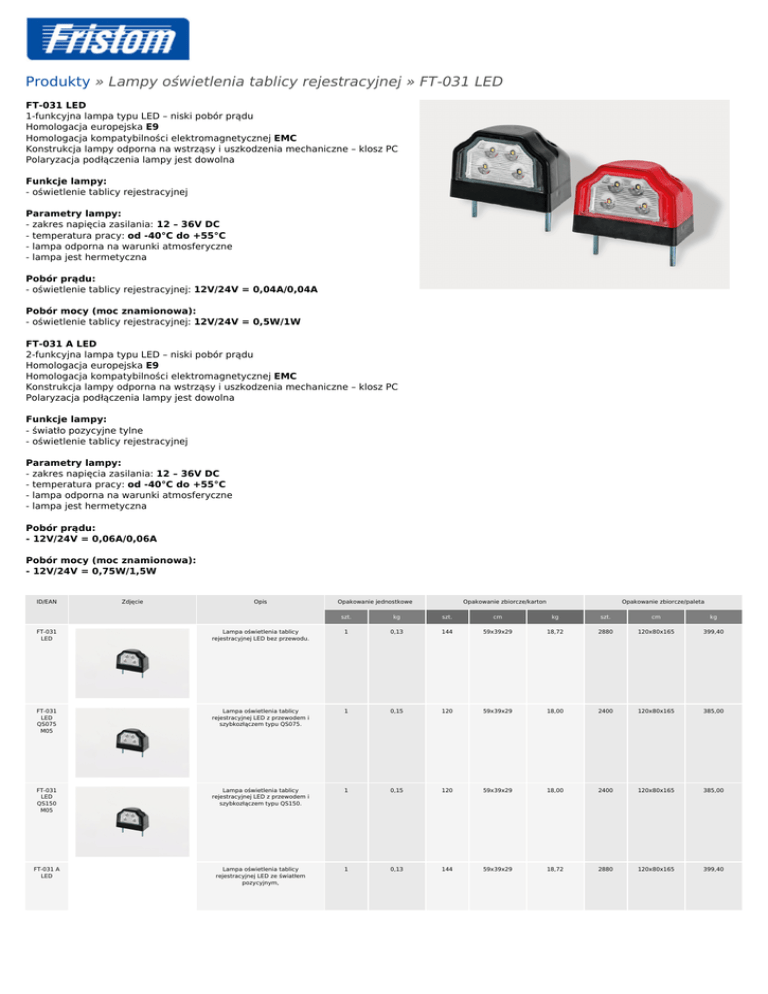 Produkty » Lampy oświetlenia tablicy rejestracyjnej » FT-031 LED FT-031 LED 1-funkcyjna lampa typu LED – niski pobór prądu Homologacja europejska E9 Homologacja kompatybilności elektromagnetycznej EMC Konstrukcja lampy odporna na wstrząsy i uszkodzenia mechaniczne – klosz PC Polaryzacja podłączenia lampy jest dowolna Funkcje lampy: - oświetlenie tablicy rejestracyjnej Parametry lampy: - zakres napięcia zasilania: 12 – 36V DC - temperatura pracy: od -40°C do +55°C - lampa odporna na warunki atmosferyczne - lampa jest hermetyczna Pobór prądu: - oświetlenie tablicy rejestracyjnej: 12V/24V = 0,04A/0,04A Pobór mocy (moc znamionowa): - oświetlenie tablicy rejestracyjnej: 12V/24V = 0,5W/1W FT-031 A LED 2-funkcyjna lampa typu LED – niski pobór prądu Homologacja europejska E9 Homologacja kompatybilności elektromagnetycznej EMC Konstrukcja lampy odporna na wstrząsy i uszkodzenia mechaniczne – klosz PC Polaryzacja podłączenia lampy jest dowolna Funkcje lampy: - światło pozycyjne tylne - oświetlenie tablicy rejestracyjnej Parametry lampy: - zakres napięcia zasilania: 12 – 36V DC - temperatura pracy: od -40°C do +55°C - lampa odporna na warunki atmosferyczne - lampa jest hermetyczna Pobór prądu: - 12V/24V = 0,06A/0,06A Pobór mocy (moc znamionowa): - 12V/24V = 0,75W/1,5W ID/EAN Zdjęcie Opis Opakowanie jednostkowe Opakowanie zbiorcze/karton Opakowanie zbiorcze/paleta szt. kg szt. cm kg szt. cm kg FT-031 LED Lampa oświetlenia tablicy rejestracyjnej LED bez przewodu. 1 0,13 144 59x39x29 18,72 2880 120x80x165 399,40 FT-031 LED QS075 M05 Lampa oświetlenia tablicy rejestracyjnej LED z przewodem i szybkozłączem typu QS075. 1 0,15 120 59x39x29 18,00 2400 120x80x165 385,00 FT-031 LED QS150 M05 Lampa oświetlenia tablicy rejestracyjnej LED z przewodem i szybkozłączem typu QS150. 1 0,15 120 59x39x29 18,00 2400 120x80x165 385,00 FT-031 A LED Lampa oświetlenia tablicy rejestracyjnej LED ze światłem pozycyjnym, 1 0,13 144 59x39x29 18,72 2880 120x80x165 399,40 FT-031 A LED QS075 M05 Lampa oświetlenia tablicy rejestracyjnej LED ze światłem pozycyjnym oraz przewodem i szybkozłączem typu QS075. 1 0,15 120 59x39x29 18,00 2400 120x80x165 385,00 FT-031 A LED QS150 M05 Lampa oświetlenia tablicy rejestracyjnej LED ze światłem pozycyjnym oraz przewodem i szybkozłączem typu QS150. 1 0,15 120 59x39x29 18,00 2400 120x80x165 385,00