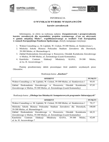 INFORMACJA O WYNIKACH WYBORU WYKONAWCÓW kursów zawodowych Informujemy, że oferty na realizację zadania: Zorganizowanie i przeprowadzenia kursów zawodowych dla uczestników projektu systemowego ,,Czas na aktywność w gminie miejskiej Mielec”, współfinansowanego ze środków Unii Europejskiej w ramach Europejskiego Funduszu Społecznego, złożyły następujące instytucje: 1. Wektor Consulting s.c. M. Lipiński, W. Cichoń, 39-300 Mielec, ul. Sienkiewicza 1, 2. Mielecka Szkoła Biznesu Policealne Studium Zawodowe dla Dorosłych, 39-300 Mielec, ul. Biernackiego 6, 3. Zakład Doskonalenia Zawodowego w Rzeszowie, Ośrodek Kształcenia Zawodowego w Mielcu, 39-300 Mielec, ul. Żeromskiego (Lasek Komunalny), 4. Katolickie Centrum Edukacji Młodzieży KANA, 39-300 Mielec, ul. ks. H. Arczewskiego 7. Poniżej przedstawiamy tabele prezentujące ilość punktów uzyskanych przez Oferentów: Realizacja kursu: „Kucharz” OFERENT PUNKTY Wektor Consulting s.c. M. Lipiński, W. Cichoń, 39-300 Mielec, ul. Sienkiewicza 1 95,93 Zakład Doskonalenia Zawodowego w Rzeszowie, Ośrodek Kształcenia Zawodowego w Mielcu, 39-300 Mielec, ul. Żeromskiego (Lasek Komunalny) 97,95 Realizacja kursu: „Obsługa kas fiskalnych i komputerowych programów fakturujących” OFERENT PUNKTY Wektor Consulting s.c. M. Lipiński, W. Cichoń, 39-300 Mielec, ul. Sienkiewicza 1 79,17 Mielecka Szkoła Biznesu Policealne Studium Zawodowe dla Dorosłych, 39-300 Mielec, ul. Biernackiego 6 Zakład Doskonalenia Zawodowego w Rzeszowie, Ośrodek Kształcenia Zawodowego w Mielcu, 39-300 Mielec, ul. Żeromskiego (Lasek Komunalny) Katolickie Centrum Edukacji Młodzieży KANA, 39-300 Mielec, ul. ks. H. Arczewskiego 7 100,00 68,32 62,68 Realizacja kursu: „Opiekun osób starszych i dzieci” OFERENT PUNKTY Wektor Consulting s.c. M. Lipiński, W. Cichoń, 39-300 Mielec, ul. Sienkiewicza 1 83,36 Mielecka Szkoła Biznesu Policealne Studium Zawodowe dla Dorosłych, 39-300 Mielec, ul. Biernackiego 6 Zakład Doskonalenia Zawodowego w Rzeszowie, Ośrodek Kształcenia Zawodowego w Mielcu, 39-300 Mielec, ul. Żeromskiego (Lasek Komunalny) 80,37 73,56 Realizacja kursu: „Kosmetyka z elementami wizażu” OFERENT PUNKTY Wektor Consulting s.c. M. Lipiński, W. Cichoń, 39-300 Mielec, ul. Sienkiewicza 1 86,47 Zakład Doskonalenia Zawodowego w Rzeszowie, Ośrodek Kształcenia Zawodowego w Mielcu, 39-300 Mielec, ul. Żeromskiego (Lasek Komunalny) 88,05 Realizacja kursu: „Księgowość małych i średnich firm” OFERENT PUNKTY Wektor Consulting s.c. M. Lipiński, W. Cichoń, 39-300 Mielec, ul. Sienkiewicza 1 100,00 Katolickie Centrum Edukacji ul. ks. H. Arczewskiego 7 77,68 Młodzieży KANA, 39-300 Mielec, Realizacja kursu: „Grafika komputerowa i tworzenie stron internetowych” OFERENT PUNKTY Wektor Consulting s.c. M. Lipiński, W. Cichoń, 39-300 Mielec, ul. Sienkiewicza 1 83,37 Mielecka Szkoła Biznesu Policealne Studium Zawodowe dla Dorosłych, 39-300 Mielec, ul. Biernackiego 6 Katolickie Centrum Edukacji Młodzieży KANA, 39-300 Mielec, ul. ks. H. Arczewskiego 7 89,03 90,27 Realizacja kursu: „Fryzjer damsko-męski” OFERENT PUNKTY Wektor Consulting s.c. M. Lipiński, W. Cichoń, 39-300 Mielec, ul. Sienkiewicza 1 80,71 Zakład Doskonalenia Zawodowego w Rzeszowie, Ośrodek Kształcenia Zawodowego w Mielcu, 39-300 Mielec, ul. Żeromskiego (Lasek Komunalny) 100,00 Realizacja kursu: „Gospodarka magazynowa z obsługą programów magazynowych i z obsługą wózka widłowego” OFERENT PUNKTY Mielecka Szkoła Biznesu Policealne Studium Zawodowe dla Dorosłych, 39-300 Mielec, ul. Biernackiego 6 Zakład Doskonalenia Zawodowego w Rzeszowie, Ośrodek Kształcenia Zawodowego w Mielcu, 39-300 Mielec, ul. Żeromskiego (Lasek Komunalny) 92,72 86,97 W wyniku przeprowadzonej analizy ofert Wykonawcami kursów zawodowych zostali: 1. „Kucharz”: Zakład Doskonalenia Zawodowego w Rzeszowie, Ośrodek Kształcenia Zawodowego w Mielcu, 39-300 Mielec, ul. Żeromskiego (Lasek Komunalny) 2. „Obsługa kas fiskalnych i komputerowych programów fakturujących”: Mielecka Szkoła Biznesu Policealne Studium Zawodowe dla Dorosłych, 39-300 Mielec, ul. Biernackiego 6 3. „Opiekun osób starszych i dzieci”: Wektor Consulting s.c. M. Lipiński, W. Cichoń, 39-300 Mielec, ul. Sienkiewicza 1 4. „Kosmetyka z elementami wizażu”: Zakład Doskonalenia Zawodowego w Rzeszowie, Ośrodek Kształcenia Zawodowego w Mielcu, 39-300 Mielec, ul. Żeromskiego (Lasek Komunalny) 5. „Księgowość małych i średnich firm”: Wektor Consulting s.c. M. Lipiński, W. Cichoń, 39-300 Mielec, ul. Sienkiewicza 1 6. „Grafika komputerowa i tworzenie stron internetowych”: Katolickie Centrum Edukacji Młodzieży KANA, 39-300 Mielec, ul. ks. H. Arczewskiego 7 7. „Fryzjer damsko-męski”: kurs nie będzie realizowany z powodu braku osób zainteresowanych tym kursem 8. „Gospodarka magazynowa z obsługą programów magazynowych i z obsługą wózka widłowego”: Mielecka Szkoła Biznesu Policealne Studium Zawodowe dla Dorosłych, 39-300 Mielec, ul. Biernackiego 6 Oferty w/wym. Wykonawców są poprawne pod względem formalnym i uzyskały największą liczbę punktów. Dyrektor mgr inż. Zdzisław Czajka