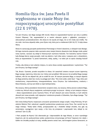 Homilia Ojca św. Jana Pawła II wygłoszona w czasie Mszy św. rozpoczynającej uroczyście pontyfikat (22 X 1978). Tyś jest Chrystus, Syn Boga żywego (Mt 16,16). Słowa te wypowiedział Szymon syn Jony w pobliżu Cezarei Filipowej. Tak, wypowiedział je w swoim własnym języku z głębokim, przeżytym i odczuwalnym przeświadczeniem. Ale słowa te nie wyszły od niego, nie w nim miały swe źródło, "bo nie ciało i nie krew objawiły tobie, jeno Ojciec mój, który jest w niebiesiech (Mt 16,17). To były słowa Wiary. Słowa te zaznaczają początek posłannictwa Piotrowego w historii zbawienia, w dziejach ludu Bożego. Od tego momentu poprzez takie wyznanie wiary święta historia zbawienia ludu Bożego miała zyskać nowy wymiar, wyrażać się odtąd w historycznym wymiarze Kościoła. Ten kościelny wymiar historii ludu Bożego bierze swoje początki, rodzi się właśnie z tych słów wiary i związany jest z człowiekiem, który je wypowiedział. Ty jesteś kamieniem, skałą, opoką, i na tobie jak na opoce zbuduję Kościół mój. Trzeba, aby dzisiaj w tym właśnie miejscu, te same słowa zostały wypowiedziane i wysłuchane: "Tyś jest Chrystus, Syn Boga żywego". Tak, Bracia i Synowie, przede wszystkim te słowa. Ich zawartość otwiera naszym oczom tajemnicę Boga żywego, tajemnicę, którą Syn zna i którą nam przybliżył. Nikt jeszcze nie przybliżył Boga żywego ludziom, nikt Go nie objawił tak, jak to zrobił On sam. W naszym poznaniu Boga, w naszym dążeniu do Boga jesteśmy zdani bez reszty na potęgę tych słów: "Kto mnie widzi, widzi Ojca". Tego, który jest nieskończony, nieprzenikniony, niewypowiedziany. Jezus Chrystus. Syn Jednorodzony, zrodzony z Maryi Dziewicy, stał się nam bliski w stajni betlejemskiej. Wy wszyscy, którzy posiadacie nieocenione szczęście wiary, wy wszyscy, którzy jeszcze szukacie Boga, a także wy, których dręczy zwątpienie, zechciejcie przyjąć raz jeszcze - dzisiaj, w tym świętym miejscu - słowa wypowiedziane przez Szymona Piotra. W tych słowach jest wiara Kościoła, w tych właśnie słowach jest nowa prawda, czyli najwyższa i ostateczna prawda o Człowieku, Synu Boga żywego. "Tyś jest Chrystus, Syn Boga żywego". Dziś nowy biskup Rzymu rozpoczyna uroczyście sprawowanie swego urzędu i misję Piotrową. W tym właśnie Mieście Piotr zakończył, wypełnił posłannictwo powierzone przez Pana. Pan zwrócił się do niego mówiąc: "Kiedy byłeś młody, przepasywałeś się i chodziłeś dokąd chciałeś, lecz gdy się zestarzejesz, wyciągniesz ręce swoje, a kto inny cię przepasze i poprowadzi tam, dokąd ty nie zechcesz" (Jan 21,18). I Piotr przybył do Rzymu! Cóż skierowało go i doprowadziło do tego Miasta, w serce rzymskiego Imperium, jak nie posłuszeństwo wobec posłannictwa otrzymanego od Pana? Zapewne ten rybak z Galilei nie chciałby przybyć aż tutaj, wolałby pewnie zostać tam, nad brzegiem jeziora Genezaret, ze 1 swoją łodzią i sieciami. Ale prowadzony przez Pana, posłuszny natchnieniu, dotarł tu. Jak głosi starożytna tradycja (która znalazła wspaniały wyraz literacki w powieści Henryka. Sienkiewicza), w czasie prześladowań Nerona Piotr zamierzał opuścić Rzym. Ale Pan przeszkodził mu w tym, wychodząc na jego spotkanie. Piotr zwrócił się do Niego pytając: "Quo vadis Domine? - Dokąd idziesz Panie?". A On odpowiedział mu zaraz: "Do Rzymu idę, by mnie tam ukrzyżowano po raz wtóry". Piotr wrócił do Rzymu i pozostał w nim aż do swego ukrzyżowania. Tak, Bracia i Synowie - Rzym jest Stolicą Piotra. W ciągu wieków następowali na niej coraz to nowi biskupi. Dziś właśnie nowy biskup wstępuje na rzymską Stolicę Piotra. Biskup przejęty głębokim drżeniem w poczuciu swej niegodności. I jak tu nie drżeć wobec wielkości takiego wezwania i wobec powszechnej misji tej Stolicy rzymskiej. Na rzymską Stolicę Piotra wstępuje dzisiaj biskup, który nie jest rzymianinem. Biskup, który jest synem Polski. Ale z tą chwilą i on staje się rzymianinem. Tak, rzymianinem! Także dlatego, że jest synem narodu, którego historia od zarania dziejów i którego tysiącletnia tradycja naznaczone są żywą, mocną, nigdy nie przerwaną, przeżytą i głęboką więzią ze Stolicą Piotrową. Narodu, który tej Stolicy pozostał zawsze wierny. O, niezbadane są wyroki boskiej Opatrzności! W minionych wiekach, kiedy następca Piotra brał w posiadanie swoją Stolicę, wkładano na jego głowę potrójną koronę. Ostatnim ukoronowanym był Papież Paweł VI w roku 1963. I on jednak po uroczystym obrzędzie koronacji nigdy już więcej nie włożył tiary, pozostawiając swoim następcom swobodę decyzji w tej sprawie. Papież Jan Paweł I, którego wspomnienie jest tak jeszcze żywe w naszych sercach, nie chciał potrójnej korony, a dzisiaj nie chce jej jego następca. Nie czas, w istocie, powracać do tego obrzędu, który - może niesłusznie - uznany został za symbol doczesnej władzy papieży. Nasz czas skłania nas, zachęca, zmusza do spojrzenia na Pana i zanurzenia się w pokorne i pobożne rozważanie tajemnicy najwyższej władzy samego Chrystusa. Tego, który zrodzony z Maryi Dziewicy, syn cieśli - jak mniemano, Syn Boga żywego - jak to wyznał Piotr, przyszedł tu, by z nas wszystkich uczynić jedno królestwo: królestwo kapłańskie. Sobór Watykański II przypomniał na nowo tajemnicę tej władzy oraz fakt, że posłannictwo Chrystusa - Kapłana, Proroka i Króla - trwa nadal w Kościele. Wszyscy, cały lud Boży uczestniczy w tym potrójnym posłannictwie. I chociaż dawniej wkładano na głowę papieża tiarę, potrójną koronę, by poprzez ten symbol wyrazić cały ustrój hierarchiczny Kościoła Chrystusowego, cała "święta władza" w nim sprawowana nie jest niczym innym jak służbą, służbą mającą na celu jedną tylko rzecz: by cały lud Boży uczestniczył w tej potrójnej misji Chrystusa i pozostawał na zawsze we władzy Pana, z