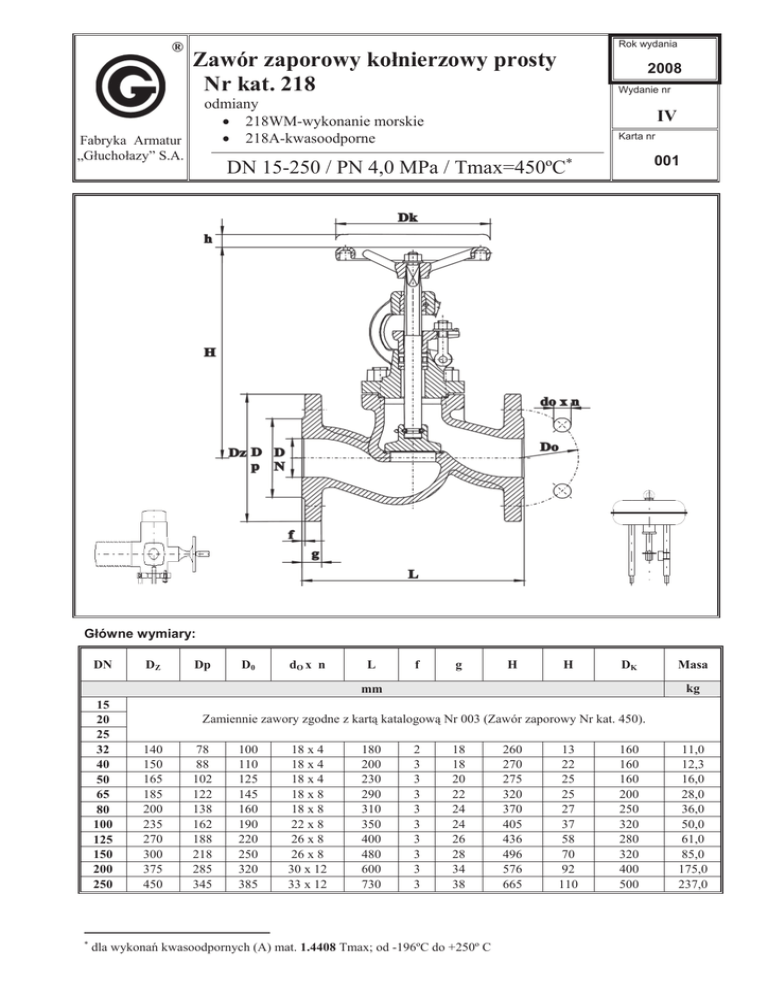 ® Rok wydania Zawór zaporowy koánierzowy prosty Nr kat. 218 2008 Wydanie nr odmiany x 218WM-wykonanie morskie x 218A-kwasoodporne Fabryka Armatur „Gáuchoáazy” S.A. IV DN 15-250 / PN 4,0 MPa / Tmax=450ºC Karta nr 001 Gáówne wymiary: DN DZ Dp D0 dO x n L f g H H DK kg mm 15 20 25 32 40 50 65 80 100 125 150 200 250 Masa Zamiennie zawory zgodne z kartą katalogową Nr 003 (Zawór zaporowy Nr kat. 450). 140 150 165 185 200 235 270 300 375 450 78 88 102 122 138 162 188 218 285 345 100 110 125 145 160 190 220 250 320 385 18 x 4 18 x 4 18 x 4 18 x 8 18 x 8 22 x 8 26 x 8 26 x 8 30 x 12 33 x 12 180 200 230 290 310 350 400 480 600 730 2 3 3 3 3 3 3 3 3 3 18 18 20 22 24 24 26 28 34 38 dla wykonaĔ kwasoodpornych (A) mat. 1.4408 Tmax; od -196ºC do +250º C 260 270 275 320 370 405 436 496 576 665 13 22 25 25 27 37 58 70 92 110 160 160 160 200 250 320 280 320 400 500 11,0 12,3 16,0 28,0 36,0 50,0 61,0 85,0 175,0 237,0 Zastosowanie: Zawory zaporowe koánierzowe moĪna montowaü w dowolnym poáoĪeniu na rurociągach, zwracając jedynie uwagĊ na prawidáowy kierunek przepáywu czynnika, który powinien byü zgodny z oznaczeniem na kadáubie. Zawory przeznaczone są do odcinania przepáywu czynnika roboczego. W wykonaniu z grzybem regulacyjnym sáuĪą ponadto do dáawienia przepáywu. Czynnik roboczy : Zawory przeznaczone są do wody, pary, oleju oraz innych neutralnych czynników ciekáych i gazowych w przedziale temperatur od –10 qC do 450 qC, w wykonaniu morskim „WM”- do pracy w warunkach morskich i do wody morskiej, w wykonaniu kwasoodpornym do czynników aktywnych chemicznie takich jak kwasy, zasady roztwory soli itp. w zakresie stĊĪeĔ uwarunkowanych odpornoĞcią chemiczną materiaáów uĪytych do budowy zaworów. Zakres stosowania : CiĞnienie nominalne 263 do 393 K PN [MPa] (- 10 do 120 qC) 1.0619 4,0 1.4408 NajwiĊksze ciĞnienie robocze przy temp. czynnika [K] (qC) 473 K 523 K 573 K 623 K 673 K (200 qC) (250 qC) ( 300 qC) (350 qC) (400 qC) 3,5 3,2 2,8 2,4 2,1 4,0 2,6 723 K (450 qC) 1,3 2,4 Szczegóáowe informacje zawiera wykres „Dopuszczalne parametry robocze armatury dla stosowanych materiaáów” (Ukáad p/t) w czĊĞci IV katalogu. Materiaáy podstawowe: Nazwa czĊĞci Kadáub Siedlisko kadáuba - DN 15-25 - DN 32-200 Pokrywa - DN 15-50 - DN 65-250 TrzpieĔ Siedlisko grzyba -DN 15-50 -DN 65-80 -DN 100-250 Uszczelnienia standard 1.0619 Materiaá wykonanie morskie 1.0619 kwasoodporne 1.4408 17Cr 18-8 Cr-Ni 17Cr 18-8 Cr-Ni 18-8 Cr-Ni 18-8 Cr-Ni 1.0460 / 1.0619 1.0619 13 Cr 1.0460 / 1.0619 1.0619 17 Cr 1.4408 1.4408 18-8 Cr-Ni 13 Cr 13 Cr 18-8 C r-Ni Grafit 17Cr 18-8 Cr-Ni 18-8 Cr-Ni Grafit 18-8 Cr-Ni 18-8 Cr-Ni 18-8 Cr-Ni Grafit Uwagi : 1. 2. 3. 4. 5. 6. 7. 8. Koánierze zaworów wykonanie standard: z przylgą-„B1” wg PN-EN 1092-1:2004, owiercenie wg PN-EN 10921:2004. Na Īyczenie wykonujemy inne rodzaje przylgi zgodnie z: PN-EN 1092-1:2004, ANSI, BS, DIN lub teĪ wg indywidualnych potrzeb klienta. Wykonujemy równieĪ zawory z koánierzami na ciĞnienia PN (0,6 ÷2,5) [MPa ]. Wymagania i badania techniczne zaworów wg PN-EN 12266-1:2003. Klasa szczelnoĞci A wg PN-EN 12266-1:2003. DáugoĞü budowy wg PN-EN 558-1:2001. ĝwiadectwo odbioru wg Īyczenia Klienta-wg PN-EN 10204:2005. Kierunek przepáywu czynnika: dla DN 15÷100 o pod grzyb, dla DN od 125 o na grzyb. Zawory w wykonaniu morskim- WM wykonujemy zgodnie z normą PN-W-74017:1998, na Īyczenie Klienta zawory mogą podlegaü odbiorowi Towarzystw Klasyfikacyjnych: GL, LRS, BV, DNV, PMPC (RMRS), ABS, RINA. UWAGA – W zapytaniu / zamówieniu prosimy o podanie norm i typu przyáącza oraz medium i parametry pracy. ® Producent i dostawca: Adres: Fabryka Armatur „Gáuchoáazy” S.A. 48-340 Gáuchoáazy ul. Wrocáawska 1A tel.: 077 / 439 19 44 fax: 077 / 439 19 46 e-mail: [email protected] http: www.fagsa.com.pl Producent zastrzega moĪliwoĞü wprowadzenia zmian w wyrobach bez powiadamiania.