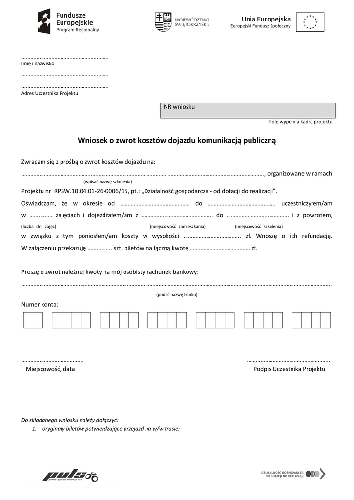 …………………………………………………. Imię i nazwisko …………………………………………………. …………………………………………………. Adres Uczestnika Projektu NR wniosku Pole wypełnia kadra projektu Wniosek o zwrot kosztów dojazdu komunikacją publiczną Zwracam się z prośbą o zwrot kosztów dojazdu na: ………………………………………..……………………………………………………………………………………………………, organizowane w ramach (wpisać nazwę szkolenia) Projektu nr RPSW.10.04.01-26-0006/15, pt.: „Działalność gospodarcza - od dotacji do realizacji”. Oświadczam, że w okresie od …………………………..………….. do ……………………….…………….. uczestniczyłem/am w …….…..… zajęciach i dojeżdżałem/am z ……………..………………………... do ……………..………..…………. i z powrotem, (liczba dni zajęć) (miejscowość zamieszkania) (miejscowość szkolenia) ) w związku z tym poniosłem/am koszty w wysokości ……………………………….. zł. Wnoszę o ich refundację. W załączeniu przekazuję ………..….. szt. biletów na łączną kwotę …………………………………. zł. Proszę o zwrot należnej kwoty na mój osobisty rachunek bankowy: ………………………………….…………………………………………………………………………………………………………………………………………………. (podać nazwę banku) Numer konta: ……………………….…………. Miejscowość, data Do składanego wniosku należy dołączyć: 1. oryginały biletów potwierdzające przejazd na w/w trasie; ………..…………………………………….. Podpis Uczestnika Projektu …………………………………………………. Imię i nazwisko …………………………………………………. …………………………………………………. NR wniosku Adres Uczestnika Projektu Pole wypełnia kadra projektu Wniosek o zwrot kosztów dojazdu samochodem prywatnym Zwracam się z prośbą o zwrot kosztów dojazdu na: ………………………………………..……………………………………………………………………………………………………, organizowane w ramach (wpisać nazwę szkolenia) Projektu nr RPSW.10.04.01-26-0006/15, pt.: „Działalność gospodarcza - od dotacji do realizacji”. Oświadczam, że w okresie od …………………………..………….. do ……………………….…………….. uczestniczyłem/am w …….…..… zajęciach i dojeżdżałem/am z ……………………………………... do ……………………..…………. i z powrotem (liczba dni zajęć) (miejscowość zamieszkania) (miejscowość szkolenia) samochodem o numerze rejestracyjnym ………………………………….. . W związku z tym wnoszę o refundację kosztów dojazdu do wysokości ceny najtańszego/ych biletu/ów transportu publicznego na w/w trasie, która obsługiwana jest przez……………………………………………………… i wynosi ………………………………………….. zł. Proszę o zwrot kosztów dojazdu w wysokości: ………………………..….…….. (liczba dni zajęć) x ………….………………………….. zł (cena najtańszego biletu) x 2 = …………………………………….. zł ( kwota wnioskowana) Proszę o zwrot należnej kwoty na mój osobisty rachunek bankowy: ………………………………………………………………………………………………………………………………………………………….………………………… (podać nazwę banku) Numer konta: ……………………….…………. Miejscowość, data ………..…………………………………….. Podpis Uczestnika Projektu Do składanego wniosku należy dołączyć: 1. kserokopia prawa jazdy Uczestnika Projektu z dopiskiem „Potwierdzam za zgodność z oryginałem (imię i nazwisko, podpis UP)” 2. kserokopia dowodu rejestracyjnego samochodu z dopiskiem „Potwierdzam za zgodność z oryginałem (imię i nazwisko, podpis UP)” 3. zaświadczenie przewoźnika wykonującego usługi w zakresie komunikacji publicznej o wysokości najtańszego biletu na danej trasie lub w przypadku odmowy wydania przez przewoźnika takiego zaświadczenia – oświadczenie Uczestnika projektu o cenie najtańszego biletu na danej trasie, z załączonym biletem potwierdzającym koszt dojazdu z miejsca zamieszkania do miejsca odbywania szkoleń; 4. umowa użyczenia samochodu (jeśli właścicielem nie jest Uczestnik Projektu); 5. oświadczenie Uczestnika Projektu osoby dowożonej oraz oświadczenie osoby dowożącej o dowożeniu Uczestnika Projektu wraz z kserokopią prawa jazdy osoby dowożącej i dowodu rejestracyjnego samochodu (jeżeli Uczestnik był dowożony); ………………………………………………… Miejscowość i data OŚWIADCZENIE PRZEWOŹNIKA O CENIE BILETU Oświadczam, że cena najtańszego biletu jednorazowego normalnego (dla osoby dorosłej) na trasie od ……………………..………………………………………………..……………… do ……………………..………………………………………………..…………… wynosi ………………..…. brutto. …………………………………..…………….……………………. Pieczęć i podpis Przewoźnika UMOWA UŻYCZENIA SAMOCHODU zawarta w dn. ....................... w ...................................................... pomiędzy: ..................................................... , zamieszkałym w ............................. przy ul. ............................................., legitymującym się dowodem osobistym serii ……... nr .