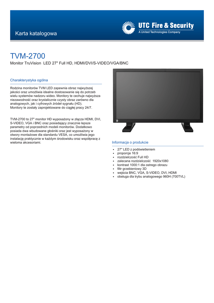 Karta katalogowa TVM-2700 Monitor TruVision LED 27" Full HD, HDMI/DVI/S-VIDEO/VGA/BNC Charakterystyka ogólna Rodzina monitorów TVM LED zapewnia obraz najwyższej jakości oraz umożliwia idealne dostosowanie się do potrzeb wielu systemów nadzoru wideo. Monitory te cechuje najwyższa niezawodność oraz krystalicznie czysty obraz zarówno dla analogowych, jak i cyfrowych źródeł sygnału (HD). Monitory te zostały zaprojektowane do ciągłej pracy 24/7. TVM-2700 to 27" monitor HD wyposażony w złącza HDMI, DVI, S-VIDEO, VGA i BNC oraz posiadający znacznie lepsze parametry od poprzednich modeli monitorów. Dodatkowo posiada dwa wbudowane głośniki oraz jest wyposażony w otwory montażowe dla standardu VESA, co umożliwia jego instalację praktycznie w każdym środowisku oraz współpracę z wieloma akcesoriami. Informacja o produkcie E E E E E E E E 27'' LED z podświetleniem proporcje 16:9 rozdzielczość Full HD zalecana rozdzielczość 1920x1080 kontrast 1000:1 dla ostrego obrazu filtr grzebieniowy 3D wejścia BNC, VGA, S-VIDEO, DVI, HDMI obsługa dla trybu analogowego 960H (700TVL) TVM-2700 Monitor TruVision LED 27" Full HD, HDMI/DVI/S-VIDEO/VGA/BNC Specyfikacja Jak zamawiać Monitor Rozmiar: 27" LED Proporcje: 16:9 Kąt widzenia (H/V): 178° / 178° Kontrast: 1000:1 Czas odpowiedzi: 12ms Jaskrawość: 300cd/m (maks.) Zalecana rozdzielczość: 1920 x 1080 @ 60Hz Kompatybilność wideo NTSC/PAL - autodetekcja AudioMoc głośnika: 5W x 2 Głośniki: wbudowane InterfejsWejście / wyjście 2/2 wideo (BNC): Wejście audio (RCA): 2 Wejście VGA (złącze 15pin 1 d-sub): HDMI: 1 DVI / S-VIDEO: 1/1 Wejście PC stereo: 1 Wyjście słuchawkowe: 1 SterowaniePrzyciski Zasilanie, Góra/Dół, W lewo/W prawo, Źródło, sterujące: Menu OSD angielski, francuski, hiszpański, niemiecki, OSD: włoski, polski Pilot: Tak ZasilaniePobór mocy: < 50W Napięcie wejściowe: 90 do 260 VAC Filtr Grzebieniowy 3D, bez przeplotu Wymiary Szer. x Wys. x Głęb. (bez 644 x 388 x 65 mm podstawy): Szer. x Wys. x Głęb. (z 644 x 428 x 200 mm podstawą): Waga bez podstawy: 6.9Kg z podstawą: 8.5Kg Otwory montażowe dla 200(100) x 100 mm standardu Vesa Obudowa Metalowa Kod produktu UTC Fire & Security zastrzega sobie prawo do zmian specyfikacji produktu bez uprzedzenia. Aktualne specyfikacje produktów można znaleźć na stronie www.utcfssecurityproducts.pl lub kontaktując się z regionalnym przedstawicielem handlowym. TVM-2700-2015-03-16 09:45:54 Released :16-MAR-15 TVM-2700 Opis Monitor TruVision LED 27" Full HD, HDMI/DVI/S-VIDEO/VGA/ BNC