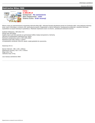 Informacje o produkcie Utworzono 06-03-2017 Hafciarka Nitex 900 Cena : 3.300,00 zł Dostępność : Na zamówienie Stan magazynowy : niski Średnia ocena : brak recenzji Witamy mamy do zaprezentowania niezawodną Hafciarkę Nitex 900 . Hafciarka Posiada wbudowaną pamięć do 2milionów wkłuć ,duży dotykowy kolorowy ekran ,alarm informujący o zerwaniu nitki ,automatyczny powrót .Podpowiedzi w trakcie haftowania, rozwiązywanie problemów wszystkie informacje wyświetlane na dużym kolorowym wyświetlaczu .Możliwość edytowania wzoru na ekranie , powiększanie obracanie wzorem . Szybkość Haftowania - 650 wkłuć /min Pamięć koło 100 haftów Szybkie złącze usb które pozwala na sychronizacje haftów między komputerem a hafciarką Hafciarka na podzespołach japońskiej firmy Tajima Możliwość powiększania wzoru o 50%,100%,200% Największe pole haftu 235mm x 110mm na wyposażeniu tamborek 235x110, szpulki ,stopki,pedzelek do czyszczenia, Gwarancja 24 m-c Wymiar Hafciarki : 390 × 220 × 300mm Opakowanie wymiary: 510 × 375 × 370mm Waga netto: 9 kg Całkowita masa: 10 kg czas reaizacji zamówienia 30dni Wygenerowano w programie www.oscGold.com