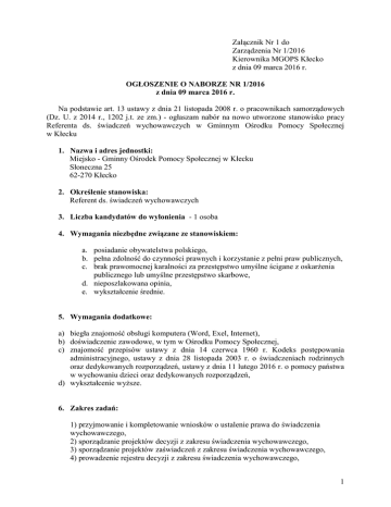 Załącznik Nr 1 do Zarządzenia Nr 1/2016 Kierownika MGOPS Kłecko z dnia 09 marca 2016 r. OGŁOSZENIE O NABORZE NR 1/2016 z dnia 09 marca 2016 r. Na podstawie art. 13 ustawy z dnia 21 listopada 2008 r. o pracownikach samorządowych (Dz. U. z 2014 r., 1202 j.t. ze zm.) - ogłaszam nabór na nowo utworzone stanowisko pracy Referenta ds. świadczeń wychowawczych w Gminnym Ośrodku Pomocy Społecznej w Kłecku 1. Nazwa i adres jednostki: Miejsko - Gminny Ośrodek Pomocy Społecznej w Kłecku Słoneczna 25 62-270 Kłecko 2. Określenie stanowiska: Referent ds. świadczeń wychowawczych 3. Liczba kandydatów do wyłonienia - 1 osoba 4. Wymagania niezbędne związane ze stanowiskiem: a. posiadanie obywatelstwa polskiego, b. pełna zdolność do czynności prawnych i korzystanie z pełni praw publicznych, c. brak prawomocnej karalności za przestępstwo umyślne ścigane z oskarżenia publicznego lub umyślne przestępstwo skarbowe, d. nieposzlakowana opinia, e. wykształcenie średnie. 5. Wymagania dodatkowe: a) biegła znajomość obsługi komputera (Word, Exel, Internet), b) doświadczenie zawodowe, w tym w Ośrodku Pomocy Społecznej, c) znajomość przepisów ustawy z dnia 14 czerwca 1960 r. Kodeks postępowania administracyjnego, ustawy z dnia 28 listopada 2003 r. o świadczeniach rodzinnych oraz dedykowanych rozporządzeń, ustawy z dnia 11 lutego 2016 r. o pomocy państwa w wychowaniu dzieci oraz dedykowanych rozporządzeń, d) wykształcenie wyższe. 6. Zakres zadań: 1) przyjmowanie i kompletowanie wniosków o ustalenie prawa do świadczenia wychowawczego, 2) sporządzanie projektów decyzji z zakresu świadczenia wychowawczego, 3) sporządzanie projektów zaświadczeń z zakresu świadczenia wychowawczego, 4) prowadzenie rejestru decyzji z zakresu świadczenia wychowawczego, 1 5) obsługa programu związanego z realizacją świadczenia wychowawczego, 6) sporządzanie list wypłat i sprawozdań dot. świadczenia wychowawczego, 7) organizowanie realizacji świadczeń i czuwanie nad prawidłowością ich wykonania, 8) przygotowanie dokumentacji przewidzianej obowiązującymi przepisami dla danego świadczenia, 9) przyjmowanie i obsługa petentów w sprawach świadczenia wychowawczego, 10) doskonalenie zawodowe, doskonalenie form pracy, bieżące zapoznawanie się z aktami prawnymi i zarządzeniami, 7. Informacja o warunkach pracy na stanowisku : 1) miejscem wypełniania obowiązków pracowniczych będzie MGOPS w Kłecku, ul. Słoneczna 25, 62-270 Kłecko, 2) praca na pełen etat, 3) praca w godzinach od 8.00 do 16.00 w poniedziałek, a od wtorku do piątku od 7.00 do 15.00, 4) wynagrodzenie ustalane zgodnie z rozporządzeniem Rady Ministrów z dnia 18 marca 2009 r. w sprawie wynagradzania pracowników samorządowych (Dz. U. z 2014r, poz. 1786 j.t.) oraz Regulaminem wynagradzania pracowników Miejsko - Gminnego Ośrodka Pomocy Społecznej w Kłecku, 5) w pracy konieczne będzie manualne korzystanie z urządzeń technicznych: (komputer osobisty, drukarka, kserokopiarka, telefon, niszczarka dokumentów, itp.) 6) praca na komputerze powyżej 4 godzin dziennie, 7) kontakty bezpośrednie i telefoniczne z klientami Ośrodka. 8. Informacja o wskaźniku zatrudnienia osób niepełnosprawnych w jednostce: Zgodnie z art. 13 ust. 2 pkt 4b ustawy z dnia 21 listopada 2008 r. o pracownikach samorządowych (Dz. U. z 2014, poz. 1202 j.t.) informuję, iż w miesiącu poprzedzającym datę upublicznienia ogłoszenia wskaźnik zatrudnienia osób niepełnosprawnych w jednostce, w rozumieniu przepisów o rehabilitacji zawodowej i społecznej oraz zatrudnianiu niepełnosprawnych osiągnął poziom 6%. 9. a) b) c) d) e) f) g) h) Wymagane dokumenty: list motywacyjny wraz ze wskazaniem numeru telefonu, życiorys – curriculum vitae, kserokopie dokumentów potwierdzających kwalifikacje wymagane do zajmowania stanowiska referenta ds. świadczeń wychowawczych, kserokopie dokumentów potwierdzających staż pracy, inne dokumenty potwierdzające posiadane kwalifikacje i umiejętności, oświadczenie kandydata o braku przeciwwskazań zdrowotnych do wykonywania pracy na stanowisku referenta ds. świadczeń wychowawczych, oświadczenie o niekaralności za przestępstwo umyślne ścigane z oskarżenia publicznego oraz umyślne przestępstwo skarbowe , oświadczenie o korzystaniu z pełni praw publicznych i posiadaniu pełnej zdolności do czynności prawnych. 2 10. Forma i termin składania ofert: Wymagane dokumenty należy złożyć w siedzibie Miejsko - Gminnego Ośrodka Pomocy Społecznej w Kłecku, pokój Nr 211 w dwóch kopertach, pierwszej zewnętrznej – zamkniętej, na której winna być określona nazwa stanowiska, na które ogłoszany jest nabór i wewnętrznej – zamkniętej, na której winny być dane osobowe i adres ubiegającego się w naborze i jego podpis - w terminie do dnia 21 marca 2015 r. do godz. 15.00. Dokumenty, które wpłyną do Miejsko - Gminnego Ośrodka Pomocy Społecznej w Kłecku po wskazanym wyżej terminie nie będą rozpatrywane. List motywacyjny, szczegółowy życiorys z uwzględnieniem dokładnego przebiegu kariery zawodowej, powinny być opatrzone klauzulą : „Wyrażam zgodę na przetwarzanie moich danych osobowych zawartych w ofercie pracy i niezbędnych do procesu rekrutacji zgodnie z ustawą z dnia 29 sierpnia 1997r. o ochronie danych osobowych (Dz. U. z 2014 r., poz. 1182 j.t.) oraz ustawy z dnia 21 listopada 2008 r. o pracownikach samorządowych (Dz. U. z 2014 r., poz. 1202 j.t.). Kandydaci, którzy spełnią wymagania formalne zostaną ponformowani telefonicznie o terminie kolejnego etapu rekrutacji. Informacja o wyniku naboru będzie umieszczona na tablicy ogłoszeń w Miejsko - Gminnym Ośrodku Pomocy Społecznej w Kłecku oraz na stronie internetowej Biuletynu Informacji Publicznej Gminy Kłecko. Informacje o kandydatach, którzy zgłosili się do naboru, stanowią informację publiczną w zakresie objętych wymaganiami związanymi ze stanowiskiem określonym w ogłos