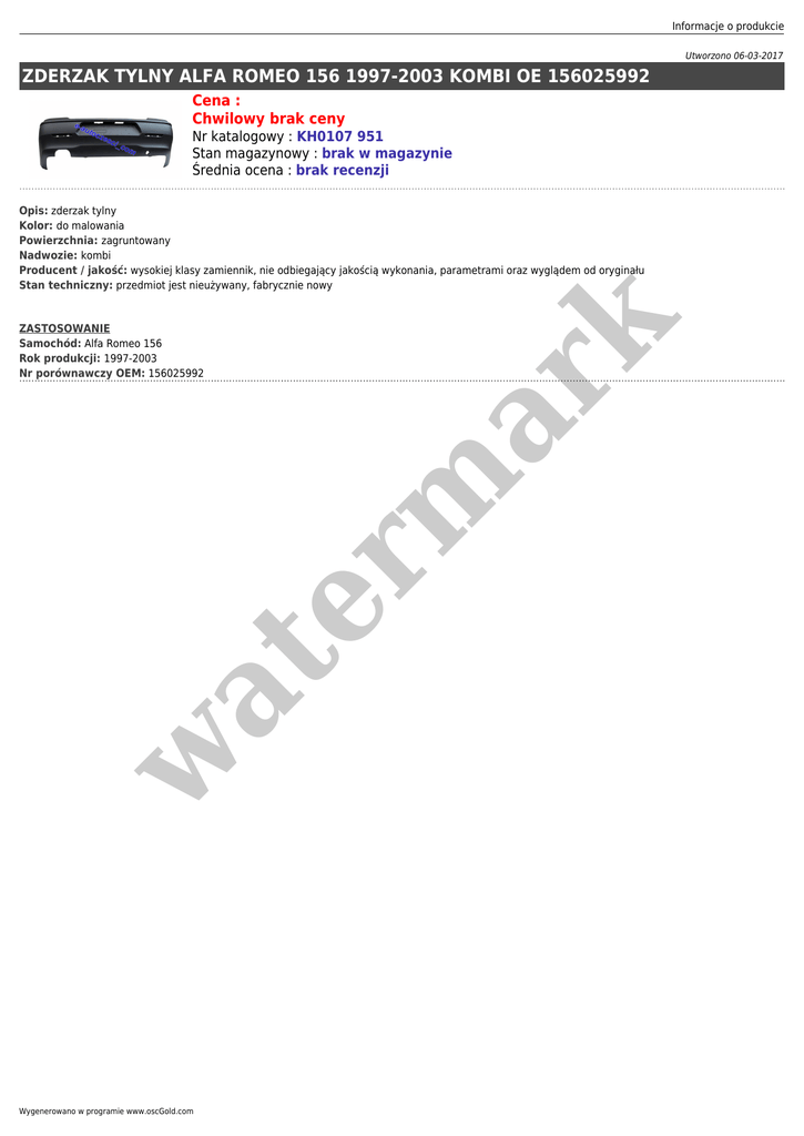 Informacje o produkcie Utworzono 06-03-2017 ZDERZAK TYLNY ALFA ROMEO 156 1997-2003 KOMBI OE 156025992 Cena : Chwilowy brak ceny Nr katalogowy : KH0107 951 Stan magazynowy : brak w magazynie Średnia ocena : brak recenzji w at ZASTOSOWANIE Samochód: Alfa Romeo 156 Rok produkcji: 1997-2003 Nr porównawczy OEM: 156025992 er m ar k Opis: zderzak tylny Kolor: do malowania Powierzchnia: zagruntowany Nadwozie: kombi Producent / jakość: wysokiej klasy zamiennik, nie odbiegający jakością wykonania, parametrami oraz wyglądem od oryginału Stan techniczny: przedmiot jest nieużywany, fabrycznie nowy Wygenerowano w programie www.oscGold.com