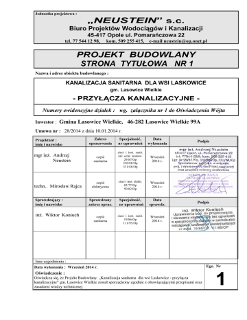 Jednostka projektowa : „NEUSTEIN” s.c. Biuro Projektów Wodociągów i Kanalizacji 45-417 Opole ul. Pomarańczowa 22 tel. 77 544 12 98, kom. 509 255 415, e-mail [email protected] PROJEKT BUDOWLANY STRONA TYTUŁOWA NR 1 Nazwa i adres obiektu budowlanego : KANALIZACJA SANITARNA DLA WSI LASKOWICE gm. Lasowice Wielkie - PRZYŁĄCZA KANALIZACYJNE Numery ewidencyjne działek : wg. załącznika nr 1 do Oświadczenia Wójta Inwestor : Gmina Lasowice Wielkie, 46-282 Lasowice Wielkie 99A Umowa nr : 28/2014 z dnia 10.01.2014 r. Projektant : imię i nazwisko mgr inż. Andrzej Neustein techn.. Mirosław Rajca Sprawdzający : imię i nazwisko inż. Wiktor Koniuch Zakres opracowania Specjalność, nr uprawnień Data wykonania część sanitarna sieci i inst. sanit. urz. ochr. środow. 29/87/Op 330/88/Op 331/88/Op Wrzesień 2014 r. część elektryczna sieci i inst. elektr. 83/77/Op 50/82/Op Wrzesień 2014 r. Specjalność, nr uprawnień Data sprawdz. Sprawdzany zakres oprac. część sanitarna sieci i inst. sanit. 19/86/Op 111/95/Op Podpis Podpis Wrzesień 2014 r. Inne uzgodnienia : Data wykonania : Wrzesień 2014 r. Oświadczenie : Oświadcza się, że Projekt Budowlany „Kanalizacja sanitarna dla wsi Laskowice - przyłącza kanalizacyjne” gm. Lasowice Wielkie został sporządzony zgodnie z obowiązującymi przepisami oraz zasadami wiedzy technicznej. Egz. Nr 1 PROJEKT BUDOWLANY Strona tytułowa nr 2. Spis zawartości : 1. Część opisowa 2. Informacja dotycząca bezpieczeństwa i ochrony zdrowia 3. Uzgodnienia 4. Część rysunkowa 1. 2. 3. 4. 5. 6. 7. 8. 9. 10. 11. Plan orientacyjny 1: 10 000 Plan sieci kanalizacyjnych 1: 1000 - mapa 1 Plan sieci kanalizacyjnych 1: 1000 - mapa 2 Plan sieci kanalizacyjnych 1: 1000 - mapa 3 Plan sieci kanalizacyjnych 1: 1000 - mapa 4 Plan sieci kanalizacyjnych 1: 1000 - mapa 5 Plan sieci kanalizacyjnych 1: 1000 - mapa 6 Plan sieci kanalizacyjnych 1: 1000 - mapa 7 Plan sieci kanalizacyjnych 1: 1000 - mapa 8 Przydomowa pompownia ścieków Pd Schemat zasilania energetycznego przydomowej pompowni ścieków NEUSTEIN"”s.c Biuro Projektów Wodociągów i Kanalizacji 45-417 Opole ul.Pomarańczowa 22 tel. 077 544 12 98, kom. 509 255 415 Projekt budowlany - przyłącza kanalizacyjne sanitarne dla wsi Laskowice gm. Lasowice Wielkie 1. -3- CZĘŚĆ OPISOWA do projektu budowlanego przyłączy kanalizacyjnych sanitarnych dla wsi Laskowice gm. Lasowice Wielkie SPIS TREŚCI 1. MATERIAŁY WYJŚCIOWE ...................................................................................................................... 4 2. PRZEDMIOT I ZAKRES INWESTYCJI .................................................................................................. 4 3. BILANS ILOŚCI ŚCIEKÓW ....................................................................................................................... 4 4. CHARAKTERYSTYKA TERENU INWESTYCJI ................................................................................... 4 5. ROZWIĄZANIE TECHNICZNE INWESTYCJI..................................................................................... 5 5. 1 OGÓLNY OPIS ROZWIĄZANIA ...................................................................................................................... 5 5. 2 POMPOWNIE PRZYDOMOWE PD ................................................................................................................. 5 5. 3 PRZYŁĄCZA KANALIZACYJNE CIŚNIENIOWE .............................................................................................. 7 5. 4 PRZYŁĄCZA KANALIZACYJNE GRAWITACYJNE .......................................................................................... 7 5. 5 SKRZYŻOWANIA Z PRZESZKODAMI ............................................................................................................ 8 5. 6 ODWODNIENIE WYKOPÓW ......................................................................................................................... 8 5. 7 WYTYCZNE WYKONAWSTWA ROBÓT......................................................................................................... 9 6. ROZWIĄZANIA CHRONIĄCE ŚRODOWISKO .................................................................................... 9 7. UWAGI KOŃCOWE .................................................................................................................................. 12 8. REALIZACJA INWESTYCJI. .................................................................................................................. 12 „NEUSTEIN‘’ s.c. Biuro Projektów Wodociągów i Kanalizacji 45-417 Opole ul. Pomarańczowa 22 tel. 544 12 98, kom. 509 255 415 Projekt budowlany - przyłącza kanalizacyjne sanitarne dla wsi Laskowice gm. Lasowice Wielkie -4- 1. Materiały wyjściowe Opracowanie projektu budowlanego oparto na następujących materiałach wyjściowych : - Koncepcja programowa kanalizacji sanitarnej dla południowej części gminy Lasowice Wielkie (oprac. mgr inż. A. Neustein - 2002 r.) - Decyzja o środowiskowych uwarunkowaniach na realizację inwestycji nr GK 6220.1.2014 z dn. 07.05.2014 r. - Decyzja o lokalizacji inwestycji celu publicznego nr GK 7733.4.2014 z dnia 27.07.2014 r. - Dokumentacja badań geotechnicznych (oprac. mgr inż. Jan Gola - 2014 r.) - Mapy syt.-wys. w skali 1:1000 - Obowiązujące przepisy i zarządzenia 2. Przedmiot i zakres inwestycji Przedmiotem projektowanego przedsięwzięcia jest budowa kanalizacji sanitarnej dla wsi Laskowice gm. Lasowice Wielkie w zakresie wykonania przyłączy kanalizacyjnych z poszczególnych posesji. Zaprojektowano kanalizację sanitarną w układzie grawitacyjno- ciśnieniowym z jedną tłocznią sieciową PL-1. Dla części zabudowy (48 posesji) zaprojektowano kanalizację sanitarną ciśnieniową z 1 pompownią przydomową zlokalizowaną na terenie każdej posesji. Z pozostałej zabudowy wsi Laskowice ścieki sanitarne odpływać będą grawitacyjnie. Sieć kanalizacyjna i tłocznia ścieków