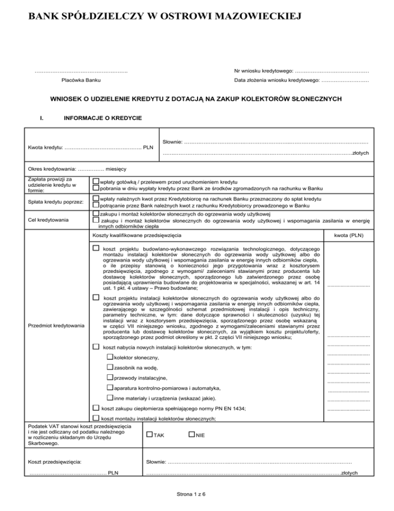 BANK SPÓŁDZIELCZY W OSTROWI MAZOWIECKIEJ …………………………………………….. Nr wniosku kredytowego: …………………………………… Placówka Banku Data złożenia wniosku kredytowego: ……………………… WNIOSEK O UDZIELENIE KREDYTU Z DOTACJĄ NA ZAKUP KOLEKTORÓW SŁONECZNYCH I. INFORMACJE O KREDYCIE Słownie: ……………………………..…………………….……………………………………… Kwota kredytu: …………….………………………. PLN ………………….………………………………..…………………………………………złotych Okres kredytowania: …………… miesięcy Zapłata prowizji za udzielenie kredytu w formie: wpłaty gotówką / przelewem przed uruchomieniem kredytu pobrania w dniu wypłaty kredytu przez Bank ze środków zgromadzonych na rachunku w Banku Spłata kredytu poprzez: wpłaty należnych kwot przez Kredytobiorcę na rachunek Banku przeznaczony do spłat kredytu potrącanie przez Bank należnych kwot z rachunku Kredytobiorcy prowadzonego w Banku Cel kredytowania zakupu i montaż kolektorów słonecznych do ogrzewania wody użytkowej zakupu i montaż kolektorów słonecznych do ogrzewania wody użytkowej i wspomagania zasilania w energię innych odbiorników ciepła Koszty kwalifikowane przedsięwzięcia kwota (PLN) koszt projektu budowlano-wykonawczego rozwiązania technologicznego, dotyczącego montażu instalacji kolektorów słonecznych do ogrzewania wody użytkowej albo do ogrzewania wody użytkowej i wspomagania zasilania w energię innych odbiorników ciepła, o ile przepisy stanowią o konieczności jego przygotowania wraz z kosztorysem przedsięwzięcia, zgodnego z wymogami/ zaleceniami stawianymi przez producenta lub dostawcę kolektorów słonecznych, sporządzonego lub zatwierdzonego przez osobę posiadającą uprawnienia budowlane do projektowania w specjalności, wskazanej w art. 14 ust. 1 pkt. 4 ustawy – Prawo budowlane; Przedmiot kredytowania koszt projektu instalacji kolektorów słonecznych do ogrzewania wody użytkowej albo do ogrzewania wody użytkowej i wspomagania zasilania w energię innych odbiorników ciepła, zawierającego w szczególności schemat przedmiotowej instalacji i opis techniczny, parametry techniczne, w tym: dane dotyczące sprawności i skuteczności (uzysku) tej instalacji wraz z kosztorysem przedsięwzięcia, sporządzonego przez osobę wskazaną w części VII niniejszego wniosku, zgodnego z wymogami/zaleceniami stawianymi przez producenta lub dostawcę kolektorów słonecznych, za wyjątkiem kosztu projektu/oferty, sporządzonego przez podmiot określony w pkt. 2 części VII niniejszego wniosku; koszt nabycia nowych instalacji kolektorów słonecznych, w tym: ............................. ............................. ............................. ............................. kolektor słoneczny, ............................. zasobnik na wodę, ............................. przewody instalacyjne, ............................. aparatura kontrolno-pomiarowa i automatyka, ............................ inne materiały i urządzenia (wskazać jakie). ............................. koszt zakupu ciepłomierza spełniającego normy PN EN 1434; ............................. koszt montażu instalacji kolektorów słonecznych; Podatek VAT stanowi koszt przedsięwzięcia i nie jest odliczany od podatku należnego w rozliczeniu składanym do Urzędu Skarbowego. TAK NIE Koszt przedsięwzięcia: Słownie: ……………………………..…………………….……………………………………… …………….………………………. PLN ………………….………………………………..……………………………………………złotych Strona 1 z 6 Adres przedsięwzięcia Typ nieruchomości: ………………….………………………………..……………………………………………………………….…………………… budynek mieszkalny budynek mieszkalny w budowie Deklarowany udział własny w finansowaniu przedsięwzięcia: ....................................................................................................……………… PLN słownie: ………………………………………………………………………………………………………………………………………………………złotych w formie: ……………………………………………………………………………………………………………………………………………………………… Tytuł prawny do nieruchomości Przewidywane terminy wykorzystania kredytu i wysokość poszczególnych transz: Własność / odrębna własność Dzierżawa Spółdzielcze własnościowe prawo do lokalu Inny: .................................................................................................. termin kwota kwota słownie 1) ................................................ .................................................... 2) ................................................ .................................................... 3) ................................................ .................................................... 4) ................................................ .................................................... 5) ................................................ .................................................... ......................................................................... ......................................................................... ......................................................................... ......................................................................... ......................................................................... ......................................................................... ...............................................................
