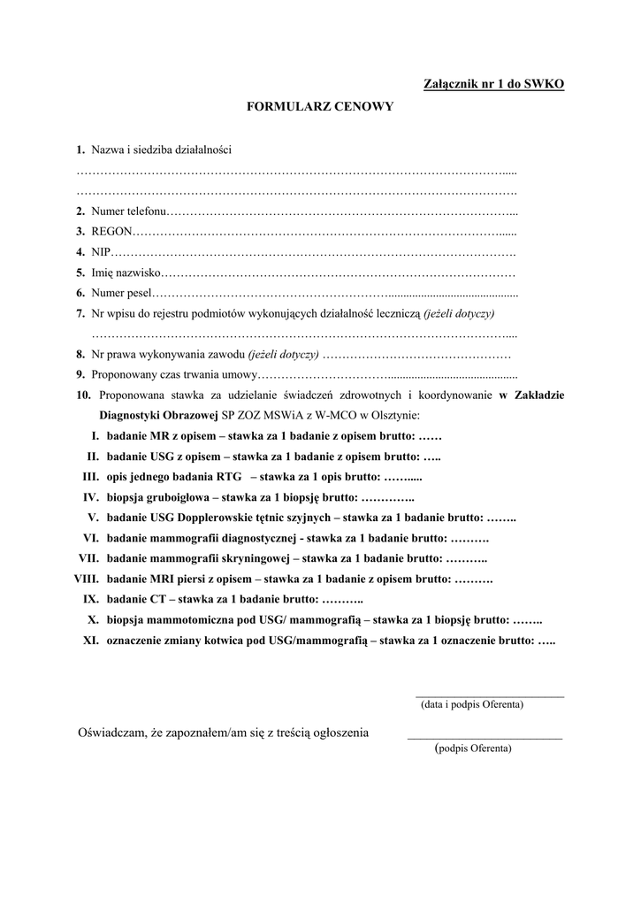 Załącznik nr 1 do SWKO FORMULARZ CENOWY 1. Nazwa i siedziba działalności ………………………………………………………………………………………………..... …………………………………………………………………………………………………. 2. Numer telefonu……………………………………………………………………………... 3. REGON…………………………………………………………………………………...... 4. NIP…………………………………………………………………………………………. 5. Imię nazwisko……………………………………………………………………………… 6. Numer pesel……………………………………………………............................................ 7. Nr wpisu do rejestru podmiotów wykonujących działalność leczniczą (jeżeli dotyczy) …………………………………………………………………………………………….... 8. Nr prawa wykonywania zawodu (jeżeli dotyczy) ………………………………………… 9. Proponowany czas trwania umowy……………………………............................................ 10. Proponowana stawka za udzielanie świadczeń zdrowotnych i koordynowanie w Zakładzie Diagnostyki Obrazowej SP ZOZ MSWiA z W-MCO w Olsztynie: I. badanie MR z opisem – stawka za 1 badanie z opisem brutto: …… II. badanie USG z opisem – stawka za 1 badanie z opisem brutto: ….. III. opis jednego badania RTG – stawka za 1 opis brutto: ……..... IV. biopsja gruboigłowa – stawka za 1 biopsję brutto: ………….. V. badanie USG Dopplerowskie tętnic szyjnych – stawka za 1 badanie brutto: …….. VI. badanie mammografii diagnostycznej - stawka za 1 badanie brutto: ………. VII. badanie mammografii skryningowej – stawka za 1 badanie brutto: ……….. VIII. badanie MRI piersi z opisem – stawka za 1 badanie z opisem brutto: ………. IX. badanie CT – stawka za 1 badanie brutto: ……….. X. biopsja mammotomiczna pod USG/ mammografią – stawka za 1 biopsję brutto: …….. XI. oznaczenie zmiany kotwica pod USG/mammografią – stawka za 1 oznaczenie brutto: ….. _______________________ (data i podpis Oferenta) Oświadczam, że zapoznałem/am się z treścią ogłoszenia ________________________ (podpis Oferenta)