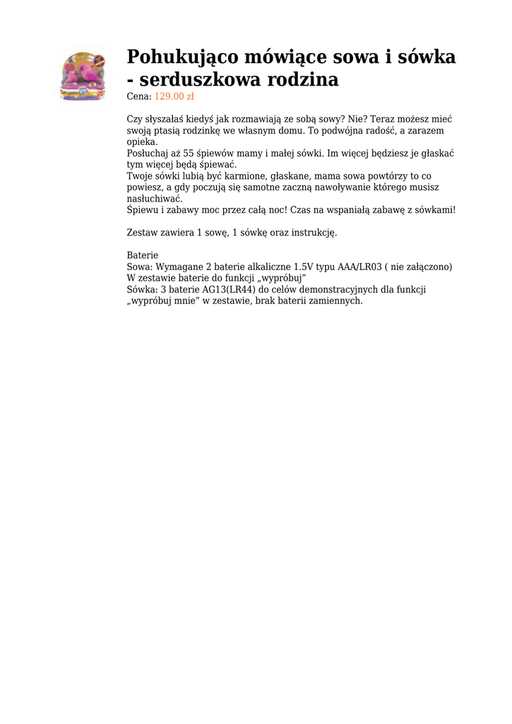 Pohukująco mówiące sowa i sówka - serduszkowa rodzina Cena: 129.00 zł Czy słyszałaś kiedyś jak rozmawiają ze sobą sowy? Nie? Teraz możesz mieć swoją ptasią rodzinkę we własnym domu. To podwójna radość, a zarazem opieka. Posłuchaj aż 55 śpiewów mamy i małej sówki. Im więcej będziesz je głaskać tym więcej będą śpiewać. Twoje sówki lubią być karmione, głaskane, mama sowa powtórzy to co powiesz, a gdy poczują się samotne zaczną nawoływanie którego musisz nasłuchiwać. Śpiewu i zabawy moc przez całą noc! Czas na wspaniałą zabawę z sówkami! Zestaw zawiera 1 sowę, 1 sówkę oraz instrukcję. Baterie Sowa: Wymagane 2 baterie alkaliczne 1.5V typu AAA/LR03 ( nie załączono) W zestawie baterie do funkcji „wypróbuj” Sówka: 3 baterie AG13(LR44) do celów demonstracyjnych dla funkcji „wypróbuj mnie” w zestawie, brak baterii zamiennych.