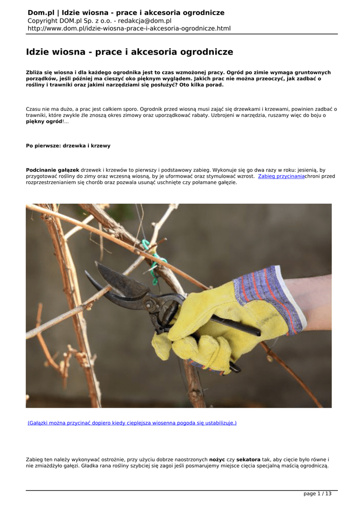 Dom.pl | Idzie wiosna - prace i akcesoria ogrodnicze Copyright DOM.pl Sp. z o.o. - [email protected] http://www.dom.pl/idzie-wiosna-prace-i-akcesoria-ogrodnicze.html Idzie wiosna - prace i akcesoria ogrodnicze Zbliża się wiosna i dla każdego ogrodnika jest to czas wzmożonej pracy. Ogród po zimie wymaga gruntownych porządków, jeśli później ma cieszyć oko pięknym wyglądem. Jakich prac nie można przeoczyć, jak zadbać o rośliny i trawniki oraz jakimi narzędziami się posłużyć? Oto kilka porad. Czasu nie ma dużo, a prac jest całkiem sporo. Ogrodnik przed wiosną musi zająć się drzewkami i krzewami, powinien zadbać o trawniki, które zwykle źle znoszą okres zimowy oraz uporządkować rabaty. Uzbrojeni w narzędzia, ruszamy więc do boju o piękny ogród!... Po pierwsze: drzewka i krzewy Podcinanie gałązek drzewek i krzewów to pierwszy i podstawowy zabieg. Wykonuje się go dwa razy w roku: jesienią, by przygotować rośliny do zimy oraz wczesną wiosną, by je uformować oraz stymulować wzrost. Zabieg przycinaniachroni przed rozprzestrzenianiem się chorób oraz pozwala usunąć uschnięte czy połamane gałęzie. (Gałązki można przycinać dopiero kiedy cieplejsza wiosenna pogoda się ustabilizuje.) Zabieg ten należy wykonywać ostrożnie, przy użyciu dobrze naostrzonych nożyc czy sekatora tak, aby cięcie było równe i nie zmiażdżyło gałęzi. Gładka rana rośliny szybciej się zagoi jeśli posmarujemy miejsce cięcia specjalną maścią ogrodniczą. page 1 / 13 Dom.pl | Idzie wiosna - prace i akcesoria ogrodnicze Copyright DOM.pl Sp. z o.o. - [email protected] http://www.dom.pl/idzie-wiosna-prace-i-akcesoria-ogrodnicze.html Maść ogrodnicza zapobiega także rozwijaniu się różnego rodzaju chorób, chroni też gałązkę przed nadmiernym wysuszeniem czy niską temperaturą. Zanim jednak zabierzemy się do podcinania drzewek i krzewów, trzeba uważnie śledzić prognozę pogody. Dopiero gdy wczesnowiosenna pogoda jest już stabilna, jest sucho i w miarę ciepło, możemy przystąpić do tego zabiegu. W innym przypadku, gdy po jego wykonaniu nastąpi zimna noc, nasze rośliny mogą ulec przemrożeniu w miejscu cięcia, a w efekcie przestać prawidłowo się rozwijać. Po drugie: trawniki Zobacz także: - Jak założyć piękny trawnik? - Jak założyć trawnik z rolki? Zimowe miesiące źle wpływają na nasze trawniki. Mróz uszkadza darń, powodując odrywanie się jej od gleby, zalegający śnieg z kolei sprzyja powstawaniu pleśni pośniegowej. Także odwiedziny kreta dadzą się naszemu trawnikowi we znaki, zarówno z powodu wielu tuneli pod powierzchnią ziemi, co może powodować zapadanie się gleby, jak i kopców, które z kolei wypychają page 2 / 13 Dom.pl | Idzie wiosna - prace i akcesoria ogrodnicze Copyright DOM.pl Sp. z o.o. - [email protected] http://www.dom.pl/idzie-wiosna-prace-i-akcesoria-ogrodnicze.html na zewnątrz ziemię i niszczą równą postać trawnika. Zaczynamy od usunięcia wszelkich pozostałości po zimie, czyli zeschniętych liści i gałązek, kamyków (które zawsze pojawiają się nie wiadomo skąd) oraz obumarłych resztek roślin, które często są siedliskiem różnych chorób. Zabiegu tego dokonujemy miotło-grabiami, najlepiej ruchem na krzyż, dzięki czemu dokładnie wymieciemy wszystko to, co trzeba usunąć. page 3 / 13 Dom.pl | Idzie wiosna - prace i akcesoria ogrodnicze Copyright DOM.pl Sp. z o.o. - [email protected] http://www.dom.pl/idzie-wiosna-prace-i-akcesoria-ogrodnicze.html Kolejny ważnym zabiegiem jest wertykulacja trawnika, czyli napowietrzenie oraz usunięcie mchu czy filcu, który po zimie może pokrywać trawnik. Wertykulator dzięki stalowym nożom nacina ziemię, usuwa chwasty i obumarłą trawę, nakłuwa też glebę, tym samym napowietrzając ją. Aby zbieg był jak najbardziej dokładny, warto przed nim skosić trawę najniżej, jak się da. Pozwoli to ostrzom wertykulatora na dokładniejsze oczyszczenie trawnika. page 4 / 13 Dom.pl | Idzie wiosna - prace i akcesoria ogrodnicze Copyright DOM.pl Sp. z o.o. - [email protected] http://www.dom.pl/idzie-wiosna-prace-i-akcesoria-ogrodnicze.html Sam zabieg warto wykonać w kratkę, to znaczy: najpierw zwertykulować trawnik w jednym kierunku, a później prostopadle. Po zabiegu trawnik może wyglądać co prawda na „zniszczony”, jest to jednak pozorne wrażenie. Wertykulacja pozostawia trawę silną i zdrową, która w niedługim czasie rozrośnie się i stworzy sprężysty, ładny i gęsty zielony dywan. Ostatnim zabiegiem, jaki powinniśmy przeprowadzić na naszym trawniku, jest nawożenie trawnika. Po wertykulacji zwłaszcza, może on wyglądać na dosyć zniszczony, jednak to tylko przejściowy stan. Wystarczy, że zaopatrzymy się w nawóz do trawników i rozrzucimy go na całej powierzchni. Po nawożeniu wystarczy tylko regularnie podlewać trawnik tak, aby stale był wilgotny. Jeszcze tylko w miejscach, gzie występuje ubytek trawy, powinniśmy ją dosiać i na wiosnę nasze oczy ucieszy piękny, zielony dywan. Po trzecie: rabaty i gleba Na początku powinniśmy starannie osłonić kiełkujące już rośliny tak, aby podczas porządkowania gleby ich nie uszkodzić. page 5 / 13 Dom.pl | Idzie wiosna - prace i akcesoria ogrodnicze Copyright DOM.pl Sp. z o.o. - [email protected] http://www.dom.pl/idzie-wiosna-prace-i-akcesoria-ogrodnicze.html Musimy usunąć wszelkie pozostałości na przykład po korze ogrodowej, kamyki, gałązki i resztki obumarłych roślin. Następnie, nawozimy glebę. Możemy użyć zakupionej mieszanki, bądź kompostu. Ważne jest, żeby wymieszać nawóz z ziemią delikatnie, tak aby nie uszkodzić korzeni rosnących już na rabacie roślin. (Starannie osłońmy kiełkujące już rośliny tak, aby podczas porządkowania gleby ich nie uszkodzić.) (Wertykulator elektrycznyk, który jest bardziej ekologiczny od spalinowego - polecanego do bardzo dużych powierzchni trawnikowych - oraz, co dla wielu może by