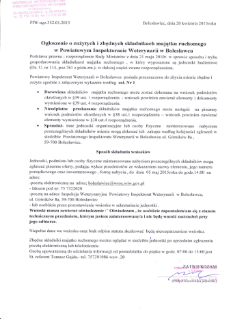 ogłoszenie o zuĘĘch i zbędnych składnikach majątku ruchomego