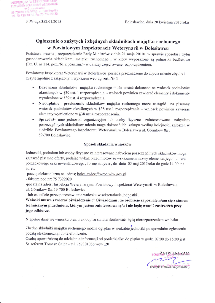-pocńą na adres: Inspekcja Weterynaryjna Powiatowy Inspektorat Weterynarii w Bolesławcu,