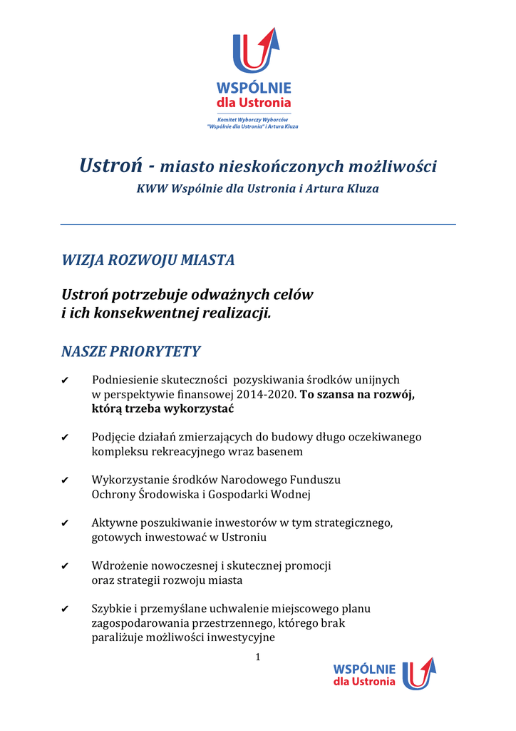 Ustroń -‐ miasto nieskończonych możliwości KWW Wspólnie dla Ustronia i Artura Kluza WIZJA ROZWOJU MIASTA Ustroń potrzebuje odważnych celów i ich konsekwentnej realizacji. NASZE PRIORYTETY ✔ ✔ ✔ ✔ ✔ ✔ Podniesienie skuteczności pozyskiwania środków unijnych w perspektywie finansowej 2014-‐2020. To szansa na rozwój, którą trzeba wykorzystać Podjęcie działań zmierzających do budowy długo oczekiwanego kompleksu rekreacyjnego wraz basenem Wykorzystanie środków Narodowego Funduszu Ochrony Środowiska i Gospodarki Wodnej Aktywne poszukiwanie inwestorów w tym strategicznego, gotowych inwestować w Ustroniu Wdrożenie nowoczesnej i skutecznej promocji oraz strategii rozwoju miasta Szybkie i przemyślane uchwalenie miejscowego planu zagospodarowania przestrzennego, którego brak paraliżuje możliwości inwestycyjne 1 USTROŃ DLA MIESZKAŃCÓW • Mieszkańcy powinni stać się partnerami władz samorządowych, dlatego proponujemy: -‐ Wprowadzenie budżetu obywatelskiego, czyli współdecydowania mieszkańców o realizacji inwestycji miejskich -‐ Spotkania z mieszkańcami i wprowadzenie rzetelnych konsultacji społecznych w tematach istotnych dla rozwoju miasta -‐ Ograniczenie wydatków administracyjnych, co pozwoli na wzrost nakładów inwestycyjnych -‐ Sesje Rady Miasta on-‐line – jawność podejmowanych decyzji dla wszystkich mieszkańców • Poprawa infrastruktury drogowej na terenie miasta -‐ Kontynuacja remontów dróg i chodników, budowa dróg dojazdowych do posesji wyżej położonych -‐ Podniesienie bezpieczeństwa dzieci w drodze do i ze szkoły -‐ Rozbudowa oświetlenia ulicznego -‐ Budowa nowych miejsc parkingowych • Uporządkowanie zagadnień wodno-‐kanalizacyjnych -‐ Kontynuacja rozbudowy sieci wodociągowej i kanalizacji sanitarnej. -‐ Stworzenie skutecznego system odprowadzenia wód deszczowych -‐ z terenów zagrożonych zalewaniem, przy wzmożonych opadach -‐ i nawałnicach. • Stworzenie atrakcyjnych warunków dla młodzieży -‐ Dokończenie przyszkolnych inwestycji -‐ Stworzenie w szkołach klas profilowanych -‐ Ożywienie kulturalne miasta przez organizację atrakcyjnych imprez masowych -‐ Podniesienie atrakcyjności sportowej miasta – organizacja imprez plenerowych z wykorzystaniem naturalnych walorów miasta • Poprawa jakości życia osób starszych -‐ Poprawa dostępu do specjalistycznej opieki lekarskiej -‐ Powstanie klubu seniora i oferty zajęć dziennych dla osób starszych umożliwiającej wspólne spędzanie czasu wolnego -‐ Karta seniora 60+, czyli pakiet zniżek oferowanych przez partnerów projektu • Program „przyjazny Ustroń” -‐ Stworzenie atrakcyjnych warunków życia dla mieszkańców miasta -‐ Zniżki dla mieszkańców na korzystanie z lokalnych atrakcji turystycznych, np. kolei na Czantorię, a w przyszłości z basenu -‐ Promocja miasta i zachęcanie do zamieszkania właśnie tutaj 2 USTROŃ DLA TURYSTÓW • Ustroń potrzebuje atrakcji -‐ Podjęcie konkretnych działań zmierzających do budowy kompleksu rekreacyjnego wraz basenem -‐ Aktywne poszukiwania inwestorów w celu stworzenia atrakcji turystycznych wyróżniających Ustroń i zapewniających ogólnokrajową, a może i europejską promocję. Takim wyróżnikiem mogłaby być jedyna wyjątkowa kolejka linowa rozciągnięta między górami • Uporządokowanie infrastruktury miasta -‐ Realizacja zamkniętego deptaka w centrum miasta -‐ Stworzenie przyjaznych warunków do rozwoju rynku gastronomicznego -‐ Zwiększenie ilości toalet publicznych • Różnorodna oferta kulturalna -‐ Organizacja wyjątkowej, charakterystycznej dla Ustroń-‐ dużej imprezy kulturalnej -‐ Lepsze wykorzystanie amfiteatru • Ustroń – miasto sportu -‐ Rozwój turystyki narciarskiej i rowerowej w Ustroniu -‐ Budowa skateparku i lodowiska -‐ Stworzenie z Czantorii nowoczesnego kompleksu sportowo-‐rekreacyjnego -‐ Wyznaczenie w Ustroniu zimowego placu zabaw dla dzieci -‐ Organizacja międzynarodowych imprez sportowych 3