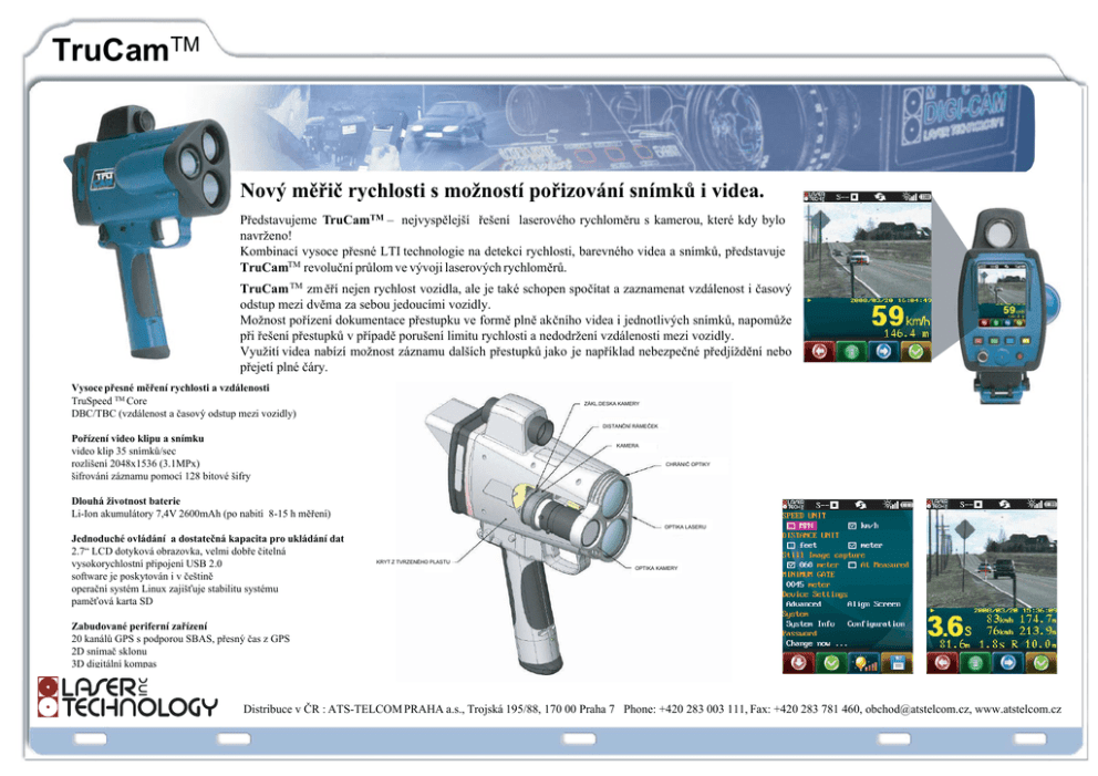 TruCamTM Nový měřič rychlosti s možností pořizování snímků i videa. Představujeme TruCamTM – nejvyspělejší řešení laserového rychloměru s kamerou, které kdy bylo navrženo! Kombinací vysoce přesné LTI technologie na detekci rychlosti, barevného videa a snímků, představuje TruCamTM revoluční průlom ve vývoji laserových rychloměrů. TruCam TM zm ěří nejen rychlost vozidla, ale je také schopen spočítat a zaznamenat vzdálenost i časový odstup mezi dvěma za sebou jedoucími vozidly. Možnost pořízení dokumentace přestupku ve formě plně akčního videa i jednotlivých snímků, napomůže při řešení přestupků v případě porušení limitu rychlosti a nedodržení vzdálenosti mezi vozidly. Využití videa nabízí možnost záznamu dalších přestupků jako je například nebezpečné předjíždění nebo přejetí plné čáry. Vysoce přesné měření rychlosti a vzdálenosti TruSpeed TM Core DBC/TBC (vzdálenost a časový odstup mezi vozidly) ZÁKL.DESKA KAMERY DISTANČNÍ RÁMEČEK Pořízení video klipu a snímku video klip 35 snímků/sec rozlišení 2048x1536 (3.1MPx) šifrování záznamu pomocí 128 bitové šifry KAMERA CHRÁNIČ OPTIKY Dlouhá životnost baterie Li-Ion akumulátory 7,4V 2600mAh (po nabití 8-15 h měření) OPTIKA LASERU Jednoduché ovládání a dostatečná kapacita pro ukládání dat 2.7“ LCD dotyková obrazovka, velmi dobře čitelná vysokorychlostní připojení USB 2.0 software je poskytován i v češtině operační systém Linux zajišťuje stabilitu systému paměťová karta SD KRYT Z TVRZENÉHO PLASTU OPTIKA KAMERY Zabudované periferní zařízení 20 kanálů GPS s podporou SBAS, přesný čas z GPS 2D snímač sklonu 3D digitální kompas Distribuce v ČR : ATS-TELCOM PRAHA a.s., Trojská 195/88, 170 00 Praha 7 Phone: +420 283 003 111, Fax: +420 283 781 460, [email protected], www.atstelcom.cz
