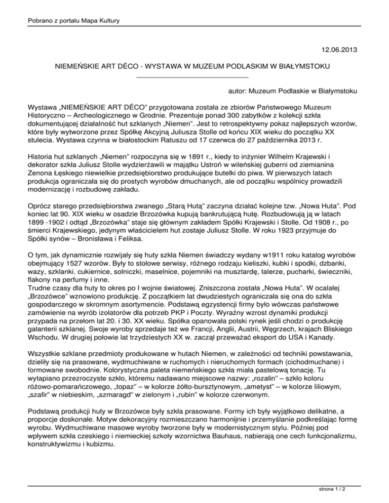 Pobrano z portalu Mapa Kultury 12.06.2013 NIEMEŃSKIE ART DÉCO - WYSTAWA W MUZEUM PODLASKIM W BIAŁYMSTOKU ____________________________ autor: Muzeum Podlaskie w Białymstoku Wystawa „NIEMEŃSKIE ART DÉCO” przygotowana została ze zbiorów Państwowego Muzeum Historyczno – Archeologicznego w Grodnie. Prezentuje ponad 300 zabytków z kolekcji szkła dokumentującej działalność hut szklanych „Niemen”. Jest to retrospektywny pokaz najlepszych wzorów, które były wytworzone przez Spółkę Akcyjną Juliusza Stolle od końcu XIX wieku do początku XX stulecia. Wystawa czynna w białostockim Ratuszu od 17 czerwca do 27 października 2013 r. Historia hut szklanych „Niemen” rozpoczyna się w 1891 r., kiedy to inżynier Wilhelm Krajewski i dekorator szkła Juliusz Stolle wydzierżawili w majątku Ustroń w wileńskiej guberni od ziemianina Zenona Łęskiego niewielkie przedsiębiorstwo produkujące butelki do piwa. W pierwszych latach produkcja ograniczała się do prostych wyrobów dmuchanych, ale od początku wspólnicy prowadzili modernizację i rozbudowę zakładu. Oprócz starego przedsiębiorstwa zwanego „Starą Hutą” zaczyna działać kolejne tzw. „Nowa Huta”. Pod koniec lat 90. XIX wieku w osadzie Brzozówka kupują bankrutującą hutę. Rozbudowują ją w latach 1899 -1902 i odtąd „Brzozówka” staje się głównym zakładem Spółki Krajewski i Stolle. Od 1908 r., po śmierci Krajewskiego, jedynym właścicielem hut zostaje Juliusz Stolle. W roku 1923 przyjmuje do Spółki synów – Bronisława i Feliksa. O tym, jak dynamicznie rozwijały się huty szkła Niemen świadczy wydany w1911 roku katalog wyrobów obejmujący 1527 wzorów. Były to stołowe serwisy, różnego rodzaju kieliszki, kubki i spodki, dzbanki, wazy, szklanki. cukiernice, solniczki, maselnice, pojemniki na musztardę, talerze, pucharki, świeczniki, flakony na perfumy i inne. Trudne czasy dla huty to okres po I wojnie światowej. Zniszczona została „Nowa Huta”. W ocalałej „Brzozówce” wznowiono produkcję. Z początkiem lat dwudziestych ograniczała się ona do szkła gospodarczego w skromnym asortymencie. Podstawą egzystencji firmy było wówczas państwowe zamówienie na wyrób izolatorów dla potrzeb PKP i Poczty. Wyraźny wzrost dynamiki produkcji przypada na przełom lat 20. i 30. XX wieku. Spółka opanowała polski rynek jeśli chodzi o produkcję galanterii szklanej. Swoje wyroby sprzedaje też we Francji, Anglii, Austrii, Węgrzech, krajach Bliskiego Wschodu. W drugiej połowie lat trzydziestych XX w. zaczął przeważać eksport do USA i Kanady. Wszystkie szklane przedmioty produkowane w hutach Niemen, w zależności od techniki powstawania, dzieliły się na prasowane, wydmuchiwane w ruchomych i nieruchomych formach (cichodmuchane) i formowane swobodnie. Kolorystyczna paleta niemeńskiego szkła miała pastelową tonację. Tu wytapiano przezroczyste szkło, któremu nadawano miejscowe nazwy: „rozalin” – szkło koloru różowo-pomarańczowego, „topaz” – w kolorze żółto-bursztynowym, „ametyst” – w kolorze liliowym, „szafir” w niebieskim, „szmaragd” w zielonym i „rubin” w kolorze czerwonym. Podstawą produkcji huty w Brzozówce były szkła prasowane. Formy ich były wyjątkowo delikatne, a proporcje doskonałe. Motyw dekoracyjny rozmieszczano harmonijnie i przemyślanie podkreślając formę wyrobu. Wydmuchiwane masowe wyroby tworzone były w modernistycznym stylu. Później pod wpływem szkła czeskiego i niemieckiej szkoły wzornictwa Bauhaus, nabierają one cech funkcjonalizmu, konstruktywizmu i kubizmu. strona 1 / 2 Pobrano z portalu Mapa Kultury Chociaż większość szklanych form tworzona była zgodnie z istniejącymi w sztuce stosowanej Zachodniej Europy stylami i trendami, niemeńskie szkło wyróżniało się motywami dekoracyjnymi i kolorystyką. To decydowało o dużym zainteresowaniu odbiorców i dziś sprawia, że niemeńskie szkło cenione jest na rynku antykwarycznym. strona 2 / 2
