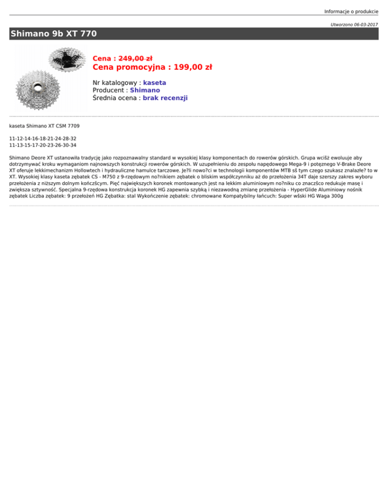 Informacje o produkcie Utworzono 06-03-2017 Shimano 9b XT 770 Cena : 249,00 zł Cena promocyjna : 199,00 zł Nr katalogowy : kaseta Producent : Shimano Średnia ocena : brak recenzji kaseta Shimano XT CSM 7709 11-12-14-16-18-21-24-28-32 11-13-15-17-20-23-26-30-34 Shimano Deore XT ustanowiła tradycję jako rozpoznawalny standard w wysokiej klasy komponentach do rowerów górskich. Grupa wcišż ewoluuje aby dotrzymywać kroku wymaganiom najnowszych konstrukcji rowerów górskich. W uzupełnieniu do zespołu napędowego Mega-9 i potęznego V-Brake Deore XT oferuje lekkimechanizm Hollowtech i hydrauliczne hamulce tarczowe. Je?li nowo?ci w technologii komponentów MTB sš tym czego szukasz znalazłe? to w XT. Wysokiej klasy kaseta zębatek CS - M750 z 9-rzędowym no?nikiem zębatek o bliskim współczynniku aż do przełożenia 34T daje szerszy zakres wyboru przełożenia z niższym dolnym kończšcym. Pięć największych koronek montowanych jest na lekkim aluminiowym no?niku co znaczšco redukuje masę i zwiększa sztywność. Specjalna 9-rzędowa konstrukcja koronek HG zapewnia szybką i niezawodną zmianę przełożenia - HyperGlide Aluminiowy nośnik zębatek Liczba zębatek: 9 przełożeń HG Zębatka: stal Wykończenie zębatek: chromowane Kompatybilny łańcuch: Super wšski HG Waga 300g