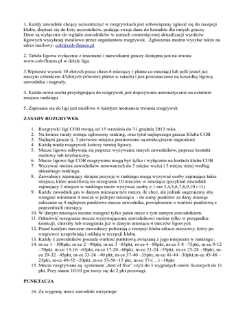 1. Każdy zawodnik chcący uczestniczyć w rozgrywkach jest zobowiązany zgłosić się do recepcji klubu, dopisać się do listy uczestników, podając swoje dane do kontaktu dla innych graczy. Dane są wyłącznie do wglądu zawodników w ramach comiesięcznej aktualizacji wyników ligowych wysyłanej meailowo przez organizatora rozgrywek. Zgłoszenia można wysyłać także na adres mailowy: [email protected] 2. Tabela ligowa wyłącznie z imionami i nazwiskami graczy dostępna jest na stronie www.cob-fitness.pl w dziale liga. 3.Wpisowe wynosi 10 złotych przez okres 6 miesięcy ( płatne co miesiąc) lub jeśli jesteś już naszym członkiem 45złotych (również płatne w ratach) i jest przeznaczone na koszulkę ligową zawodnika i nagrody. 4. Każda nowa osoba przystępująca do rozgrywek jest dopisywana automatycznie na ostatnim miejscu rankingu 5. Zapisanie się do ligi jest możliwe w każdym momencie trwania rozgrywek ZASADY ROZGRYWEK 1. 2. 3. 4. 5. Rozgrywki ligi COB trwają od 15 września do 31 grudnia 2013 roku. Na koniec rundy zostaje ogłoszony ranking, oraz tytuł najlepszego gracza Klubu COB Najlepsi gracze tj. 3 pierwsze miejsca premiowane są atrakcyjnymi nagrodami Każdą rundę rozgrywek kończy turniej ligowy. Mecze ligowe odbywają się poprzez wyzywanie innych zawodników, poprzez kontakt mailowy lub telefoniczny. 6. Mecze ligowe ligi COB rozgrywane mogą być tylko i wyłącznie na kortach klubu COB 7. Wyzywać można zawodników notowanych do 5 miejsc wyżej i 5 miejsc niżej według aktualnego rankingu. 8. Zawodnicy zajmujący skrajne pozycje w rankingu mogą wyzywać osoby zajmujące takie miejsca, które umożliwią im rozegranie 10 meczów w miesiącu (przykład zawodnik zajmujący 2 miejsce w rankingu może wyzywać osoby z 1 raz 3,4,5,6,7,8,9,10 i 11) 9. Każdy zawodnik gra w danym miesiącu tyle meczy ile chce, ale jednak sugerujemy aby rozegrać minimum 4 mecze w jednym miesiącu - do sumy punktów za dany miesiąc zaliczane są 4 najlepsze punktowe mecze zawodnika, powiększone o wartość punktową z poprzednich miesięcy. 10. W danym miesiącu można rozegrać tylko jeden mecz z tym samym zawodnikiem. 11. Odmówić rozegrania meczu wyzywającemu zawodnikowi można tylko w przypadku: kontuzji, choroby lub rozegrania już w danym miesiącu 4 meczów ligowych. 12. Przed każdym meczem zawodnicy pobierają z recepcji klubu arkusz meczowy, który po rozgrywce uzupełniają i oddają w recepcji klubu. 13. Każdy z zawodników posiada wartość punktową związaną z jego miejscem w rankingu : 14. m-ce 1 –100pkt, m-ce 2 –90pkt, m-ce 3 –85pkt, m-ce 4 –80pkt, m-ce 5-8 –75pkt, m-ce 9-12 –70pkt, m-ce 13-16 –65pkt, m-ce 17-20 –60pkt, m-ce 21-24 –55pkt, m-ce 25-28 –50pkt, mce 29-32 –45pkt, m-ce 33-36 –40 pkt, m-ce 37-40 –35pkt, m-ce 41-44 –30pkt,m-ce 45-48 – 25pkt, m-ce 49-52 –20pkt, m-ce 53-56 -15 pkt, m-ce 57-(…) –10pkt 15. Mecze rozgrywane są systemem „best of five” czyli do 3 wygranych setów liczonych do 11 pkt. Przy stanie 10:10 gra toczy się do 2 pkt przewagi. PUNKTACJA 16. Za wygrany mecz zawodnik otrzymuje: - 100% wartości punktowej przeciwnika – w przypadku gdy mecz zakończy się 3:0 - 80% wartości punktowej przeciwnika – w przypadku gdy mecz zakończyć się 3:1 - 60 % wartości punktowej przeciwnika – w przypadku gdy mecz zakończy się 3:2 17. Zawodnik pokonany nie otrzymuje punktów. 18. Osoby, które nie rozegrają przez okres 2 miesięcy żadnego meczu nie informując organizatora o przyczynie będą wykreślane z listy graczy NAGRODY 19. Organizator przewiduje nagrody dla: - osoby, która rozegra największą liczbę meczy w rundzie, - osoby, która wygrała największą ilość meczy w stosunku 3:0