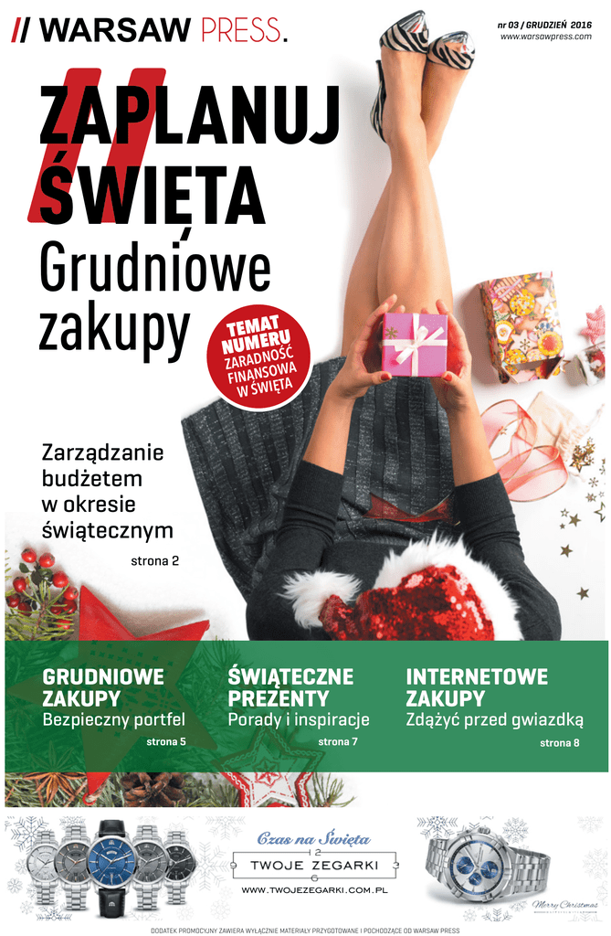 nr 03 / GRUDZIEŃ 2016 www.warsawpress.com ZAPLANUJ ŚWIĘTA Grudniowe zakupy TEMARTU NUME OŚĆ ZARADNOWA FINANS ĘTA W ŚWI Zarządzanie budżetem w okresie świątecznym strona 2 GRUDNIOWE ZAKUPY Bezpieczny portfel strona 5 ŚWIĄTECZNE PREZENTY Porady i inspiracje INTERNETOWE ZAKUPY Zdążyć przed gwiazdką strona 7 Czas na Święta www.twojezegarki.com.pl DODATEK PROMOCYJNY ZAWIERA WYŁĄCZNIE MATERIAŁY PRZYGOTOWANE I POCHODZĄCE OD WARSAW PRESS strona 8 2 ZARADNOŚĆ FINANSOWA W OKRESIE ŚWIĄTECZNYM Koniec roku, to zawsze czas bardzo intensywny. Zastanawiamy się jak przygotować się do świąt Bożego Narodzenia, co ofiarować najbliższym. Często pojawia się dylemat: zdecydować się na klimat czy praktyczność? Warto jest to rozważyć, zwłaszcza pod kątem domowego budżetu. Mateusz Autor bloga ZaradnyFinansowo.pl o oszczędzaniu, inwestowaniu i zarabianiu pieniędzy, oraz o skutecznym prowadzeniu budżetu domowego. Na blogu promuje rozsądne podejście do tematu finansów osobistych gdy zamówiony przedmiot do nas, z różnych „atmosfery”, niezbędne są gruntowne porządki. przyczyn, nie dotrze, skorzystanie z procedury Co zrobić, gdy nie mamy na nie czasu, bądź chargeback. gdy po prostu ich nie lubimy? Może warto zleŚwięta nieodzownie kojarzą się z podniosłą at- cić te prace innym? mosferą, spotkaniami z najbliższymi i… z wieloma godzinami spędzonymi w kuchni. Jak zwy- Najpopularniejszą usługą jest sprzątanie domu, 4 kle do zrobienia są mięsa, ciasta, sałatki, ryby, może mieć różny zakres – od odkurzania, przez pierogi… czy można je przygotować w jeden mycie podłóg, po podlewanie kwiatów. Możemy Uwaga na magię cen – promocje i rabaty dzień? Pamiętaj, że zanim zaczniesz gotować, też zamówić sobie wypranie dywanów, mycie spotkamy na każdym kroku. Warto jednak pamusisz jeszcze kupić wszystkie produkty, a to okien itd. Czy jest to opłacalne? To oczywiście miętać, że handlowcy żonglują cenami w taki wymaga czasu i cierpliwości. Domowe jedzenie kwestia indywidualna – płacimy nie tylko za wysposób, abyśmy zawsze mieli wrażenie, że płapodobno zawsze smakuje najlepiej, ale może konaną pracę, ale też za czas jaki oszczędzamy. cimy mniej niż w rzeczywistości. Jak się oprzeć warto jednak skorzystać z pomocy fachowców? „atrakcyjnej ofercie”? Przed zakupami ustal, ile Oto zalety świątecznej garmażerki: chcesz wydać i nie przekraczaj tej kwoty pod Osoby sprzątające mogą rozliczać się z nami żadnym pozorem. za godzinę pracy (15-20 zł), albo za wykonanie konkretnych zadań. Ta druga opcja jest chyba dla nas korzystniejsza, bo mamy pewność, że nikt nas nie naciąga. Kompleksowe posprząZACHĘCAM DO ROBIENIA ŚWIĄTECZNYCH ZAKUPÓW tanie 50 – metrowego mieszkania będzie nas kosztowało około 100-120 zł, często już z przePREZENTOWYCH W INTERNECIE. JEST TO SPOSÓB NA tarciem okien i trzepaniem dywanów. który już od listopada pojawia się w centrach handlowych, ma nas skłonić do zakupów, zazwyczaj większych niż te o których myśleliśmy. Spróbuj się oprzeć „marketingowym sztuczkom”. UNIKNIĘCIE KOLEJEK I OSZCZĘDNOŚĆ CZASU, ALE TAKŻE ZARADNOŚĆ FINANSOWA, BO W SIECI ZWYKLE KUPUJEMY TANIEJ – SMART SHOPPING W PRAKTYCZNYM WYDANIU. Zacznijmy od świątecznych zakupów: jak ich dokonać? Czym się kierować podczas wyboru upominków? Jakich zasad warto przestrzegać 5 i na co uważać podczas wizyt w centrach handlowych? 3 za 2? – trik stary jak świat, który jest niestety bardzo skuteczny. W święta kupujemy zdecydowanie więcej, dlatego sieci handlowe, niczym 1 dobre duszki, starają się nam pomóc w zroNie rób zakupów w weekend i po południu – bieniu zapasów. Tylko…. Czy jest to faktycznie zaplanuj dzień urlopu na załatwienie wszystkich oszczędność? Nasz mózg ma naturalną skłonprzedświątecznych sprawunków. W weekend, w ność do doceniania rzeczy większych. Jednak, galeriach handlowych kumuluje się największa pomyśl co się bardziej opłaca: zakup 6 takich grupa klientów, to potęguje zmęczenie i spra- samych przedmiotów za 6 złotych, czy 3 za 3 wia, że jesteśmy bardziej podatni na dokonywa- złote? nie nieprzemyślanych zakupów, czujemy presję Osobiście zachęcam do robienia świątecznych i ulegamy pośpiechowi. zakupów prezentowych w Internecie. Jest to sposób na uniknięcie kolejek i oszczędność 2 czasu, ale także zaradność finansowa, bo w Poświęć więcej czasu na zakupy – jeśli planu- sieci zwykle kupujemy taniej – smart shopping jesz kupić prezenty dla bliskich, znajdź na to w praktycznym wydaniu. Istotne jest również czas i zaplanuj co chcesz kupić. Ułatwi to wy- prawo do 14-dniowego – od momentu dostarbór i nie będziesz się rozpraszać myśleniem w czenia - zwrotu towaru, który kupiliśmy w Interstyczniu: „Może zajrzę jeszcze tu, bo są tu fajne necie. rzeczy i coś wybiorę”. W kwestii świątecznych zakupów on-line dobrą praktyką jest także płacenie za zakupy w sieci 3 kartą kredytową lub płatniczą z opcją płatnoBądź asertywny – muzyka, zapachy, wystrój ści internetowych. Umożliwi nam to, w sytuacji, PARTNERZY STRATEGICZNI oszczędność czasu – można go spożytkować na inne zajęcia; czystość i porządek – nie będziemy musieli sprzątać po gotowaniu; pewność dobrego smaku – skorzystanie z sprawdzonej firmy cateringowej albo restauracji. Gotowe potrawy są droższe od tych, które przygotowywanych samodzielnie. Oszczędności nie są jednak – moim zdaniem – aż tak spektakularne. Z analizy podstawowych cateringów, można wywnioskować, że dopłata to około 70100 zł. Warto też podkreślić ogromną oszczędność czasu, gdyż po ustaleniu menu jedynym wysiłkiem jest przywiezienie wszystkiego do domu i późniejsze odgrzanie, przed podaniem gościom. Koniec roku, to też czas kiedy możemy wykazać się finansową zaradnością, nie tylko w kont