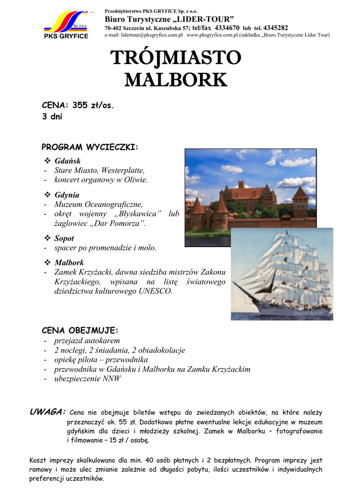 Przedsiębiorstwo PKS GRYFICE Sp. z o.o. Biuro Turystyczne „LIDER-TOUR” 70-402 Szczecin ul. Kaszubska 57; tel/fax 4334670 lub tel. 4345282 e-mail: [email protected] www.pksgryfice.com.pl (zakładka „Biuro Turystyczne Lider Tour) TRÓJMIASTO MALBORK CENA: 355 zł/os. 3 dni PROGRAM WYCIECZKI:  Gdańsk - Stare Miasto, Westerplatte, - koncert organowy w Oliwie.  Gdynia - Muzeum Oceanograficzne, - okręt wojenny „Błyskawica” lub żaglowiec „Dar Pomorza”.  Sopot - spacer po promenadzie i molo.  Malbork - Zamek Krzyżacki, dawna siedziba mistrzów Zakonu Krzyżackiego, wpisana na listę światowego dziedzictwa kulturowego UNESCO. CENA OBEJMUJE: - przejazd autokarem - 2 noclegi, 2 śniadania, 2 obiadokolacje - opiekę pilota – przewodnika - przewodnika w Gdańsku i Malborku na Zamku Krzyżackim - ubezpieczenie NNW UWAGA: Cena nie obejmuje biletów wstępu do zwiedzanych obiektów, na które należy przeznaczyć ok. 55 zł. Dodatkowo płatne ewentualne lekcje edukacyjne w muzeum gdyńskim dla dzieci i młodzieży szkolnej. Zamek w Malborku – fotografowanie i filmowanie – 15 zł / osobę. Koszt imprezy skalkulowano dla min. 40 osób płatnych i 2 bezpłatnych. Program imprezy jest ramowy i może ulec zmianie zależnie od długości pobytu, ilości uczestników i indywidualnych preferencji uczestników.