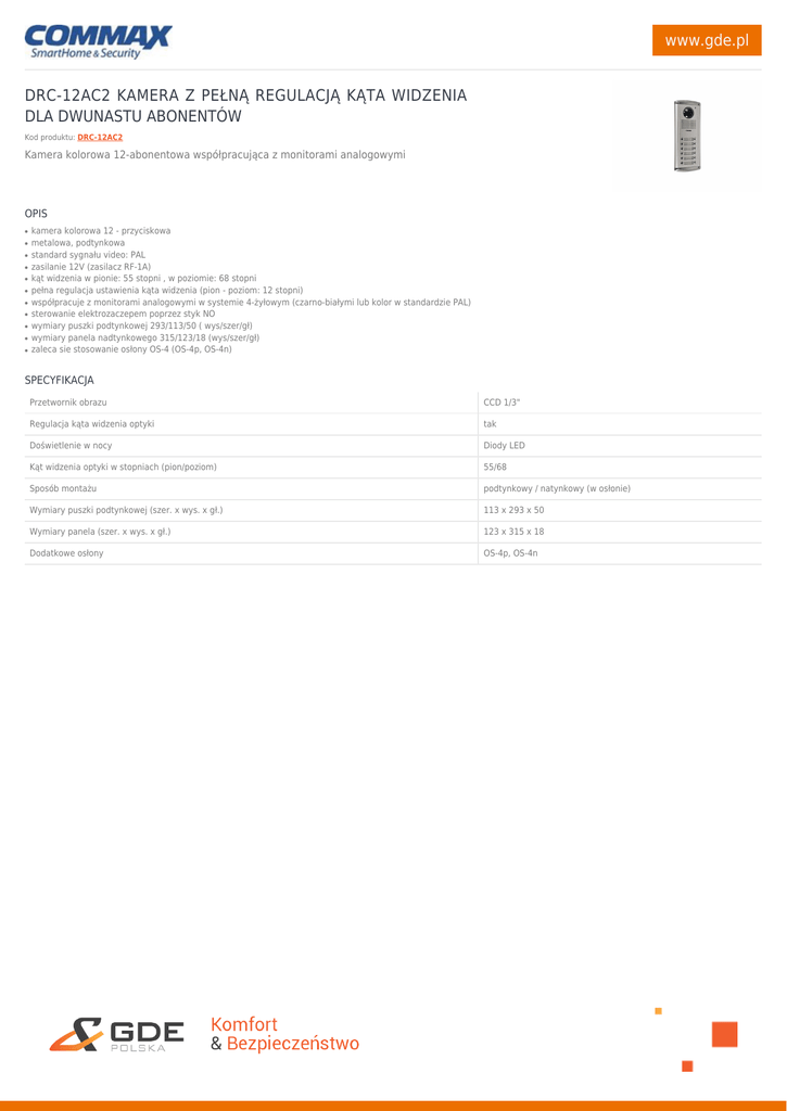 www.gde.pl DRC-12AC2 KAMERA Z PEŁNĄ REGULACJĄ KĄTA WIDZENIA DLA DWUNASTU ABONENTÓW Kod produktu: DRC-12AC2 Kamera kolorowa 12-abonentowa współpracująca z monitorami analogowymi OPIS ● ● ● ● ● ● ● ● ● ● ● kamera kolorowa 12 - przyciskowa metalowa, podtynkowa standard sygnału video: PAL zasilanie 12V (zasilacz RF-1A) kąt widzenia w pionie: 55 stopni , w poziomie: 68 stopni pełna regulacja ustawienia kąta widzenia (pion - poziom: 12 stopni) współpracuje z monitorami analogowymi w systemie 4-żyłowym (czarno-białymi lub kolor w standardzie PAL) sterowanie elektrozaczepem poprzez styk NO wymiary puszki podtynkowej 293/113/50 ( wys/szer/gł) wymiary panela nadtynkowego 315/123/18 (wys/szer/gł) zaleca sie stosowanie osłony OS-4 (OS-4p, OS-4n) SPECYFIKACJA Przetwornik obrazu CCD 1/3" Regulacja kąta widzenia optyki tak Doświetlenie w nocy Diody LED Kąt widzenia optyki w stopniach (pion/poziom) 55/68 Sposób montażu podtynkowy / natynkowy (w osłonie) Wymiary puszki podtynkowej (szer. x wys. x gł.) 113 x 293 x 50 Wymiary panela (szer. x wys. x gł.) 123 x 315 x 18 Dodatkowe osłony OS-4p, OS-4n