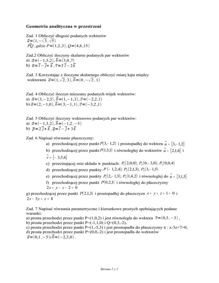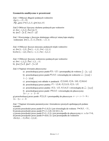Geometria analityczna w przestrzeni Zad. 1 Obliczyć długość podanych wektorów a =(1,−√ 3 , √ 5) ⃗ ⃗ , gdzie P=(1,2 ,3), Q=(4,6 ,15) PQ Zad.2 Obliczyć iloczyny skalarne podanych par wektorów a) ⃗ a =(−1,5,2), ⃗ b=(3,0 ,7) b) ⃗ u =⃗i −⃗j+ ⃗ k ,⃗ v =3 ⃗i −2 ⃗ k Zad. 3 Korzystając z iloczynu skalarnego obliczyć miarę kąta między wektorami ⃗ a =(1, √ 2 , 3), ⃗ b=(0 ,−√ 2 , 1) Zad. 4 Obliczyć iloczyn mieszany podanych trójek wektorów: a) ⃗ a =(3,−2,5) , ⃗ b=(1,−1,3) ,⃗ c =(−2,2 ,1) ⃗ b) ⃗ a =(2,−1,0) , b=(3,−1, 1) ,⃗ c =(−3,2 ,1) Zad. 5 Obliczyć iloczyny wektorowe podanych par wektorów: a) ⃗ a =(−1,3,2), ⃗ b=(−1,2 ,−5) b) ⃗ p =2 ⃗j+ ⃗ k ,⃗ q=⃗i −⃗j+ 3 ⃗ k Zad. 6 Napisać równanie płaszczyzny: a) przechodzącej przez punkt P( 3,− 1,2) i prostopadłej do wektora u = [ 3,− 1,2] b) przechodzącej przez punkt P(1,5,1) i równoległej do wektorów u = [ 2,1,6] i v = [ − 3,5,6] c) przecinającej osie układu w punktach: P1 ( 2,0,0 ) ; P2 ( 0,− 3,0 ); P3 ( 0,0,4 ) d) przechodzącej przez punkty: P ( − 1,2,4) ; P2 ( 2,1,3) ; P3 ( 3,− 1,5) e) przechodzącej przez punkty P1 ( 2,− 1,3) ; P2 (1,4,2 ) i równoległej do u = [ 3,1,5] f) przechodzącej przez punkt P( 0,2,1) i równoległej do płaszczyzny 2x + y − z − 2 = 0 g) przechodzącej przez punkt P( 2,1,3) i prostopadłej do płaszczyzn x + y + z + 1 = 0 i 2x − 3y + z = 8 Zad. 7 Napisać równania parametryczne i kierunkowe prostych spełniających podane warunki: v =(0,5 ,−3) , a) prosta przechodzi przez punkt P=(1,0,2) i jest równoległa do wektora ⃗ b) prosta przechodzi przez punkt P=(-1,1,0) i Q=(0,3,-2), c) prosta przechodzi przez punkt P=(1,-5,3) i jest prostopadła do płaszczyzny π : x-3z+7=0, d) prosta przechodzi przez punkt P=(0,0,-2) i jest prostopadła do wektorów a =(0,1 ,−5)i ⃗ ⃗ b=(−2,3,0) . Strona 1 z 1