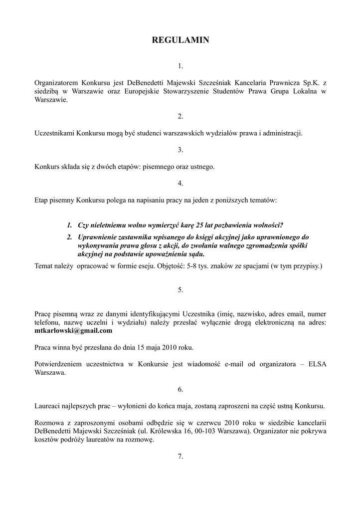REGULAMIN 1. Organizatorem Konkursu jest DeBenedetti Majewski Szcześniak Kancelaria Prawnicza Sp.K. z siedzibą w Warszawie oraz Europejskie Stowarzyszenie Studentów Prawa Grupa Lokalna w Warszawie. 2. Uczestnikami Konkursu mogą być studenci warszawskich wydziałów prawa i administracji. 3. Konkurs składa się z dwóch etapów: pisemnego oraz ustnego. 4. Etap pisemny Konkursu polega na napisaniu pracy na jeden z poniższych tematów: 1. Czy nieletniemu wolno wymierzyć karę 25 lat pozbawienia wolności? 2. Uprawnienie zastawnika wpisanego do księgi akcyjnej jako uprawnionego do wykonywania prawa głosu z akcji, do zwołania walnego zgromadzenia spółki akcyjnej na podstawie upoważnienia sądu. Temat należy opracować w formie eseju. Objętość: 5-8 tys. znaków ze spacjami (w tym przypisy.) 5. Pracę pisemną wraz ze danymi identyfikującymi Uczestnika (imię, nazwisko, adres email, numer telefonu, nazwę uczelni i wydziału) należy przesłać wyłącznie drogą elektroniczną na adres: [email protected] Praca winna być przesłana do dnia 15 maja 2010 roku. Potwierdzeniem uczestnictwa w Konkursie jest wiadomość e-mail od organizatora – ELSA Warszawa. 6. Laureaci najlepszych prac – wyłonieni do końca maja, zostaną zaproszeni na część ustną Konkursu. Rozmowa z zaproszonymi osobami odbędzie się w czerwcu 2010 roku w siedzibie kancelarii DeBenedetti Majewski Szcześniak (ul. Królewska 16, 00-103 Warszawa). Organizator nie pokrywa kosztów podróży laureatów na rozmowę. 7. Członkami Jury w etapie pisemnym są pracownicy naukowi warszawskich uczelni. Członkami Jury w etapie ustnym kancelarię DeBenedetti Majewski Szcześniak. są osoby wskazane przez 8. Jury na każdym etapie konkursu, tj. pisemnym oraz ustnym, ocenia pracę m.in. na podstawie znajomości prawa i twórczego myślenia piszącego, przywoływanych argumentów z orzecznictwa i komentarzy, a zarazem uwzględniając sztukę swobodnego i poprawnego wyrażania myśli w formie pisemnej oraz kreatywnego myślenia. 9. Nagrodą w Konkursie jest płatny staż w kancelarii DeBenedetti Majewski Szcześniak z siedzibą w Warszawie. 10. Staż jest miesięczny – dokładny termin stażu zostanie uzgodniony pomiędzy Laureatem a Organizatorem Konkursu - kancelarią DeBenedetti Majewski Szcześniak. 11. Staż odbywa się w miesiąca letnich: lipiec, sierpień albo wrzesień 2010 roku. 12. Wszelkie wątpliwości wynikające z wykładni regulaminu rozstrzygają Organizatorzy Konkursu.