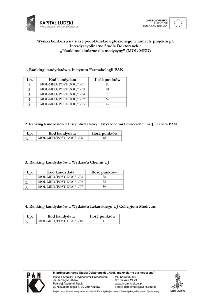 Wyniki konkursu na staże podoktorskie ogłoszonego w ramach projektu pt. Interdyscyplinarne Studia Doktoranckie „Nauki molekularne dla medycyny” (MOL-MED) 1. Ranking kandydatów z Instytutu Farmakologii PAN Lp. 1. 2. 3. 4. 5. Kod kandydata Ilość punktów MOL-MED/POST-DOC/1/01 MOL-MED/POST-DOC/1/03 MOL-MED/POST-DOC/1/04 MOL-MED/POST-DOC/1/02 MOL-MED/POST-DOC/1/05 90 81 70 62 47 2. Ranking kandydatów z Instytutu Katalizy i Fizykochemii Powierzchni im. J. Habera PAN Lp. 1. Kod kandydata MOL-MED/POST-DOC/1/06 Ilość punktów 88 3. Ranking kandydatów z Wydziału Chemii UJ Lp. 1. 2. 3. Kod kandydata Ilość punktów MOL-MED/POST-DOC/1/08 MOL-MED/POST-DOC/1/09 MOL-MED/POST-DOC/1/07 78 75 59 4. Ranking kandydatów z Wydziału Lekarskiego UJ Collegium Medicum Lp. 1. Kod kandydata Ilość punktów MOL-MED/POST-DOC/1/10 71 Interdyscyplinarne Studia Doktoranckie „Nauki molekularne dla medycyny” Instytut Katalizy i Fizykochemii Powierzchni im. Jerzego Habera Polskiej Akademii Nauk ul. Niezapominajek 8, 30-239 Kraków tel. 12 63 95 100 fax. 12 425 19 23 www.ik-pan.krakow.pl e-mail: [email protected] Projekt współfinansowany ze środków Unii Europejskiej w ramach Europejskiego Funduszu Społecznego