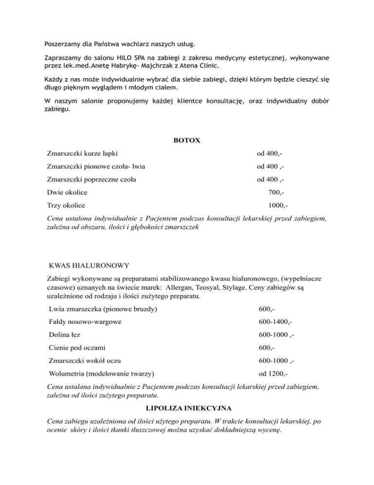 Poszerzamy dla Państwa wachlarz naszych usług. Zapraszamy do salonu HILO SPA na zabiegi z zakresu medycyny estetycznej, wykonywane przez lek.med.Anetę Habrykę- Majchrzak z Atena Clinic. Każdy z nas może indywidualnie wybrać dla siebie zabiegi, dzięki którym będzie cieszyć się długo pięknym wyglądem i młodym ciałem. W naszym salonie proponujemy każdej klientce konsultację, oraz indywidualny dobór zabiegu. BOTOX Zmarszczki kurze łapki od 400,- Zmarszczki pionowe czoła- lwia od 400 ,- Zmarszczki poprzeczne czoła od 400 ,- Dwie okolice 700,- Trzy okolice 1000,- Cena ustalona indywidualnie z Pacjentem podczas konsultacji lekarskiej przed zabiegiem, zależna od obszaru, ilości i głębokości zmarszczek KWAS HIALURONOWY Zabiegi wykonywane są preparatami stabilizowanego kwasu hialuronowego, (wypełniacze czasowe) uznanych na świecie marek: Allergan, Teosyal, Stylage. Ceny zabiegów są uzależnione od rodzaju i ilości zużytego preparatu. Lwia zmarszczka (pionowe bruzdy) 600,- Fałdy nosowo-wargowe 600-1400,- Dolina łez 600-1000 ,- Cienie pod oczami 600,- Zmarszczki wokół oczu 600-1000 ,- Wolumetria (modelowanie twarzy) od 1200,- Cena ustalana indywidualnie z Pacjentem podczas konsultacji lekarskiej przed zabiegiem, zależna od ilości zużytego preparatu. LIPOLIZA INIEKCYJNA Cena zabiegu uzależniona od ilości użytego preparatu. W trakcie konsultacji lekarskiej, po ocenie skóry i ilości tkanki tłuszczowej można uzyskać dokładniejszą wycenę. Podbródek 300 ,- Brzuch od 300 ,- „Bryczesy” od 500 ,- „Boczki” od 500 ,- Cena 1 apmułki Aqualyxu 300,- MEZOTERAPIA Cena zależna od rodzaju preparatu twarz od 400 ,- szyja od 300,- dekolt od 300,- twarz+ szyja od 500 ,- twarz+szyja+dekolt od 600,- cellulit od 300,- skóra głowy od 200 ,- mezoterapia oczu od 200 ,- MODELOWANIE UST modelowanie ust 600- 1200,- opadające kąciki ust 600,- zmarszczki palacza (wokół ust) 600-1000,-