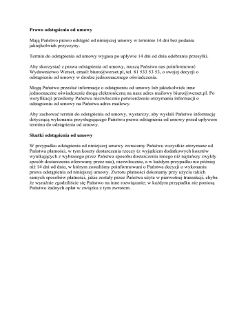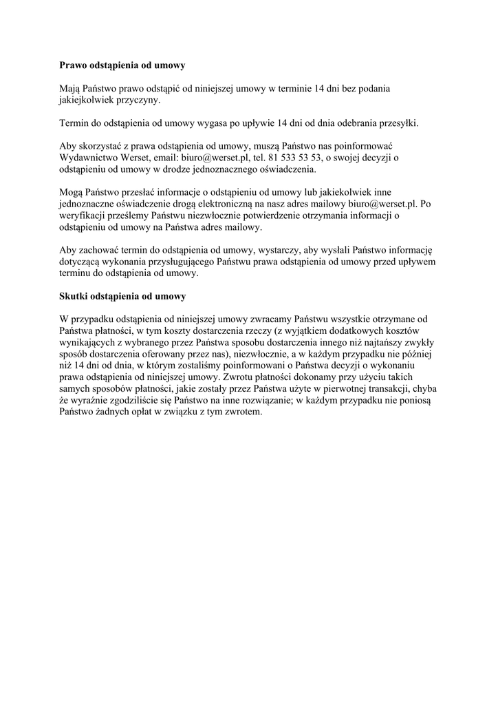 Prawo odstąpienia od umowy Mają Państwo prawo odstąpić od niniejszej umowy w terminie 14 dni bez podania jakiejkolwiek przyczyny. Termin do odstąpienia od umowy wygasa po upływie 14 dni od dnia odebrania przesyłki. Aby skorzystać z prawa odstąpienia od umowy, muszą Państwo nas poinformować Wydawnictwo Werset, email: [email protected], tel. 81 533 53 53, o swojej decyzji o odstąpieniu od umowy w drodze jednoznacznego oświadczenia. Mogą Państwo przesłać informacje o odstąpieniu od umowy lub jakiekolwiek inne jednoznaczne oświadczenie drogą elektroniczną na nasz adres mailowy [email protected]. Po weryfikacji prześlemy Państwu niezwłocznie potwierdzenie otrzymania informacji o odstąpieniu od umowy na Państwa adres mailowy. Aby zachować termin do odstąpienia od umowy, wystarczy, aby wysłali Państwo informację dotyczącą wykonania przysługującego Państwu prawa odstąpienia od umowy przed upływem terminu do odstąpienia od umowy. Skutki odstąpienia od umowy W przypadku odstąpienia od niniejszej umowy zwracamy Państwu wszystkie otrzymane od Państwa płatności, w tym koszty dostarczenia rzeczy (z wyjątkiem dodatkowych kosztów wynikających z wybranego przez Państwa sposobu dostarczenia innego niż najtańszy zwykły sposób dostarczenia oferowany przez nas), niezwłocznie, a w każdym przypadku nie później niż 14 dni od dnia, w którym zostaliśmy poinformowani o Państwa decyzji o wykonaniu prawa odstąpienia od niniejszej umowy. Zwrotu płatności dokonamy przy użyciu takich samych sposobów płatności, jakie zostały przez Państwa użyte w pierwotnej transakcji, chyba że wyraźnie zgodziliście się Państwo na inne rozwiązanie; w każdym przypadku nie poniosą Państwo żadnych opłat w związku z tym zwrotem.