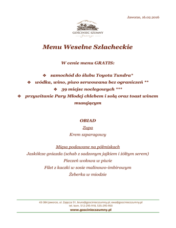 Jaworze, 16.02.2016 Menu Weselne Szlacheckie W cenie menu GRATIS: samochód do ślubu Toyota Tundra* wódka, wino, piwo serwowana bez ograniczeń ** 39 miejsc noclegowych *** przywitanie Pary Młodej chlebem i solą oraz toast winem musującym OBIAD Zupa Krem szparagowy Mięsa podawane na półmiskach Jaskółcze gniazda (schab z sadzonym jajkiem i żółtym serem) Pieczeń wołowa w piwie Filet z kaczki w sosie malinowo-imbirowym Żeberka w miodzie 43-384 Jaworze, ul. Zajęcza 51, [email protected], [email protected] tel. kom. 512-295-918, 535-295-950 www.gosciniecszumny.pl Jaworze, 16.02.2016 Dodatki Kluski śląskie Ziemniaki pieczone z ziołami Ziemniaki z wody Kasza gryczana Sałatki Bukiet warzyw z pary Kapusta czerwona gotowana Kapusta zasmażana biała Buraczki na ostro DESER Mus malinowy CIASTA Agrestowa chmurka Ciasto orzechowo – miodowe Ciasto truskawkowe z galaretką Sernik z brzoskwiniami Drobne ciasteczka Półmisek owoców 43-384 Jaworze, ul. Zajęcza 51, [email protected], [email protected] tel. kom. 512-295-918, 535-295-950 www.gosciniecszumny.pl Jaworze, 16.02.2016 ZIMNA PŁYTA Deska wędlin regionalnych Deska serów Sałatka jarzynowa Sałatka pieczarkowa Sałatka grecka Pasztet z kaczki Szynka w galarecie Tymbaliki drobiowe Karczek ze śliwką w galarecie Sos tatarski z jajkiem Śledź pod pierzynką Ryba po grecku Rolada szpinakowo – łososiowa Pieczywo mieszane STÓŁ WIEJSKI Boczek wędzony Szynka swojska Kiełbasa podsuszana Necówka 43-384 Jaworze, ul. Zajęcza 51, [email protected], [email protected] tel. kom. 512-295-918, 535-295-950 www.gosciniecszumny.pl Jaworze, 16.02.2016 Kabanos starzyka Salceson starzyka Chleb ze smalcem, ogórek kiszony Golonko pieczone w jarzynach Chrzan, Musztarda Ser na ostro Oscypek z żurawiną Chleb wiejski duży okrągły Kołocz – mak Kołocz – ser Śliwowica 0,5 l Nalewka malinowa 0,5 l Cytrynówka 0,5 l TORT WESELNY KOLACJA 1 Rzyć Ziemniaki z wody Kapusta kiszona zasmażana 43-384 Jaworze, ul. Zajęcza 51, [email protected], [email protected] tel. kom. 512-295-918, 535-295-950 www.gosciniecszumny.pl Jaworze, 16.02.2016 KOLACJA 2 Polędwiczki wieprzowe w sosie serowo – ziołowym Sałatka lodowa z sosem vinaigrette Knedel czeski KOLACJA 3 Kwaśnica w chlebie NAPOJE Kawa i herbata serwowane bez ograniczeń Napoje bezalkoholowe serwowane bez ograniczeń (coca-cola, fanta, sprite, sok pomarańczowy, jabłkowy, grejpfrutowy, porzeczkowy, woda gazowana i nie gazowana) Cena za osobę: 309 zł Podane menu jest jedynie propozycją, którą można dowolnie modyfikować! Ceny mogą ulec zmianie. * Prosimy o wcześniejszą rezerwację samochodu, decyduje kolejność zgłoszeń – pierwszeństwo w otrzymaniu samochodu gratis ma para, która najwcześniej dokona rezerwacji na dany termin. ** Wódka do wyboru – Krupnik biały, Sobieski, Żołądkowa Gorzka de luxe, Bols lub inne do ustalenia, piwo Żywiec, wino Carlo Rossi białe, czerwone *** Noclegi gratis dla wesel powyżej 60 osób organizowanych w dowolny dzień tygodnia 43-384 Jaworze, ul. Zajęcza 51, [email protected], [email protected] tel. kom. 512-295-918, 535-295-950 www.gosciniecszumny.pl
