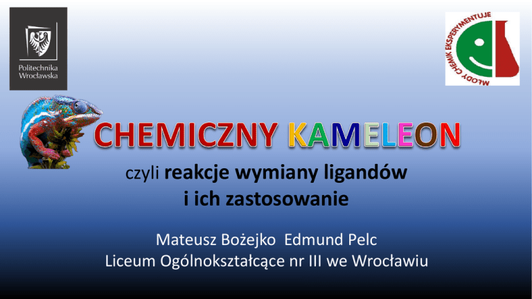 czyli reakcje wymiany ligandów i ich zastosowanie Mateusz Bożejko Edmund Pelc Liceum Ogólnokształcące nr III we Wrocławiu Podstawowe pojęcia Podstawowe pojęcia Związek kompleksowy Sfera koordynacyjna • Związek, którego cząsteczki • Otoczenie atomu centralnego w danym są zbudowane z atomu kompleksie. centralnego i ligandów lub zawierają przynajmniej jeden jon o takiej budowie. Ligand Liczba koordynacyjna • Jon, lub cząsteczka związana z atomem centralnym; jest donorem pary elektronowej. • Liczba ligandów związanych z atomem centralnym w danym kompleksie. Jon koordynacyjny (kompleksowy) Atom centralny Ligandy Wymiana ligandów Ligandy związku kompleksowego można zamienić w reakcji wymiany pojedynczej lub podwójnej, będącej reakcją podstawienia (substytucji). Reakcja taka może być reakcją redoks. Za pomocą tej reakcji można na wiele sposobów zmieniać barwę związku kompleksowego, zamieniając wyłącznie ligandy. Rodzaje reakcji wymiany ligandów Wymiana ligandów Substytucja nukleofilowa Substytucja elektrofilowa Oksydacyjnoredukcyjna Mieszane Wymiana ligandów Rozpuszczalnik Rodzaje wymiany ligandów Ligand 1 Ligand 2 Pomiary Wykonano absorbcyjne widma elektronowe otrzymanych związków kompleksowych jonów metali d-elektronowych. Rejestruje się widma związane z przejściami w rozszczepionym orbitalu typu d. Przejścia są zasadniczo charakterystyczne dla danego metalu (przy określonej liczbie koordynacyjnej). Zamiana rodzaju ligandów powoduje natomiast przesunięcie maksimum absorbcji w kierunku fal dłuższych lub krótszych. Orbital d eg t2g Schemat rozszczepienia orbitalu d Cel doświadczenia 1. Wykazanie, że reakcje wymiany ligandów mogą zachodzić, jeżeli powstający kompleks jest trwalszy od tego, który stanowił substrat. Odczynniki H2O CuSO4 5H2O NH3(aq) Schemat wykonania NH3∙H2O [Cu(H2O)6]2+ Obserwacje Po dodaniu amoniaku barwa roztworu zmieniła się na granatową. Wnioski Po dodaniu nadmiaru amoniaku zaszła reakcja: [Cu(H2O)6]2+ + 4NH3∙ H2O ⇌ [Cu(NH3)4]2+ + 10H2O • Zaszła przebudowa sfery koordynacyjnej, w wyniku której wszystkie cząsteczki wody zostały wymienione przez cząsteczki amoniaku. • Kompleks amoniakalny jest bardziej trwały od akwakompleksu. Widmo absorpcyjne kompleksów [Cu(NH3)4]2+ oraz [Cu(H2O)6]2+ 2.5 Widma absorpcyjne kompleksów miedzi (II) 16500cm-1 Absorpcja 2 1.5 12400cm-1 1 [Cu(H2O)6]2+ [Cu(NH3)4]2+ 0.5 0 7300 9850 12400 14950 17500 Liczba falowa [cm-1] 20050 22600 Cel doświadczenia 2. Wykazanie, że reakcje wymiany ligandów mogą być reakcjami redoks. Substraty [CoCl(NH3)5]Cl2 [Cr(H2O)6]Cl2 H2SO4 Otrzymywanie [CoCl(NH3)5]Cl2 NH3(aq) [Co(H2O)6]Cl2 H2O2 K2CO3 NH4NO3 [Co(CO3)(NH3)4]Cl H2O Otrzymywanie [CoCl(NH3)5]Cl2 CO2 HCl [Co(CO3)(NH3)4]Cl [CoCl(NH3)4(H2O)]Cl2 H2O Otrzymywanie [CoCl(NH3)5]Cl2 NH3(aq) [CoCl(NH3)4(H2O)]Cl2 [CoCl(NH3)5]Cl2 Widmo absorpcyjne [CoCl(NH3)5]Cl2 Widmo absorbcyjne kompleksu kobaltu(III) 1.25 Absorbcja 1 18100cm-1 27580cm-1 0.75 [CoCl(NH3)5]2+ 0.5 0.25 0 8000 11000 14000 17000 20000 Liczba falowa [cm-1] 23000 26000 29000 Otrzymywanie [Cr(H2O)6]Cl2 Zn(wiórki) [Cr(H2O)6]Cl3 Pod warstwą organiczną HCl H2 [Cr(H2O)6]Cl2 ZnCl2 Widmo absorpcyjne [Cr(H2O)6]Cl2 Widmo absorbcyjne kompleksu chromu(II) 0.6 14390cm-1 Absorbcja 0.45 0.3 23820cm-1 0.15 0 8000 11000 14000 17000 20000 Liczba falowa [cm-1] 23000 26000 29000 Schemat wykonania doświadczenia [Cr(H2O)6]Cl2 H2SO4 Olej silikonowy (warstwa organiczna) [CoCl(NH3)5]Cl2 Obserwacje Olej silikonowy (warstwa organiczna) [CoCl(NH3)5]Cl2 Mieszanina produktów reakcji [Cr(H2O)6]Cl2 Widmo absorpcyjne mieszaniny poreakcyjnej Widmo absorbcyjne chromu(III) oraz mieszaniny produktów reakcji 2.5 33120cm-1 2 Absorbcja 24530cm-1 1.5 17370cm-1 [Cr(H2O)6]3+ 1 Mieszanina poreakcyjna 0.5 0 14000 18000 22000 26000 Liczba falowa [cm-1] 30000 34000 Wnioski Zaszła reakcja: [CoCl(NH3)5]2+ + [Cr(H2O)6]2+ + 5H3O+ ⇌ [Co(H2O)6]2+ + [CrCl(H2O)5]2+ + 5NH4+ • Kobalt zredukował się z Co(III) do Co(II), a chrom utlenił z Cr(II) do Cr(III) • Reakcja jest reakcją oksydacyjno-redukcyjną Zastosowania Otrzymywanie kompleksów (np. kobaltu(III) czy kompleksów chelatowych) na potrzeby przemysłu farmaceutycznego, do laboratoriów analitycznych i badań. Zmiany barwy pod wpływem ciśnienia, czy rozpuszczalnika. Termowskaźniki – układy zawierające kompleks wymieniający ligand w określonej temp. Literatura Cieślak-Golonka M., Starosta J., Wasielewski M., „Wstęp do chemii koordynacyjnej”, Wydawnictwo Naukowe PWN, Warszawa 2013 Bielański A., „Podstawy chemii nieorganicznej”, Wydawnictwo Naukowe PWN, Warszawa 2009 Fotografie: Mateusz Bożejko, Edmund Pelc
