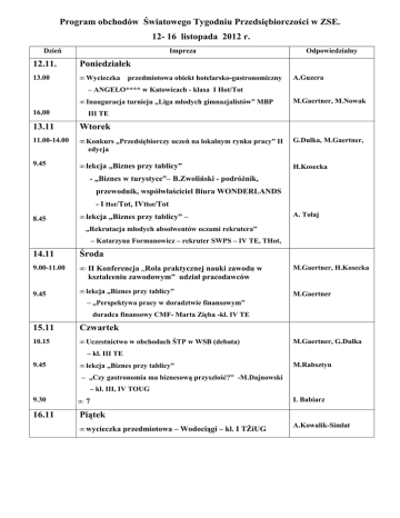 Program obchodów Światowego Tygodniu Przedsiębiorczości w ZSE. 12- 16 listopada 2012 r. Dzień Impreza 12.11. Poniedziałek 13.00 • Wycieczka przedmiotowa obiekt hotelarsko-gastronomiczny Odpowiedzialny A.Guzera – ANGELO**** w Katowicach - klasa I Hot/Tot • Inauguracja turnieju „Liga młodych gimnazjalistów” MBP 16,00 M.Gaertner, M.Nowak III TE 13.11 Wtorek 11.00-14.00 • Konkurs „Przedsiębiorczy uczeń na lokalnym rynku pracy” II G.Dulka, M.Gaertner, edycja 9.45 • lekcja „Biznes przy tablicy” H.Kosecka - „Biznes w turystyce”– B.Zwoliński - podróŜnik, przewodnik, współwłaściciel Biura WONDERLANDS - I Hot/Tot, IVHot/Tot 8.45 • lekcja „Biznes przy tablicy” – A. Tołaj „Rekrutacja młodych absolwentów oczami rekrutera” – Katarzyna Formanowicz – rekruter SWPS – IV TE, THot, 14.11 Środa 9.00-11.00 • II Konferencja „Rola praktycznej nauki zawodu w kształceniu zawodowym” udział pracodawców 9.45 • lekcja „Biznes przy tablicy” M.Gaertner, H.Kosecka M.Gaertner – „Perspektywa pracy w doradztwie finansowym” doradca finansowy CMF- Marta Zięba -kl. IV TE 15.11 Czwartek 10.15 • Uczestnictwo w obchodach ŚTP w WSB (debata) M.Gaertner, G.Dulka – kl. III TE 9.45 • lekcja „Biznes przy tablicy” M.Rabsztyn – „Czy gastronomia ma biznesową przyszłość?” -M.Dajnowski – kl. III, IV TOUG 9.30 • 7 16.11 Piątek • wycieczka przedmiotowa – Wodociągi – kl. I TśiUG I. Babiarz A.Kowalik-Simlat