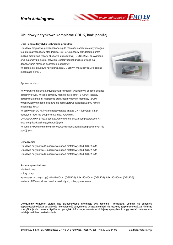 Karta katalogowa ___________________________________________________________________________ Obudowy natynkowe kompletne OBUK, kod: poniżej Opis i charakterystyka techniczna produktu: Obudowy natynkowe przeznaczone są do montażu osprzętu elektrycznego i teleinformatycznego w standardzie 45x45. Gniazda w standardzie 60mm można montować tylko w obudowie 2-modułowej (OBUK-2/M), po wymianie śrub na śruby z płaskimi główkami, należy jednak zwrócić uwagę na dopasowanie ramki od osprzętu do obudowy. W komplecie: obudowa natynkowa (OBU), uchwyt mocujący (SUP), ramka maskująca (RAM). Sposób montażu: W wybranym miejscu, korzystając z prowadnic, wycinamy w bocznej ściance obudowy otwór. W razie potrzeby montujemy łącznik (E K/PU), łączący obudowę z kanałem. Następnie przykręcamy uchwyt mocujący (SUP), wtrzaskujemy gniazdo sieciowe lub komputerowe i zatrzaskujemy ramkę maskującą RAM. W uchwytach UCHKP-6 nie należy łączyć gniazd GN-4 lub GNB-4 z 2x adapter 1-mod. lub adapterani 2-mod. kątowymi. Uchwyt UCHKP-6 może być używany tylko do gniazd komputerowych RJ oraz do gniazd zasilających potrójnych. W kanale KP90x40 nie można stosować gniazd zasilających podwójnych lub potrójnych. Oznaczenia: Obudowa natynkowa 2-modułowa (suport metalowy), Kod: OBUK-2/M Obudowa natynkowa 4-modułowa (suport metalowy), Kod: OBUK-4/M Obudowa natynkowa 6-modułowa (suport metalowy), Kod: OBUK-6/M Parametry techniczne: Mechaniczne: kolory: biały wymiary (szer x wys x gł): 84x84x40mm (OBUK-2); 82x150x40mm (OBUK-4); 82x195x40mm (OBUK-6); materiał: ABS (obudowa i ramka maskująca), uchwyty metalowe Dołożyliśmy wszelkich starań, aby przedstawione informacje były rzetelne i kompletne. Jednak nie ponosimy odpowiedzialności za dokładność i kompletność danych oraz w szczególności nie możemy zagwarantować, że niniejsza specyfikacja nie zawiera błędów lub pomyłek. Informacje zawarte w niniejszej specyfikacji mogą zostać zmienione w każdej chwili bez powiadomienia. Emiter Sp. z o. o., ul. Porcelanowa 27, 40-241 Katowice, POLSKA, tel. +48 32 730 34 00 [email protected]