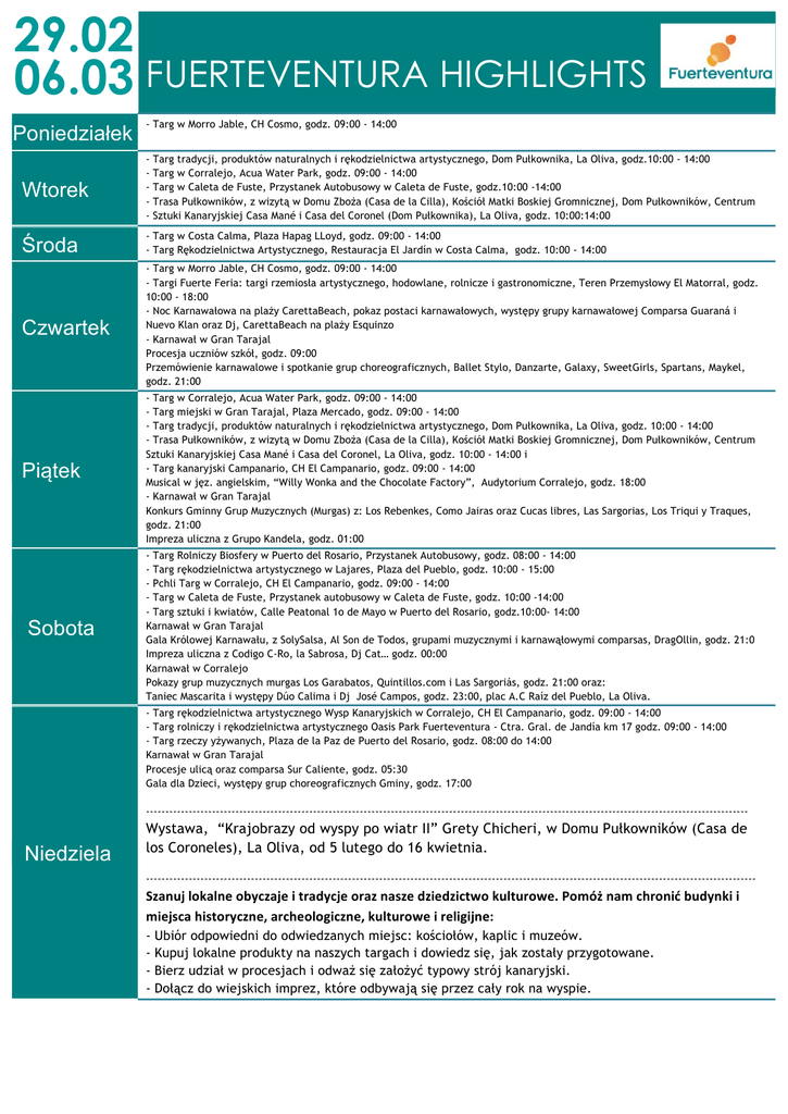 29.02 06.03 FUERTEVENTURA HIGHLIGHTS Poniedziałek - Targ w Morro Jable, CH Cosmo, godz. 09:00 - 14:00 Wtorek - Środa - Targ w Costa Calma, Plaza Hapag LLoyd, godz. 09:00 - 14:00 - Targ Rękodzielnictwa Artystycznego, Restauracja El Jardín w Costa Calma, godz. 10:00 - 14:00 Czwartek - Targ w Morro Jable, CH Cosmo, godz. 09:00 - 14:00 - Targi Fuerte Feria: targi rzemiosła artystycznego, hodowlane, rolnicze i gastronomiczne, Teren Przemysłowy El Matorral, godz. 10:00 - 18:00 - Noc Karnawałowa na plaży CarettaBeach, pokaz postaci karnawałowych, występy grupy karnawałowej Comparsa Guaraná i Nuevo Klan oraz Dj, CarettaBeach na plaży Esquinzo - Karnawał w Gran Tarajal Procesja uczniów szkół, godz. 09:00 Przemówienie karnawalowe i spotkanie grup choreograficznych, Ballet Stylo, Danzarte, Galaxy, SweetGirls, Spartans, Maykel, godz. 21:00 Piątek - Targ w Corralejo, Acua Water Park, godz. 09:00 - 14:00 - Targ miejski w Gran Tarajal, Plaza Mercado, godz. 09:00 - 14:00 - Targ tradycji, produktów naturalnych i rękodzielnictwa artystycznego, Dom Pułkownika, La Oliva, godz. 10:00 - 14:00 - Trasa Pułkowników, z wizytą w Domu Zboża (Casa de la Cilla), Kościół Matki Boskiej Gromnicznej, Dom Pułkowników, Centrum Sztuki Kanaryjskiej Casa Mané i Casa del Coronel, La Oliva, godz. 10:00 - 14:00 i - Targ kanaryjski Campanario, CH El Campanario, godz. 09:00 - 14:00 Musical w jęz. angielskim, “Willy Wonka and the Chocolate Factory”, Audytorium Corralejo, godz. 18:00 - Karnawał w Gran Tarajal Konkurs Gminny Grup Muzycznych (Murgas) z: Los Rebenkes, Como Jairas oraz Cucas libres, Las Sargorias, Los Triqui y Traques, godz. 21:00 Impreza uliczna z Grupo Kandela, godz. 01:00 Sobota Targ tradycji, produktów naturalnych i rękodzielnictwa artystycznego, Dom Pułkownika, La Oliva, godz.10:00 - 14:00 Targ w Corralejo, Acua Water Park, godz. 09:00 - 14:00 Targ w Caleta de Fuste, Przystanek Autobusowy w Caleta de Fuste, godz.10:00 -14:00 Trasa Pułkowników, z wizytą w Domu Zboża (Casa de la Cilla), Kościół Matki Boskiej Gromnicznej, Dom Pułkowników, Centrum Sztuki Kanaryjskiej Casa Mané i Casa del Coronel (Dom Pułkownika), La Oliva, godz. 10:00:14:00 - Targ Rolniczy Biosfery w Puerto del Rosario, Przystanek Autobusowy, godz. 08:00 - 14:00 - Targ rękodzielnictwa artystycznego w Lajares, Plaza del Pueblo, godz. 10:00 - 15:00 - Pchli Targ w Corralejo, CH El Campanario, godz. 09:00 - 14:00 - Targ w Caleta de Fuste, Przystanek autobusowy w Caleta de Fuste, godz. 10:00 -14:00 - Targ sztuki i kwiatów, Calle Peatonal 1o de Mayo w Puerto del Rosario, godz.10:00- 14:00 Karnawał w Gran Tarajal Gala Królowej Karnawału, z SolySalsa, Al Son de Todos, grupami muzycznymi i karnawąłowymi comparsas, DragOllin, godz. 21:0 Impreza uliczna z Codigo C-Ro, la Sabrosa, Dj Cat… godz. 00:00 Karnawał w Corralejo Pokazy grup muzycznych murgas Los Garabatos, Quintillos.com i Las Sargoriás, godz. 21:00 oraz: Taniec Mascarita i występy Dúo Calima i Dj José Campos, godz. 23:00, plac A.C Raíz del Pueblo, La Oliva. - Targ rękodzielnictwa artystycznego Wysp Kanaryjskich w Corralejo, CH El Campanario, godz. 09:00 - 14:00 - Targ rolniczy i rękodzielnictwa artystycznego Oasis Park Fuerteventura - Ctra. Gral. de Jandía km 17 godz. 09:00 - 14:00 - Targ rzeczy yżywanych, Plaza de la Paz de Puerto del Rosario, godz. 08:00 do 14:00 Karnawał w Gran Tarajal Procesje ulicą oraz comparsa Sur Caliente, godz. 05:30 Gala dla Dzieci, występy grup choreograficznych Gminy, godz. 17:00 ----------------------------------------------------------------------------------------------------------------------------------------------------------- Niedziela Wystawa, “Krajobrazy od wyspy po wiatr II” Grety Chicheri, w Domu Pułkowników (Casa de los Coroneles), La Oliva, od 5 lutego do 16 kwietnia. ------------------------------------------------------------------------------------------------------------------------------------------------------------- Szanujlokalneobyczajeitradycjeoraznaszedziedzictwokulturowe.Pomóżnamchronićbudynkii miejscahistoryczne,archeologiczne,kulturoweireligijne: - Ubiór odpowiedni do odwiedzanych miejsc: kościołów, kaplic i muzeów. Kupuj lokalne produkty na naszych targach i dowiedz się, jak zostały przygotowane. Bierz udział w procesjach i odważ się założyć typowy strój kanaryjski. Dołącz do wiejskich imprez, które odbywają się przez cały rok na wyspie.