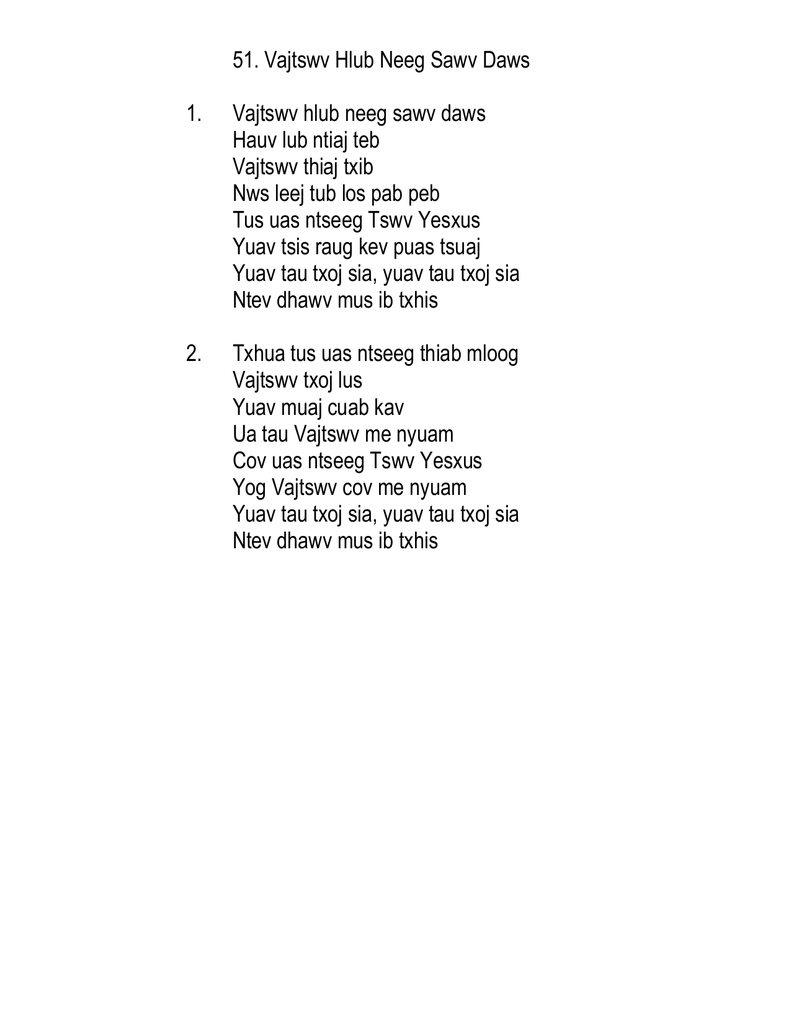 51. Vajtswv Hlub Neeg Sawv Daws 1. Vajtswv hlub neeg sawv daws Hauv lub ntiaj teb Vajtswv thiaj txib Nws leej tub los pab peb Tus uas ntseeg Tswv Yesxus Yuav tsis raug kev puas tsuaj Yuav tau txoj sia, yuav tau txoj sia Ntev dhawv mus ib txhis 2. Txhua tus uas ntseeg thiab mloog Vajtswv txoj lus Yuav muaj cuab kav Ua tau Vajtswv me nyuam Cov uas ntseeg Tswv Yesxus Yog Vajtswv cov me nyuam Yuav tau txoj sia, yuav tau txoj sia Ntev dhawv mus ib txhis