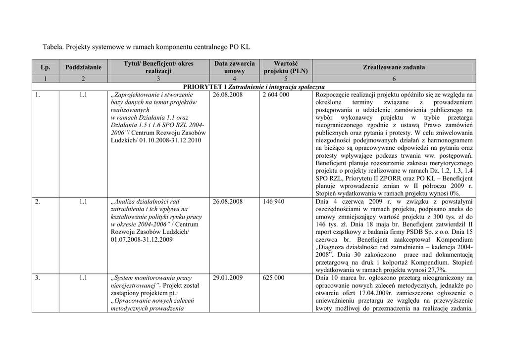 Tabela. Projekty systemowe w ramach komponentu centralnego PO KL Lp. Poddziałanie 1 2 1. 1.1 2. 1.1 3. 1.1 Tytuł/ Beneficjent/ okres Data zawarcia Wartość Zrealizowane zadania realizacji umowy projektu (PLN) 3 4 5 6 PRIORYTET I Zatrudnienie i integracja społeczna „Zaprojektowanie i stworzenie 26.08.2008 2 604 000 Rozpoczęcie realizacji projektu opóźniło się ze względu na bazy danych na temat projektów określone terminy związane z prowadzeniem realizowanych postępowania o udzielenie zamówienia publicznego na w ramach Działania 1.1 oraz wybór wykonawcy projektu w trybie przetargu Działania 1.5 i 1.6 SPO RZL 2004nieograniczonego zgodnie z ustawą Prawo zamówień 2006”/ Centrum Rozwoju Zasobów publicznych oraz pytania i protesty. W celu zniwelowania Ludzkich/ 01.10.2008-31.12.2010 niezgodności podejmowanych działań z harmonogramem na bieŜąco są opracowywane odpowiedzi na pytania oraz protesty wpływające podczas trwania ww. postępowań. Beneficjent planuje rozszerzenie zakresu merytorycznego projektu o projekty realizowane w ramach Dz. 1.2, 1.3, 1.4 SPO RZL, Priorytetu II ZPORR oraz PO KL – Beneficjent planuje wprowadzenie zmian w II półroczu 2009 r. Stopień wydatkowania w ramach projektu wynosi 0%. „Analiza działalności rad 26.08.2008 146 940 Dnia 4 czerwca 2009 r. w związku z powstałymi zatrudnienia i ich wpływu na oszczędnościami w ramach projektu, podpisano aneks do kształtowanie polityki rynku pracy umowy zmniejszający wartość projektu z 300 tys. zł do w okresie 2004-2006” / Centrum 146 tys. zł. Dnia 18 maja br. Beneficjent zatwierdził II Rozwoju Zasobów Ludzkich/ raport cząstkowy z badania firmy PSDB Sp. z o.o. Dnia 15 01.07.2008-31.12.2009 czerwca br. Beneficjent zaakceptował Kompendium „Diagnoza działalności rad zatrudnienia – kadencja 20042008”. Dnia 30 zakończono prace nad dokumentacją przetargową na druk i kolportaŜ Kompendium. Stopień wydatkowania w ramach projektu wynosi 27,7%. „System monitorowania pracy 29.01.2009 625 000 Dnia 10 marca br. ogłoszono przetarg nieograniczony na nierejestrowanej”- Projekt został opracowanie nowych zaleceń metodycznych, jednakŜe po zastąpiony projektem pt.: otwarciu ofert 17.04.2009r. zamieszczono ogłoszenie o „Opracowanie nowych zaleceń uniewaŜnieniu przetargu ze względu na przewyŜszenie metodycznych prowadzenia kwoty moŜliwej do przeznaczenia na realizację zadania. monitoringu zawodów deficytowych i nadwyŜkowych na lokalnym rynku pracy” / Centrum Rozwoju Zasobów Ludzkich/ 01.11.200831.12.2009 4. 1.1 „Diagnozowanie zapotrzebowania na kwalifikacje i umiejętności na regionalnym i lokalnym rynku pracy – współpraca urzędów pracy z pracodawcami i innymi partnerami na rynku pracy” / Centrum Rozwoju Zasobów Ludzkich/ 01.07.2008-31.12.2009 26.08.2008 892 241 5. 1.1 „Modernizacja bazy danych standardów kwalifikacji 26.08.2008 400 000 Następnie w kwietniu opracowano nowy opis przedmiotu zamówienia z rozszerzeniem o część informatyczną. 26 czerwca br. zaakceptowano zmianę wniosku o dofinansowanie z przesunięciem terminu zakończenia na 30.06.2010 r. oraz przesunięciami kwot pomiędzy zadaniami. Do końca okresu sprawozdawczego nie został podpisany aneks do umowy. Opóźnienia w projekcie wynikają z uniewaŜnienia postępowania przetargowego na realizację zadań projektu. Stopień wydatkowania w ramach projektu wynosi 2,1%. W związku z powstałymi w wyniku realizacji projektu oszczędnościami Beneficjent zgłosił zmiany, polegające na zmniejszeniu wartości projektu. W związku z powyŜszym, w dniu 4 czerwca br. podpisano aneks zmieniający wartość projektu z 900 000,00 zł na 892 240,50 zł. W styczniu br. dokonano odbioru II Raportu cząstkowego - Badanie dotychczasowych doświadczeń urzędów pracy. W marcu odebrano III Raport z badań ilościowych oraz Katalog dobrych praktyk. Ponadto, zakończono realizację zadania dotyczącego analizy obecnie stosowanych narzędzi, metod, diagnozy zapotrzebowania na kwalifikacje zawodowe na regionalnych i lokalnych rynkach pracy. W ramach zadania dotyczącego „Zaprojektowania nowych narzędzi diagnozowania zapotrzebowania na kwalifikacje i umiejętności” odebrano produkt – pt. „Koncepcja metod, narzędzi i procedur diagnozowania zapotrzebowania na kwalifikacje i umiejętności na regionalnym i lokalnym rynku pracy” oraz rozpoczęto jego test w wojewódzkich i powiatowych urzędach pracy. Mimo opóźnień w realizacji harmonogramu projektu nie ma zagroŜenia w osiągnięciu rezultatów projektu oraz nie zagraŜają one przekroczeniem daty końcowej projektu. Stopień wydatkowania w ramach projektu wynosi 41,4%. Rozpoczęcie realizacji projektu opóźniło się ze względu na późniejsze niŜ zakładano wszczęcie procedury zawodowych i modułowych programów szkolenia” / Centrum Rozwoju Zasobów Ludzkich/ 01.08.2008-31.12.2010 6. 7. 1.1 „Szkolenia modułowe pracowników instytucji rynku pracy, realizujących usługi rynku pracy i programy aktywizacji zawodowej” / Centrum Rozwoju Zasobów Ludzkich/ 01.06.2008-31.12.2010 21.10.2008 21 131 200 „Oferta szkoleń w technologii e- 30.04.2009 4 302 520 umoŜliwiającej przeprowadzenie zamówienia publicznego na wybór wykonawcy projektu w trybie przetargu nieograniczonego zgodnie z ustawą Prawo zamówień publicznych. Dodatkowym czynnikiem mającym wpływ na opóźnienie był przedłuŜający się termin podpisania umowy z wykonawcą. Umowa została podpisana w dniu 4 listopada 2008 r. W marcu br. nastąpiło przekazanie zmodyfikowanego prototypu bazy przez wykonawcę. W dniu 11 marca br. miała miejsce instalacja i konfiguracja systemu monitorującego do bazy danych – Nagios. Dnia 25.05.2009 r. wykonawca przekazał pierwszą wersję produktów powstałych w zadaniu "wykonanie oprogramowania wg projektu technicznego" oraz w zadaniu "napełnienie bazy danych". W ramach zadania dotyczącego „Analizy funkcjonowania dotychczasow