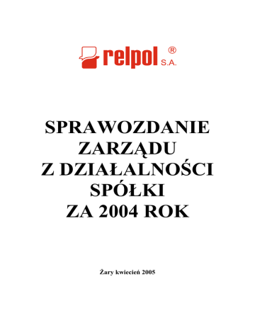 SPRAWOZDANIE ZARZĄDU Z DZIAŁALNOŚCI SPÓŁKI ZA 2004 ROK Żary kwiecień 2005 Spis treści 1. 2. 3. 4. 5. 6. 7. 8. 9. 10. 11. 12. 13. 14. 15. 16. 17. 18. 19 20 21 22 23 24 Informacje podstawowe.........................................................................................................3 Istotne zdarzenia mające wpływające na działalność Relpol S.A.....................................3 Ważniejsze osiągnięcia w dziedzinie badań i rozwoju za rok 2004 ...................................7 Ocena aktualnej i przewidywanej sytuacji Relpol S.A. ......................................................8 Informacja na temat ryzyka i zagrożeń .............................................................................10 Informacja o podstawowych produktach, towarach lub usługach..................................11 Informacje o zmianach rynków zbytu oraz odbiorcach, dostawcach osiągających, co najmniej 10% przychodów ze sprzedaży ogółem ............................................................13 Informacje o umowach znaczących dla działalności emitenta.........................................14 Informacje o zmianach w powiązaniach organizacyjnych lub kapitałowych emitenta.15 Informacje o zawarciu przez Spółkę z podmiotami powiązanymi transakcji przekraczających wyrażoną w złotych równowartość kwoty 500.000 EURO ..............16 Informacje o zaciągniętych kredytach i umowach pożyczek ...........................................17 Informacje o udzielonych pożyczkach, gwarancjach i poręczeniach ..............................17 Emisja papierów wartościowych.........................................................................................17 Różnice pomiędzy wynikami finansowym wykazanymi w raporcie a wcześniej publikowanymi prognozami ..............................................................................................18 Zarządzanie zasobami finansowymi...................................................................................18 Ocena możliwości realizacji zamierzeń inwestycyjnych, w tym inwestycji kapitałowych, w porównaniu do wielkości posiadanych środków ..........................................................19 Ocena czynników i nietypowych zdarzeń mających wpływ na wynik z działalności za rok obrotowy .......................................................................................................................20 Charakterystyka zewnętrznych i wewnętrznych czynników, istotnych dla rozwoju przedsiębiorstwa oraz opis perspektyw rozwoju działalności ........................................20 Zmiana podstawowych zasad zarządzania przedsiębiorstwem emitenta i grupą kapitałową............................................................................................................................22 Zmiany w składzie osób zarządzających i nadzorujących emitenta w ciągu ostatniego roku obrachunkowego........................................................................................................23 Określenie liczby i wartości nominalnej akcji emitenta oraz akcji i udziałów w jednostkach powiązanych, będących w posiadaniu osób zarządzających i nadzorujących .....................................................................................................................23 Akcjonariusze posiadający bezpośrednio i pośrednio przez podmioty zależne co najmniej 5% w ogólnej liczbie głosów na walnym zgromadzeniu akcjonariuszy ........23 Informacje o znanych emitentowi umowach, w wyniku których mogą w przyszłości nastąpić zmiany w proporcjach posiadanych akcji przez dotychczasowych akcjonariuszy ......................................................................................................................24 Ważne informacje po dniu bilansowym .............................................................................25 Sprawozdanie zarządu z działalności Relpol S.A. za 2004 r. 2 1. Informacje podstawowe Relpol S.A. ul. 11 Listopada 37 68-200 Żary (0-68) 47-90-800 (0-68) 374-38-66 Adres: Telefon Faks NIP: Regon: Data rejestracji: Audytor: Nr i klasa EKD: Strona Internetowa Adres e-mail: 2. 928-000-70-76 970010355 29.03.1991 Sąd Rejonowy w Zielonej Górze, KRS nr 0000088688 HLB Frąckowiak i Wspólnicy Sp. z o.o. 33.30 (produkcja sprzętu do sterowania procesami produkcyjnymi) WWW.relpol.com.pl, WWW.inwestor.relpol.com.pl [email protected] Istotne zdarzenia mające wpływające na działalność Relpol S.A. Podstawowe zdarzenia wpływające na działalność w 2004 wynikają zarówno z działań podejmowanych przez Relpol S.A. w celu realizacji długofalowej strategii, jak i kształtowania się niezależnego od spółki otoczenia gospodarczego. 2.1 Wpływ czynników makroekonomicznych Czynniki makroekonomiczne w istotny sposób wpływają na rezultaty ekonomiczne przedsiębiorstwa. Dlatego też są one zawsze punktem wyjścia przy ocenie wyników historycznych w budowie prognoz na przyszłe okresu. Podane poniżej wartości planowane wynikają z analiz dokonywanych przez instytucje finansowe. Dane z kolumny „wykonanie” są wartościami rzeczywiście osiągniętymi lub ze względu na długi cykl obliczeń i publikacji danych statystycznych prognozami wykonania. Treść plan wykonanie PKB inflacja (XII/XII) nakłady inwestycyjne WIBOR 1M kurs EUR średni 4,8% 2,2% 7,5% 4,5% 4,35 5,4% 4,4% 5,1% 6,5% 4,52 Sprawozdanie zarządu z działalności Relpol S.A. za 2004 r. 3 Jednym z najważniejszych wskaźników w ocenie sytuacji gospodarczej kraju jest PKB. Jego wartość była o 12% większa od planowanej, co oznacza, że gospodarka rosła szybciej niż zakładała spółka. Dla Relpolu nie jest najważniejsza jednak sama dynamika PKB, ale jego struktura. W 2004 r. nie była ona najkorzystniejsza dla spółki, bo nakłady inwestycyjne były znacząco niższe od zakładanych i wyniosły tylko 5,1%. Dodatkowo należy pamiętać, że duży udział w