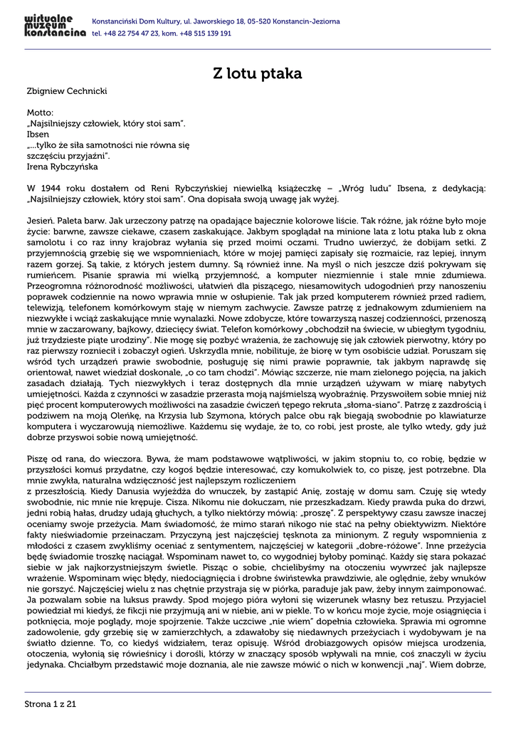 Konstanciński Dom Kultury, ul. Jaworskiego 18, 05-520 Konstancin-Jeziorna tel. +48 22 754 47 23, kom. +48 515 139 191 Z lotu ptaka Zbigniew Cechnicki Motto: „Najsilniejszy człowiek, który stoi sam”. Ibsen „...tylko że siła samotności nie równa się szczęściu przyjaźni”. Irena Rybczyńska W 1944 roku dostałem od Reni Rybczyńskiej niewielką książeczkę – „Wróg ludu” Ibsena, z dedykacją: „Najsilniejszy człowiek, który stoi sam”. Ona dopisała swoją uwagę jak wyżej. Jesień. Paleta barw. Jak urzeczony patrzę na opadające bajecznie kolorowe liście. Tak różne, jak różne było moje życie: barwne, zawsze ciekawe, czasem zaskakujące. Jakbym spoglądał na minione lata z lotu ptaka lub z okna samolotu i co raz inny krajobraz wyłania się przed moimi oczami. Trudno uwierzyć, że dobijam setki. Z przyjemnością grzebię się we wspomnieniach, które w mojej pamięci zapisały się rozmaicie, raz lepiej, innym razem gorzej. Są takie, z których jestem dumny. Są również inne. Na myśl o nich jeszcze dziś pokrywam się rumieńcem. Pisanie sprawia mi wielką przyjemność, a komputer niezmiennie i stale mnie zdumiewa. Przeogromna różnorodność możliwości, ułatwień dla piszącego, niesamowitych udogodnień przy nanoszeniu poprawek codziennie na nowo wprawia mnie w osłupienie. Tak jak przed komputerem również przed radiem, telewizją, telefonem komórkowym staję w niemym zachwycie. Zawsze patrzę z jednakowym zdumieniem na niezwykłe i wciąż zaskakujące mnie wynalazki. Nowe zdobycze, które towarzyszą naszej codzienności, przenoszą mnie w zaczarowany, bajkowy, dziecięcy świat. Telefon komórkowy „obchodził na świecie, w ubiegłym tygodniu, już trzydzieste piąte urodziny”. Nie mogę się pozbyć wrażenia, że zachowuję się jak człowiek pierwotny, który po raz pierwszy rozniecił i zobaczył ogień. Uskrzydla mnie, nobilituje, że biorę w tym osobiście udział. Poruszam się wśród tych urządzeń prawie swobodnie, posługuję się nimi prawie poprawnie, tak jakbym naprawdę się orientował, nawet wiedział doskonale, „o co tam chodzi”. Mówiąc szczerze, nie mam zielonego pojęcia, na jakich zasadach działają. Tych niezwykłych i teraz dostępnych dla mnie urządzeń używam w miarę nabytych umiejętności. Każda z czynności w zasadzie przerasta moją najśmielszą wyobraźnię. Przyswoiłem sobie mniej niż pięć procent komputerowych możliwości na zasadzie ćwiczeń tępego rekruta „słoma-siano”. Patrzę z zazdrością i podziwem na moją Oleńkę, na Krzysia lub Szymona, których palce obu rąk biegają swobodnie po klawiaturze komputera i wyczarowują niemożliwe. Każdemu się wydaje, że to, co robi, jest proste, ale tylko wtedy, gdy już dobrze przyswoi sobie nową umiejętność. Piszę od rana, do wieczora. Bywa, że mam podstawowe wątpliwości, w jakim stopniu to, co robię, będzie w przyszłości komuś przydatne, czy kogoś będzie interesować, czy komukolwiek to, co piszę, jest potrzebne. Dla mnie zwykła, naturalna wdzięczność jest najlepszym rozliczeniem z przeszłością. Kiedy Danusia wyjeżdża do wnuczek, by zastąpić Anię, zostaję w domu sam. Czuję się wtedy swobodnie, nic mnie nie krępuje. Cisza. Nikomu nie dokuczam, nie przeszkadzam. Kiedy prawda puka do drzwi, jedni robią hałas, drudzy udają głuchych, a tylko niektórzy mówią: „proszę”. Z perspektywy czasu zawsze inaczej oceniamy swoje przeżycia. Mam świadomość, że mimo starań nikogo nie stać na pełny obiektywizm. Niektóre fakty nieświadomie przeinaczam. Przyczyną jest najczęściej tęsknota za minionym. Z reguły wspomnienia z młodości z czasem zwykliśmy oceniać z sentymentem, najczęściej w kategorii „dobre-różowe”. Inne przeżycia będę świadomie troszkę naciągał. Wspominam nawet to, co wygodniej byłoby pominąć. Każdy się stara pokazać siebie w jak najkorzystniejszym świetle. Pisząc o sobie, chcielibyśmy na otoczeniu wywrzeć jak najlepsze wrażenie. Wspominam więc błędy, niedociągnięcia i drobne świństewka prawdziwie, ale oględnie, żeby wnuków nie gorszyć. Najczęściej wielu z nas chętnie przystraja się w piórka, paraduje jak paw, żeby innym zaimponować. Ja pozwalam sobie na luksus prawdy. Spod mojego pióra wyłoni się wizerunek własny bez retuszu. Przyjaciel powiedział mi kiedyś, że fikcji nie przyjmują ani w niebie, ani w piekle. To w końcu moje życie, moje osiągnięcia i potknięcia, moje poglądy, moje spojrzenie. Także uczciwe „nie wiem” dopełnia człowieka. Sprawia mi ogromne zadowolenie, gdy grzebię się w zamierzchłych, a zdawałoby się niedawnych przeżyciach i wydobywam je na światło dzienne. To, co kiedyś widziałem, teraz opisuję. Wśród drobiazgowych opisów miejsca urodzenia, otoczenia, wyłonią się rówieśnicy i dorośli, którzy w znaczący sposób wpływali na mnie, coś znaczyli w życiu jedynaka. Chciałbym przedstawić moje doznania, ale nie zawsze mówić o nich w konwencji „naj”. Wiem dobrze, Strona 1 z 21 Konstanciński Dom Kultury, ul. Jaworskiego 18, 05-520 Konstancin-Jeziorna tel. +48 22 754 47 23, kom. +48 515 139 191 że najłatwiej, najwyraźniej opisywać w tonacji czarno-białej. Ja będę wydobywał i utrwalał szarzyznę codzienności. Nie jestem historykiem, raczej nudziarzem, czasami gawędziarzem. Miałem niecodzienne szczęście spotykać na drodze swojego życia ludzi niezwykłych, dobrych, szlachetnych, urzekających prostotą, zwyczajnym człowieczeństwem, ludzi, którzy mnie zafascynowali i których mile i z wdzięcznością wspominam. Noszę ich w swoim sercu. Prawie sto lat minęło. Wiadomo, że na szczęśliwą starość składają się także szczęśliwe wspomnienia z dzieciństwa, najczęściej opisywane z sentymentem. Myślę o mojej matce i moim ojcu, o rodzinie, przyjaciołach, kolegach, ludziach znaczących w moim życiu, o codzienności i niewyszukanych zabawach