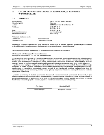 Rozdział II – Osoby odpowiedzialne za informacje zawarte w prospekcie Prospekt Emisyjny II OSOBY ODPOWIEDZIALNE ZA INFORMACJE ZAWARTE W PROSPEKCIE 2.1 EMITENT Firma Spółki: Siedziba Spółki: Adres: TRAS TYCHY Spółka Akcyjna Skawina 32-050 Skawina, ul. Krakowska 87 Telefony: (012) 277 88 00 (012) 277 88 01 (012) 277 88 88 [email protected] www.tras.pl Fax: Poczta elektroniczna: Strona internetowa: W imieniu Emitenta działa: Jan Mazur Matylda Birgiel Prezes Zarządu Wiceprezes Zarządu Informacja o miejscu zamieszkania osób fizycznych działających w imieniu Emitenta została objęta wnioskiem o niepublikowanie i przedstawiona w „Informacjach objętych wnioskiem o niepublikowanie”. Wyżej wymienione osoby odpowiadają za wszystkie informacje zawarte w Prospekcie. Oświadczenie osób działających w imieniu Emitenta: Działając w imieniu TRAS TYCHY S.A. oświadczamy że: - wszystkie informacje zawarte w Prospekcie są prawdziwe, rzetelne i nie pomijają żadnych faktów ani okoliczności, których ujawnienie w Prospekcie jest wymagane przepisami prawa, a także zgodnie z naszą najlepszą wiedzą nie istnieją, poza ujawnionymi w Prospekcie, istotne zobowiązania Emitenta ani okoliczności, które mogłyby wywrzeć znaczący wpływ na sytuację prawną, majątkową i finansową Emitenta oraz osiągane przez niego wyniki finansowe. - zgodnie z naszą najlepszą wiedzą, sprawozdanie finansowe, skonsolidowane sprawozdanie finansowe i informacje finansowe w formie raportów kwartalnych i skonsolidowanych raportów kwartalnych oraz dane porównywalne, zamieszczone w prospekcie, sporządzone zostały zgodnie z obowiązującymi zasadami rachunkowości oraz że odzwierciedlają w sposób prawdziwy, rzetelny i jasny sytuację majątkową i finansową oraz wynik finansowy emitenta i jego grupy kapitałowej. - podmiot uprawniony do badania sprawozdań finansowych i skonsolidowanych sprawozdań finansowych, w tym będących podstawą sporządzenia danych porównywalnych, zamieszczonych w prospekcie, został wybrany zgodnie z przepisami prawa oraz że podmiot ten oraz biegli rewidenci dokonujący badania spełniali warunki do wyrażenia bezstronnej i niezależnej opinii o badaniu, zgodnie z właściwymi przepisami prawa krajowego. Tras - Tychy S.A. Jan Mazur Matylda Birgiel Prezes Zarządu Wiceprezes Zarządu 9 Rozdział II – Osoby odpowiedzialne za informacje zawarte w prospekcie Prospekt Emisyjny 2.2 PODMIOTY SPORZĄDZAJĄCE PROSPEKT 2.2.1 TRAS TYCHY S.A. Firma: Siedziba: Adres: Telefony: TRAS TYCHY Spółka Akcyjna Skawina 32-050 Skawina, ul. Krakowska 87 (012) 277 88 00 (012) 277 88 01 (012) 277 88 88 [email protected] www.tras.pl Fax: Poczta elektroniczna: Strona internetowa: W imieniu Emitenta działa: Jan Mazur Matylda Birgiel Prezes Zarządu Wiceprezes Zarządu Informacja o miejscu zamieszkania osób fizycznych działających w imieniu Tras Tychy Spółka Akcyjna. została objęta wnioskiem o niepublikowanie i przedstawiona w „Informacjach objętych wnioskiem o niepublikowanie”. Osoby działające w imieniu Emitenta jako podmiotu sporządzającego Prospekt odpowiedzialne są za informacje zawarte w Prospekcie w następujących jego częściach: Rozdział II pkt 2.1, 2.2.1 oraz Rozdział VI, Rozdział VII, Rozdział IX, Załączniki nr I, III, V- IX. Według stanu na dzień sporządzenia Prospektu pomiędzy Emitentem, a osobami fizycznymi działającymi w imieniu Emitenta nie istnieją żadne powiązania personalne, kapitałowe, organizacyjne ani umowne za wyjątkiem opisanych w Rozdziale VI. Oświadczenie o odpowiedzialności osób działających w imieniu Tras Tychy S.A., jako podmiotu sporządzającego Prospekt Działając w imieniu Tras Tychy S.A. oświadczamy, że Prospekt w częściach, za których sporządzenie odpowiedzialna jest Tras Tychy S.A. został sporządzony z zachowaniem należytej staranności zawodowej oraz że informacje zawarte w częściach Prospektu, za których sporządzenie odpowiedzialna jest Tras Tychy są prawdziwe i rzetelne i nie pomijają żadnych faktów ani okoliczności, których ujawnienie w Prospekcie jest wymagane przepisami prawa. Tras - Tychy S.A. Jan Mazur Matylda Birgiel Prezes Zarządu Wiceprezes Zarządu 10 Rozdział II – Osoby odpowiedzialne za informacje zawarte w prospekcie 2.2.2 Prospekt Emisyjny INTUR KFS SP. Z O.O. – SPÓŁKA PRZEJMOWANA Firma: Intur Konstrukcje- Fasady- Spedycja Spółka z ograniczoną odpowiedzialnością Inowrocław ul. Marcinkowskiego 154, 88- 100 Inowrocław (052) 355 03 00 (052) 357 12 26 intur-kfs.pl www.intur-kfs.pl Siedziba: Adres: Telefony: Fax: Poczta elektroniczna: Strona internetowa: W imieniu Intur KFS Sp. z o.o. działa: Jan Mazur Prezes Zarządu Informacja o miejscu zamieszkania osoby fizycznej działającej w imieniu Intur KFS Sp. z o.o. została objęta wnioskiem o niepublikowanie i przedstawiona w „Informacjach objętych wnioskiem o niepublikowanie”. Osoba działająca w imieniu Intur KFS Sp. z o.o. jako podmiotu sporządzającego Prospekt odpowiedzialna jest za informacje zawarte w Prospekcie w następujących jego częściach: Rozdział II pkt 2.2.2, Rozdział VIII pkt 8.2.158.2.16 i pkt 8.4 oraz Załączmoki nr II, IV. Według stanu na dzień sporządzenia Prospektu pomiędzy Intur KFS Sp. z o.o., a osobą fizyczną działającą w imieniu Intur KFS Sp. z o.o. nie istnieją żadne powiązania personalne, kapitałowe, organizacyjne ani umowne za wyjątkiem opisanych w Rozdziale VI oraz w Rozdziale VIII. Oświadczenie o odpowiedzialności osób działających w imieniu Intur KFS sp. z o.o., jako podmiotu sporządzającego Prospekt Działając w imieniu Intur KFS sp. z o.o. oświadczam, że Prospekt w częściach, za których sporządzenie odpowiedzialna jest Intur KFS Sp. z o.o. został sporządzony z zachowaniem należytej staranności zawodowej oraz że informacje zawarte w częściach Prospektu, za których sporządzenie odpowiedzialna jest Intur KFS Sp. z o.o. są prawdziwe i 