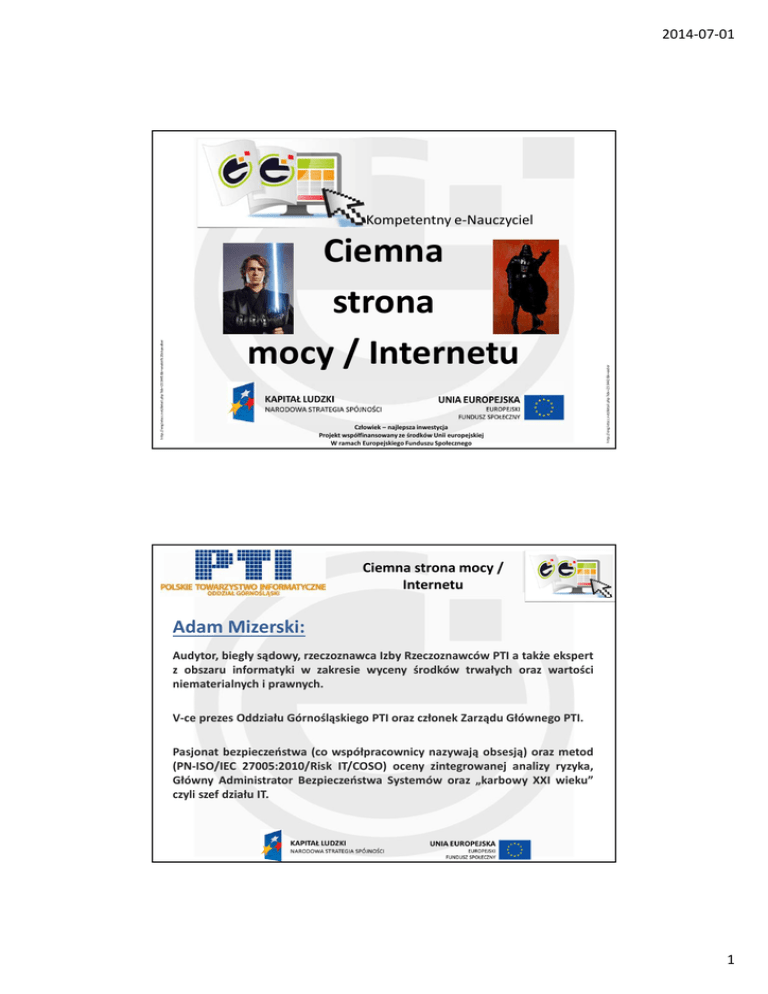 2014-07-01 Ciemna strona mocy / Internetu Człowiek – najlepsza inwestycja Projekt współfinansowany ze środków Unii europejskiej W ramach Europejskiego Funduszu Społecznego http://eng.letscc.net/detail.php?idx=233442&k=vader http://eng.letscc.net/detail.php?idx=233445&k=anakin%20skywalker Kompetentny e-Nauczyciel Ciemna strona mocy / Internetu Adam Mizerski: Audytor, biegły sądowy, rzeczoznawca Izby Rzeczoznawców PTI a także ekspert z obszaru informatyki w zakresie wyceny środków trwałych oraz wartości niematerialnych i prawnych. V-ce prezes Oddziału Górnośląskiego PTI oraz członek Zarządu Głównego PTI. Pasjonat bezpieczeństwa (co współpracownicy nazywają obsesją) oraz metod (PN-ISO/IEC 27005:2010/Risk IT/COSO) oceny zintegrowanej analizy ryzyka, Główny Administrator Bezpieczeństwa Systemów oraz „karbowy XXI wieku” czyli szef działu IT. 1 2014-07-01 Ciemna strona mocy / Internetu Agenda: • Botnety, trojany i inne „wredne paskudztwa” • WiFi Hacking / WiFi WarDriving • DNS Spoofing / DNS Poisoning Ciemna strona mocy / Internetu Atak http://eng.letscc.net/detail.php?idx=233437&k=sword http://eng.letscc.net/detail.php?idx=233437&k=sword Obrona 2 2014-07-01 Ciemna strona mocy / Internetu Potwór z Loch Ness sfotografowany przez satelity? http://wiadomosci.dziennik.pl/nauka/artykuly/456689,czy-to-potwor-z-loch-ness-zobacz-satelitarne-zdjecia-z-apple-maps-i-googlemaps.html http://wiadomosci.gazeta.pl/wiadomosci/1,114871,15829112,Potwor_z_Loch_Ness_sfotografowany_przez_satelity_.html Ciemna strona mocy / Internetu Atak / Obrona : Botnety Botnet – grupa komputerów zainfekowanych złośliwym oprogramowaniem (np. robakiem) pozostającym w ukryciu przed użytkownikiem ipozwalającym jego twórcy na sprawowanie zdalnej kontroli nad wszystkimi komputerami w ramach botnetu. Kontrola ta pozwala na zdalne rozsyłanie spamu oraz inne ataki z użyciem zainfekowanych komputerów. http://eng.letscc.net/detail.php?idx=97357&k=botnet http://pl.wikipedia.org/wiki/Botnet_(bezpiecze%C5%84stwo_komputerowe) Botnety posiadają potężną moc obliczeniową. Stanowią potężną cyberbroń i skuteczne narzędzie do nielegalnego zarabiania pieniędzy. Właściciel botnetu może kontrolować komputery tworzące sieć z dowolnego miejsca na świecie - z innego miasta, państwa, a nawet kontynentu. Internet jest skonstruowany w taki sposób, że możliwe jest kontrolowanie botnetu anonimowo. Źródło: http://www.securelist.pl/analysis/5859,biznes_botnetowy.html 3 2014-07-01 Ciemna strona mocy / Internetu Atak / Obrona : Botnety 2010: Stuxnet Działający w systemie Windows robak komputerowy, po raz pierwszy wykryty w czerwcu 2010. Jest pierwszym znanym robakiem używanym do szpiegowania i przeprogramowywania instalacji przemysłowych. Zawierał rootkit na system Windows, pierwszy w historii PLC rootkit. Wykorzystywał też wiele luk 0-day. Wirus miał zdolność aktualizacji metodą peer-to-peer. 2011: Duqu Język następcy Stuxneta, Duqu odkrytego we wrześniu 2011 roku, był zagadką dla analityków bezpieczeństwa Kaspersky Lab przez ponad pół roku. Niewiadomymi były również użyty do scalenia modułów wirusa kompilator a także typu szkieletu, na jakim oparto całe rozwiązanie Duqu. W lutym 2012 roku poprosili oni o pomoc na forach internetowych Ciemna strona mocy / Internetu Atak / Obrona : Botnety 2012: Flame Karspersky Lab dokonał dogłębnej analizy aktywności wirusa Flame, który niepostrzeżenie przez kilka ostatnich lat rozprzestrzeniał się przy pomocy domen rejestrowanych z wykorzystaniem fałszywych tożsamości. Infrastruktura wirusa była przenoszoną do różnych krajów, w tym do Polski. Tymczasem założyciel firmy Kaspersky ostrzega świat przez coraz głośniejszą cyberwojną. W latach 2008-2012 twórcy Flame, najbardziej zaawansowanego szkodliwego oprogramowania odkrytego do tej pory (czerwiec 2012 !), zarejestrowali na całym świecie 80 domen, które służyły do kontrolowania działalności robaka. Infrastruktura była przenoszona pomiędzy różnymi krajami, m.in. Polską, Hong Kongiem, Niemcami, Malezją, Łotwą, Wielką Brytanią i Szwajcarią. Kasperky Lab w porozumieniu z GoDaddy oraz OpenDNS doprowadził do odłączenia wszystkich domen, w większości zarejestrowanych na sfałszowane lub skradzione tożsamości http://technologie.gazeta.pl/internet/1,104530,11881362,Flame__wirus_wszech_czasow__atakowal_m_in__z_Polski.html 4 2014-07-01 Ciemna strona mocy / Internetu Atak / Obrona : Botnety 2012: Gauss Kolejny członek rodziny Stuxnet, Duqu, Flame Po raz pierwszy zaatakował we wrześniu 2011, ale świat dowiaduje się o nim dopiero teraz (sierpień 2012). Powstał na tej samej platformie co wcześniejsze, sponsorowane przez najprawdopodobniej CIA i Mossad projekty o nazwach Stuxnet, Duqu, Flame. Tym razem celuje w kradzież danych dotyczących …kont bankowych. Co potrafi Gauss? - przechwytuje ciastka i hasła z przeglądarek - wykrada pliki konfiguracyjne i wysyła je autorom trojana - infekuje dyski USB - kradnie dane dostępowe do banków (głównie ze Środkowego Wschodu: Bank of Beirut, EBLF, BlomBank, ByblosBank, FransaBank, Credit Libanais, Citibank, PayPal.) - kradnie dane dostępowe do portali społecznociowych, skrzynek e-mail http://niebezpiecznik.pl/post/gauss-kolejny-czlonek-rodziny-stuxnet-duqu-flame/ Ciemna strona mocy / Internetu Atak / Obrona : Botnety 2014 „The Mask / Careto" Eksperci z Kaspersky Lab wykryli "The Mask" (inna nazwa to Careto) - zaawansowane szkodliwe oprogramowanie, zaangażowane w globalne operacje cyberszpiegowskie, które istnieje co najmniej od 2007 roku. The Mask wyróżnia się złożonością zestawu narzędzi wykorzystywanych przez atakujących. Obejmuje niezwykle wyrafinowane szkodliwe oprogramowanie, rootkita, bootkita, wersje dla systemu OS X oraz Linux i prawdopodobnie wersje dla Androida oraz iOS (iPad/iPhone). Ofiary operacji "The Mask" zlokalizowano w państwach na cały świec