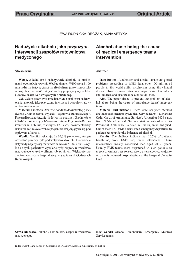 Praca Oryginalna Zdr Publ 2011;121(3):238-241 Original Article (:$58'1,&.$'52ĩ$.$11$$)7<.$ Alcohol abuse being the cause intervention Streszczenie Abstract !"#$$ %&'()*& % Cel+ && &' ,. & / 34 /#565&7 8%&& /39 :% #;< &&&' &%#$%=>&% ?& &'& '6#<$@ & '*& &A" 3 !" % B #$$ D people in the world suffer alcoholism being the clinical !BE &D &%B The paper aimed to present the problem of alcohol abuse being the cause of ambulance teams’ interven There were analysed medical DF GAB HIJ "+D AB4#565 D 7 8 /B AB :% "D #;< KD N O #$=> D O D FGA % E N B 6#9<$ P FGA Q G& of patients required hospitalisation at the Hospital Casualty P % % % % F G AB ?:DGDJ%GPBD: Copyright © 2011 Uniwersytet Medyczny w Lublinie @/6$##Q#6#V<W 6<S INTRODUCTION !"#$%"!&'% % O % % B BDE B % B`#j ?E B D &B% alcohol consumption is related to the increased incidence D 5$ DD D N H % % % B % D Dk? D;\>D FP`6j NDB `<j G / V;5>W% 9 V5=>W % D V##>W[DX"B9ODDV66>W and frequency of drinking depend mainly on two factors – ? D % D D `\jN B alcohol consumption appears to be among the unemployed men with average annual alcohol consumption estimated at #5#Z`=j Diagnosis and pre-hospital aid offered to intoxicated DO% D D DD &BDOE DE B`5j ? D E O Q O D B / D associated with frequent aggression and poor hygiene standards in this group of patients is also an unquestionable `;j } D D & % D N % ~ A V~AW%D D D & F economic aspect of Polish alcohol problems or the amount D % E DO!B% D5>D `Z%Sj N D J"D +:8 D/B AB : N D O D X D 6$$S V#9; Y% #9;% #9; Y% #9; "W "D#565B%#;< B K D J DB AIM The paper aimed to present the abuse of alcohol creating V %OW DXDBD RESULTS ?BD KDD#$=> D D BNB daily number of responses to patients being under the KDA%A V;ZW%[V=\WN DKB DB NB D KDB YV;;W%["V=\WY V\\W !(#")* +, , - . + 8 Man JO Total n <= 132 5 #;< > 20 ;5 3 100 ED & % D ;5> D VN #W !B% &BD B K D % \ V#\%#=9#;9W#599 !(#"/* +, , - . + ^6$ 21-30 <#9\$ \#9=$ =#95$ 5#9;$ _;# JO Total n 10 <S 6\ 6; 6; #S 3 6\ #;< > 5 23 #\ #5 #5 11 2 #\ 100 N B K of alcohol most often involved young adults aged 21 to <$ VN 6W E D B D % D ;\> V WDS$>V W% #Z9=S D #Z95\ D N D K D %XH&#\% [S; 6\$ @/6$##Q#6#V<W !(#"0! + - 1 - , , - . + Team type F Non-emergency Total n <= #<Z #;< > 20 Z$ 100 ? VZ$>W KD9 % 3B a real likelihood the victim needed medical intervention – in V6$>W% !(#"2! +, 3 , - . + Type of intervention 1 - emergency 2 - urgent 3 - non-urgent JO Total n #\ 103 =\ 2 #;< > Z 5$ 31 1 100 F B [ # D VZ>WQB[6 KD DXV5$>W 9B[<V<#>W !(#"4! +, 5 + , - . + Transport Total n == \= 56 11 #;< > 32 65 <5 5 100 FBKD V<6>W B XO was left under the care of relatives or transferred to the XBDV65>WGDX% B% K D V<5>W A B XO V5>WN DD D D E % ? DB 3 + ? E % k B described in the following way: “The patient is clearly under K D D E %DBD 4 !(#"6! +- , - . + Diagnosis #9?E 2 - Post-alcohol injuries <9}BK \9 Total n ;$ ;# 6; = #;< > \$ \# #5 3 100 +#[EDD % EO DX E V\$>W% 9 &V\#>W:DXD intervention was post-alcohol syndrome and withdrawal V<>W DISCUSSION +% !"B#$$ DDD F F ? / D alcohol addicts and those abusing alcohol ranges from \9= % X D # #6$$ " D #=> % D B BDDD %B D D % #6 %XD D/`#$%##j NO D KD D#$=>D D B A D KDY D)V#=>W`Sj%O} V<Z5>W `5j}% D OD D `5j ? D 6#<$JDD A @6$$6}D %\#9=$`5j The differences in the obtained results may be due to the D% /% D `#$j Z>D B B%5$>9~ % D A @% =$>DBK D XO B% <=> 9 B F B D % DD % D D response and urgent response to patients being under the KDB D D`5j ? D O O E <=>% 6\> [ ?6$>DB 9 O %#;>[9 &`5j The effects resulting from alcoholism are particularly DB DBD KD D % N +D9 @/6$##Q#6#V<W DD:DED 9 FX O D D &% D DB BD +% D effects of alcoholism and alcohol abuse in society and the B % D B according to which alcoholism is a disease that can be treated `##j CONCLUSIONS # G#$=>D kB X K D Mean number of ambulance interventions to patients KD D D 6 B KD DX 6#9<$% B < ~ OB B KD k B \ G&DKD X!F P REFERENCES # A G ?H ~ A% } F% ? .Y% YJ% G Y}% . J:% ! A:% : J:% ? ! :H +&Q6$$#6<##96$ 6\# 6 /%} }%FH/3. &F&&[/ ( 6$$5Q#SV6WH#6#9<; < . A G " 6$$\Q #$V#96WH\S9== \ ~ G + } " A&% / . %}A##56$#$%6$#$ HA/?A."G/":6$#$.##5#$/J~V\#66$#$W = G Y F A @ 6$$6Q\95H =#95 5 A %@3/ & /}6$$6G? 36$$=%ZV<WH#<#95 ; GA"3 G?36$$ZQ##V6WH##Z9S Z YY" &6$$= &G?36$$=QZV<WH<#<9; S A'}%AY /[ G"6$$\Q#$V#96WH#$9; #$G9A G% P D D : B FBG6$$;Q#\V#WH\=9S ##39J F A & ?H:G%@/:HG:Q#SSS \#9Z; +7 J(:$58'1,&.$'52ĩ$. – kierownik; mgr $11$$)7<.$[% A / G .D% P G : 7 F39J A /G.D Uniwersytet Medyczny w Lublinie +)5%6$9$S<: HZ#;#Z;=Z# 9 H