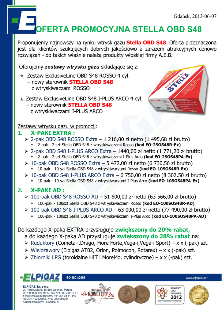 Gdańsk, 2013-06-07 OFERTA PROMOCYJNA STELLA OBD S48 Proponujemy najnowszy na rynku wtrysk gazu Stella OBD S48. Oferta przeznaczona jest dla klientów szukających dobrych jakościowo a zarazem atrakcyjnych cenowo rozwiązań - do takich właśnie należą produkty włoskiej firmy A.E.B. Oferujemy zestawy wtrysku gazu składające się z: * * Zestaw ExclusiveLine OBD S48 ROSSO 4 cyl. – nowy sterownik STELLA OBD S48 z wtryskiwaczami ROSSO Zestaw ExclusiveLine OBD S48 I-PLUS ARCO 4 cyl. – nowy sterownik STELLA OBD S48 z wtryskiwaczami I-PLUS ARCO Zestawy wtrysku gazu w promocji: 1. X-PAKI EXTRA : 2-pak OBD S48 ROSSO Extra – 1 216,00 zł netto (1 495,68 zł brutto) 2-pak - 2 szt Stella OBD S48 z wtryskiwaczami Rosso (kod EO-2SOS48R-Ex) 2-pak OBD S48 I-PLUS ARCO Extra – 1440,00 zł netto (1 771,20 zł brutto) 2-pak - 2 szt Stella OBD S48 z wtryskiwaczami I-Plus Arco (kod EO-2SOS48PA-Ex) 10-pak OBD S48 ROSSO Extra – 5 472,00 zł netto (6 730,56 zł brutto) 10-pak - 10 szt Stella OBD S48 z wtryskiwaczami Rosso (kod EO-10SOS48R-Ex) 10-pak OBD S48 I-PLUS ARCO Extra – 6 750,00 zł netto (8 302,50 zł brutto) 2. 10-pak - 10 szt Stella OBD S48 z wtryskiwaczami I-Plus Arco (kod EO-10SOS48PA-Ex) X-PAKI AD : 100-pak OBD S48 ROSSO AD – 51 600,00 zł netto (63 566,00 zł brutto) 100-pak - 100szt Stella OBD S48 z wtryskiwaczami Rosso (kod EO-100SOS48R-AD) 100-pak OBD S48 I-PLUS ARCO AD – 63 000,00 zł netto (77 490,00 zł brutto) 100-pak - 100szt Stella OBD S48 z wtryskiwaczami I-Plus Arco (kod EO-100SOS48PA-AD) Do każdego X-paka EXTRA przysługuje zwiększony do 20% rabat, a do każdego X-paka AD przysługuje zwiększony do 28% rabat na: Reduktory (Cometa-i,Drago, Fiore Forte,Vega-i,Vega-i Sport) – x x (-pak) szt. Wielozawory (Elpigaz AT02, Orion, Polmocon, Rotarex) – x x (-pak) szt. Zbiorniki LPG (toroidalne HIT i MoreMo, cylindryczne) – x x (-pak) szt.
