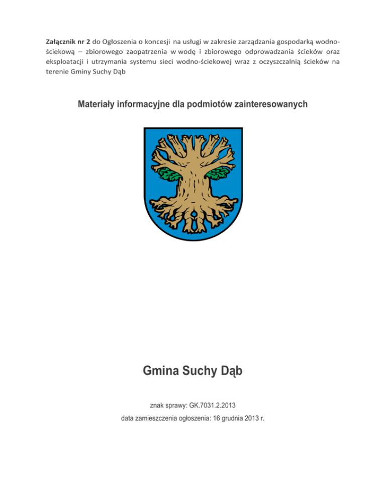 Załącznik nr 2 do Ogłoszenia o koncesji na usługi w zakresie zarządzania gospodarką wodnościekową – zbiorowego zaopatrzenia w wodę i zbiorowego odprowadzania ścieków oraz eksploatacji i utrzymania systemu sieci wodno-ściekowej wraz z oczyszczalnią ścieków na terenie Gminy Suchy Dąb Materiały informacyjne dla podmiotów zainteresowanych Gmina Suchy Dąb znak sprawy: GK.7031.2.2013 data zamieszczenia ogłoszenia: 16 grudnia 2013 r. Materiały informacyjne dla podmiotów zainteresowanych 30 października 2013 Spis treści WYKAZ SKRÓTÓW I OZNACZEŃ .......................................................................................................... 4 WSTĘP .................................................................................................................................................... 5 Informacje ogólne o gminie ................................................................................................................ 6 1. Lokalizacja .................................................................................................................................. 6 2. Komunikacja .............................................................................................................................. 7 3. Dane społeczno-gospodarcze ................................................................................................. 8 Część I. Opis techniczny systemu...................................................................................................... 10 4. Kanalizacja sanitarna .............................................................................................................. 10 5. Sieć wodociągowa .................................................................................................................. 11 5.1. Stopień zwodociągowania i bilans zapotrzebowania na wodę .................................... 11 5.2. Opis urządzeń zbiorowego zaopatrzenia w wodę .......................................................... 12 5.3. Jakość wody fizyko-chemiczna i bakteriologiczna wody ............................................... 14 6. Technologia oczyszczalni ścieków ........................................................................................ 14 7. Bilans ścieków na oczyszczalni .............................................................................................. 16 7.1. Ilość i jakość ścieków kierowanych na oczyszczalnię ..................................................... 16 7.2. Ładunek zanieczyszczeń w ściekach dopływających do oczyszczalni .......................... 17 7.3. Jakość ścieków oczyszczonych .......................................................................................... 17 8. Ocena stanu technicznego obiektów i urządzeń oczyszczalni .......................................... 18 8.1. Elementy części mechanicznej .......................................................................................... 18 8.2. Obiekty i urządzenia części biologicznej .......................................................................... 19 8.3. Obiekty przeróbki osadu nadmiernego ........................................................................... 19 9. Dane wyjściowe do modernizacji oczyszczalni uwzględniające „nową” aglomerację .. 19 9.1. Bilans ilości ścieków i ładunków zanieczyszczeń ............................................................ 19 9.2. Ilość ścieków ........................................................................................................................ 20 9.3. Jakość ścieków..................................................................................................................... 21 Część II. Planowana rozbudowa systemu ........................................................................................ 23 1. Projekt UE ................................................................................................................................ 23 2. Rozszerzenie Projektu ............................................................................................................ 23 DS Consulting 2 Materiały informacyjne dla podmiotów zainteresowanych 30 października 2013 CZĘŚĆ III: Wykaz niezbędnych inwestycji do realizacji przez koncesjonariusza ......................... 24 1. Oczyszczalnia ścieków ............................................................................................................ 24 2. Sieć wodociągowa .................................................................................................................. 24 CZĘŚĆ IV: Sytuacja ekonomiczna w zakresie gospodarki wod-kan w roku 2012 i I poł. 2013 . 25 1. Podstawowe informacje ekonomiczne dot. działalności wod-kan .................................. 25 2. Koszty funkcjonowania sytemu ............................................................................................ 26 3. Wpływy z działalności wod-kan i ściągalność ..................................................................... 29 4. Stan należności ........................................................................................................................ 29 DS Consulting 3 Materiały informacyjne dla podmiotów zainteresowanych 30 października 2013 WYKAZ SKRÓTÓW I OZNACZEŃ Gmina, Zamawiający Gmina Suchy Dąb, podmiot zamawiający niniejszą analizę DS Consulting Sp. z o.o. Doradca Gminy przy niniejszym postępowaniu Projekt inwestycyjny Projekt inwestycyjny pn. „Budowa sieci kanalizacji sanitarnej grawitacyjnej i tłocznej z przepompowniami pośrednimi i przydomowymi wraz z przyłączami w miejscowościach Suchy Dąb i Osice” współfinansowany z Funduszu Spójności. Ustawa o koncesji Ustawa z dnia 9 stycznia 2009 r. o koncesji na roboty budowlane lub usługi (Dz. U. 2009 r. nr 19, poz. 101) Ustawa o zbiorowym Ustawa z dnia 7 czerwca 2001 r. o zbiorowym zaopat