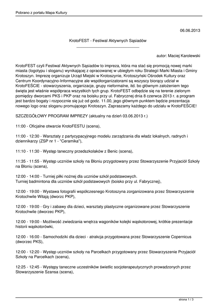 Pobrano z portalu Mapa Kultury 06.06.2013 KrotoFEST - Festiwal Aktywnych Sąsiadów ____________________________ autor: Maciej Karolewski KrotoFEST czyli Festiwal Aktywnych Sąsiadów to impreza, która ma stać się promocją nowej marki miasta (logotypu i sloganu) wynikającej z opracowanej w ubiegłym roku Strategii Marki Miasta i Gminy Krotoszyn. Imprezę organizuje Urząd Miejski w Krotoszynie, Krotoszyński Ośrodek Kultury oraz Centrum Koordynacyjno-Informacyjne ale współorganizatorami są wszyscy biorący udział w KrotoFEŚCIE - stowarzyszenia, organizacje, grupy nieformalne, itd. bo głównym założeniem tego święta jest właśnie współpraca wszystkich tych grup. KrotoFEST odbędzie się na terenie zielonym pomiędzy dworcami PKS i PKP oraz na boisku przy ul. Fabrycznej dnia 8 czerwca 2013 r. a program jest bardzo bogaty i rozpocznie się już od godz. 11.00, jego głównym punktem będzie prezentacja nowego logo oraz sloganu promującego Krotoszyn. Zapraszamy każdego do udziału w KrotoFEŚCIE! SZCZEGÓŁOWY PROGRAM IMPREZY (aktualny na dzień 03.06.2013 r.) 11:00 - Oficjalne otwarcie KrotoFESTU (scena), 11:00 - 12:30 - Warsztaty z partycypacyjnego modelu zarządzania dla władz lokalnych, radnych i dziennikarzy (ZSP nr 1 - "Ceramika"), 11:10 - 11:30 - Występ taneczny przedszkolaków z Benic (scena), 11:35 - 11:55 - Występ uczniów szkoły na Błoniu przygotowany przez Stowarzyszenie Przyjaciół Szkoły na Błoniu (scena), 12:00 - 14:00 - Turniej piłki nożnej dla uczniów szkół podstawowych. Turniej badmintona dla uczniów szkół podstawowych (boisko przy ul. Fabrycznej), 12:00 - 19:00 - Wystawa fotografii współczesnego Krotoszyna zorganizowana przez Stowarzyszenie Krotochwile Witają (dworzc PKP), 12:00 - 19:00 - Gry i zabawy dla dzieci, warsztaty plastyczne organizowane przez Stowarzyszenie Krotochwile (dworzec PKP), 12:00 - 19:00 - Możliwość zwiedzania wnętrza wagoników kolejki wąskotorowej, krótkie prezentacje historii wąskotorówki, 12:00 - 16:00 - Samochodziki dla dzieci - atrakcja przygotowana przez Stowarzyszenie Copernicus (dworzec PKS), 12:00 - 12:20 - Występ uczniów szkoły na Parcelkach przygotowany przez Stowarzyszenie Przyjaciół Szkoły na Parcelkach (scena), 12:25 - 12:45 - Występy taneczne uczestników świetlic socjoterapeutycznych prowadzonych przez Stowarzyszenie Szansa (scena), strona 1 / 3 Pobrano z portalu Mapa Kultury 12:50 - 13:10 - Występ uczennicy Gimnazjum Nr 2 Agaty Ratajczyk przygotowany przez Stowarzyszenie Copernicus (scena), 13:00 - 18:00 - Możliwość przejazdu drezyną Towarzystwa Miłośników Kolei Ostrzeszów - Namysłaki (ul. Dworcowa, przy magazynach kolejowych). Jednorozowo będzie mogła zabrać 9 osób, które okażą obsłudze bilety wstępu do kupienia w namiocie Towarzystwa Miłośników i Badaczy Ziemi Krotoszyńskiej, 13:15 - 13:35 - Teatr na Blokowisku przygotowany przez Stowarzyszenie Przyjaciół Szkoły G-4 (scena), 13:40 - 14:40 - Meta Krajoznawczego Zlotu Młodzieży i Święta Roweru, Finał Konkursu Piosenki Turystycznej i Biwakowej "Krotoszyńskie Trele" - 12 występów (scena), 14:00 - 16:00 - Zabawy i gry dla dzieci i dorosłych, II Otwarte Mistrzostwa w Rzucie Kaloszem (boisko przy ul. Fabrycznej), 14:00 - 14:50 - Czytanie Dzieciom - Krotoszyńska Biblioteka Publiczna (dworzec PKP), 14:50 - Przyjazd turystycznego pociągu "Ziemianin", przywitanie z Krotoszyńską Orkiestrą Dętą, ok. godz. 15.15 "wodowanie" lokomotywy przez strażaków (dworzec PKP), 15:00 - 15:15 - Prezentacja logo Krotoszyna i sloganu promocyjnego - układanie puzzli, rozdawanie balonów i chorągiewek z logiem (scena), 15:15 - 15:25 - Wręczenie nagród zwycięzcom konkursu na Najlepszą Inicjatywę Lokalną na obszarze miejskim i wiejskim (scena), 15:30 - 16:00 - Pokaz mody Galerii Krotoszyńskiej (scena), 15:55 - Odjazd turystycznego pociągu "Biskupianin" - przejazd zabytkowym składem do Krobi i z powrotem (dworzec PKP), 16:00 - 16:40 - Blok biesiadny - Zespół Ludowy Kobierzanki i Zespół Śpiewaczy działający przy Związku Emerytów, Rencistów i Inwalidów w Kobiernie (scena), 16:00 - 17:30 - Spotkania i rozmowy z urzędnikami miejskimi, czyli panele dyskusyjne: Zapytaj eksperta i Krotoszyn przyszłości. W rozmowach uczestniczyć będą: skarbnik gminy, architekt, dyrektor inżynierii miejskiej, naczelnik wydziału komunalnego (namiot przy scenie), 16:00 - 16:45 - Konkurs recytatorski "Stoi na stacji lokomotywa" - Towarzystwo Miłośników i Badaczy Ziemi Krotoszyńskiej i Krotoszyńska Biblioteka Publiczna (dworzec PKP), 16:45 - 17:00 - Wyniki konkursu recytatorskiego "Stoi na stacji lokomotywa" - Towarzystwo Miłośników i Badaczy Ziemi Krotoszyńskiej i Krotoszyńska Biblioteka Publiczna oraz konkursu dla pasażerów pociągu "Ziemianin" - TMiBZK (scena), ok. 16:00 - Przyjazd wozu strażackiego - pokaz sprzętu strażackiego, polewanie wodą (boisko przy ul. Fabrycznej), 16:30 - 17:00 - Parada motocykli i pokaz stuntu (ul. Konstytucji 3 Maja), strona 2 / 3 Pobrano z portalu Mapa Kultury 17:00 - 17:20 - Występ uczniów Społecznego Ogniska Muzycznego działającego przy Krotoszyńskim Towarzystwie Muzycznym (scena), 17:20 - 17:40 - Występ zespołu Elixir z gminy Kobylin (scena), 17:48 - Przyjazd turystycznego pociągu "Biskupianin" z Krobii, manewry lokomotywy parowej (dworzec PKP), 18:10 - Odjazd turystycznego pociągu "Ziemianin" (dworzec PKP), 17:40 - 18:00 - Występ uczniów z Zespołu Szkół w Orpiszewie - Zespół "Chodźmy Dalej" oraz zespół taneczny "Dance Revolution" (scena), 18:10 - Pokaz ratownictwa medycznego przygotowany przez Związek Harcerstwa Polskiego i Klub Motocyklowy Ignis Ardens (przed sceną), 18:40 - 19:40 - Gościnny występ rodzinny Natalii Niemen i Mate.O zaproszonych przez Stowarzyszenie Zastępczego Rodzicielstwa oddział w Krotoszynie "Famuła" - koncert promujący ideę rodzicielstwa zastępczego (scena), 19:50 - 20:00 - Pokaz capoeiry (przed sceną), 20:00 - 20:40