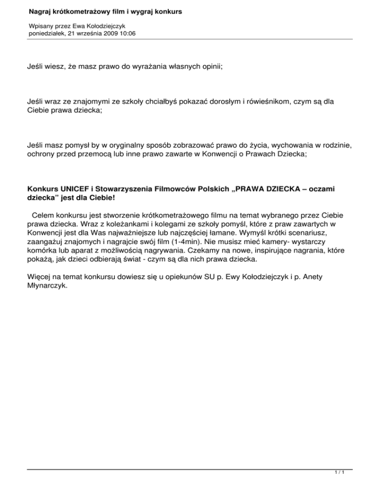 Nagraj krótkometrażowy film i wygraj konkurs Wpisany przez Ewa Kołodziejczyk poniedziałek, 21 września 2009 10:06 Jeśli wiesz, że masz prawo do wyrażania własnych opinii; Jeśli wraz ze znajomymi ze szkoły chciałbyś pokazać dorosłym i rówieśnikom, czym są dla Ciebie prawa dziecka; Jeśli masz pomysł by w oryginalny sposób zobrazować prawo do życia, wychowania w rodzinie, ochrony przed przemocą lub inne prawo zawarte w Konwencji o Prawach Dziecka; Konkurs UNICEF i Stowarzyszenia Filmowców Polskich „PRAWA DZIECKA – oczami dziecka” jest dla Ciebie! Celem konkursu jest stworzenie krótkometrażowego filmu na temat wybranego przez Ciebie prawa dziecka. Wraz z koleżankami i kolegami ze szkoły pomyśl, które z praw zawartych w Konwencji jest dla Was najważniejsze lub najczęściej łamane. Wymyśl krótki scenariusz, zaangażuj znajomych i nagrajcie swój film (1-4min). Nie musisz mieć kamery- wystarczy komórka lub aparat z możliwością nagrywania. Czekamy na nowe, inspirujące nagrania, które pokażą, jak dzieci odbierają świat - czym są dla nich prawa dziecka. Więcej na temat konkursu dowiesz się u opiekunów SU p. Ewy Kołodziejczyk i p. Anety Młynarczyk. 1/1