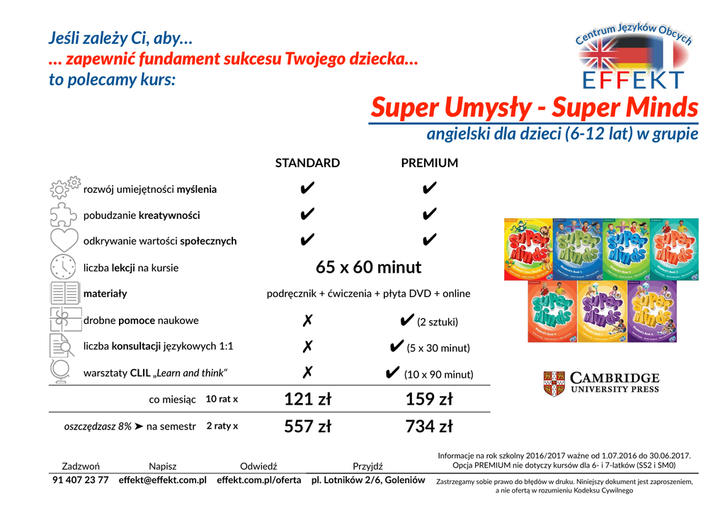 Jeśli zależy Ci, aby… … zapewnić fundament sukcesu Twojego dziecka… to polecamy kurs: Super Umysły - Super Minds angielski dla dzieci (6-12 lat) w grupie rozwój umiejętności myślenia pobudzanie kreatywności odkrywanie wartości społecznych STANDARD PREMIUM ✔ ✔ ✔ ✔ ✔ ✔ 65 x 60 minut liczba lekcji na kursie materiały podręcznik + ćwiczenia + płyta DVD + online ✗ ✗ ✗ ✔ (10 x 90 minut) co miesiąc 10 rat x 121 zł 159 zł 2 raty x 557 zł 734 zł drobne pomoce naukowe liczba konsultacji językowych 1:1 warsztaty CLIL „Learn and think“ oszczędzasz 8% ➤ na semestr Zadzwoń 91 407 23 77 Napisz effekt@effekt.com.pl Odwiedź effekt.com.pl/oferta ✔ (2 sztuki) ✔ (5 x 30 minut) Przyjdź pl. Lotników 2/6, Goleniów Informacje na rok szkolny 2016/2017 ważne od 1.07.2016 do 30.06.2017. Opcja PREMIUM nie dotyczy kursów dla 6- i 7-latków (SS2 i SM0) Zastrzegamy sobie prawo do błędów w druku. Niniejszy dokument jest zaproszeniem, a nie ofertą w rozumieniu Kodeksu Cywilnego