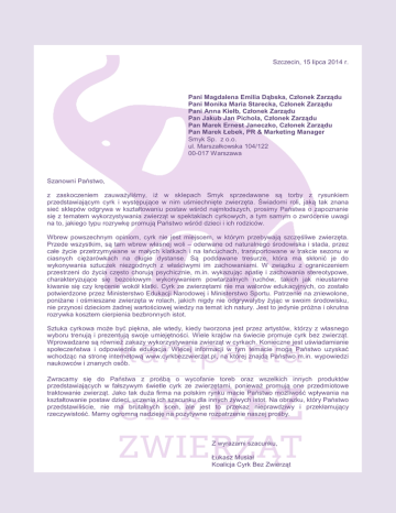 Szczecin, 15 lipca 2014 r. Pani Magdalena Emilia Dąbska, Członek Zarządu Pani Monika Maria Starecka, Członek Zarządu Pani Anna Kiełb, Członek Zarządu Pan Jakub Jan Pichola, Członek Zarządu Pan Marek Ernest Janeczko, Członek Zarządu Pan Marek Łebek, PR & Marketing Manager Smyk Sp. z o.o. ul. Marszałkowska 104/122 00-017 Warszawa Szanowni Państwo, z zaskoczeniem zauważyliśmy, iż w sklepach Smyk sprzedawane są torby z rysunkiem przedstawiającym cyrk i występujące w nim uśmiechnięte zwierzęta. Świadomi roli, jaką tak znana sieć sklepów odgrywa w kształtowaniu postaw wśród najmłodszych, prosimy Państwa o zapoznanie się z tematem wykorzystywania zwierząt w spektaklach cyrkowych, a tym samym o zwrócenie uwagi na to, jakiego typu rozrywkę promują Państwo wśród dzieci i ich rodziców. Wbrew powszechnym opiniom, cyrk nie jest miejscem, w którym przebywają szczęśliwe zwierzęta. Przede wszystkim, są tam wbrew własnej woli – oderwane od naturalnego środowiska i stada, przez całe życie przetrzymywane w małych klatkach i na łańcuchach, transportowane w trakcie sezonu w ciasnych ciężarówkach na długie dystanse. Są poddawane tresurze, która ma skłonić je do wykonywania sztuczek niezgodnych z właściwymi im zachowaniami. W związku z ograniczeniem przestrzeni do życia często chorują psychicznie, m.in. wykazując apatię i zachowania stereotypowe, charakteryzujące się bezcelowym wykonywaniem powtarzalnych ruchów, takich jak nieustanne kiwanie się czy kręcenie wokół klatki. Cyrk ze zwierzętami nie ma walorów edukacyjnych, co zostało potwierdzone przez Ministerstwo Edukacji Narodowej i Ministerstwo Sportu. Patrzenie na zniewolone, poniżane i ośmieszane zwierzęta w rolach, jakich nigdy nie odgrywałyby żyjąc w swoim środowisku, nie przynosi dzieciom żadnej wartościowej wiedzy na temat ich natury. Jest to jedynie próżna i okrutna rozrywka kosztem cierpienia bezbronnych istot. Sztuka cyrkowa może być piękna, ale wtedy, kiedy tworzona jest przez artystów, którzy z własnego wyboru trenują i prezentują swoje umiejętności. Wiele krajów na świecie promuje cyrk bez zwierząt. Wprowadzane są również zakazy wykorzystywania zwierząt w cyrkach. Konieczne jest uświadamianie społeczeństwa i odpowiednia edukacja. Więcej informacji w tym temacie mogą Państwo uzyskać wchodząc na stronę internetową www.cyrkbezzwierzat.pl, na której znajdą Państwo m.in. wypowiedzi naukowców i znanych osób. Zwracamy się do Państwa z prośbą o wycofanie toreb oraz wszelkich innych produktów przedstawiających w fałszywym świetle cyrk ze zwierzętami, ponieważ promują one przedmiotowe traktowanie zwierząt. Jako tak duża firma na polskim rynku macie Państwo możliwość wpływania na kształtowanie postaw dzieci, uczenia ich szacunku dla innych żywych istot. Na obrazku, który Państwo przedstawiliście, nie ma brutalnych scen, ale jest to przekaz nieprawdziwy i przekłamujący rzeczywistość. Mamy ogromną nadzieję na pozytywne rozpatrzenie naszej prośby. Z wyrazami szacunku, Łukasz Musiał Koalicja Cyrk Bez Zwierząt