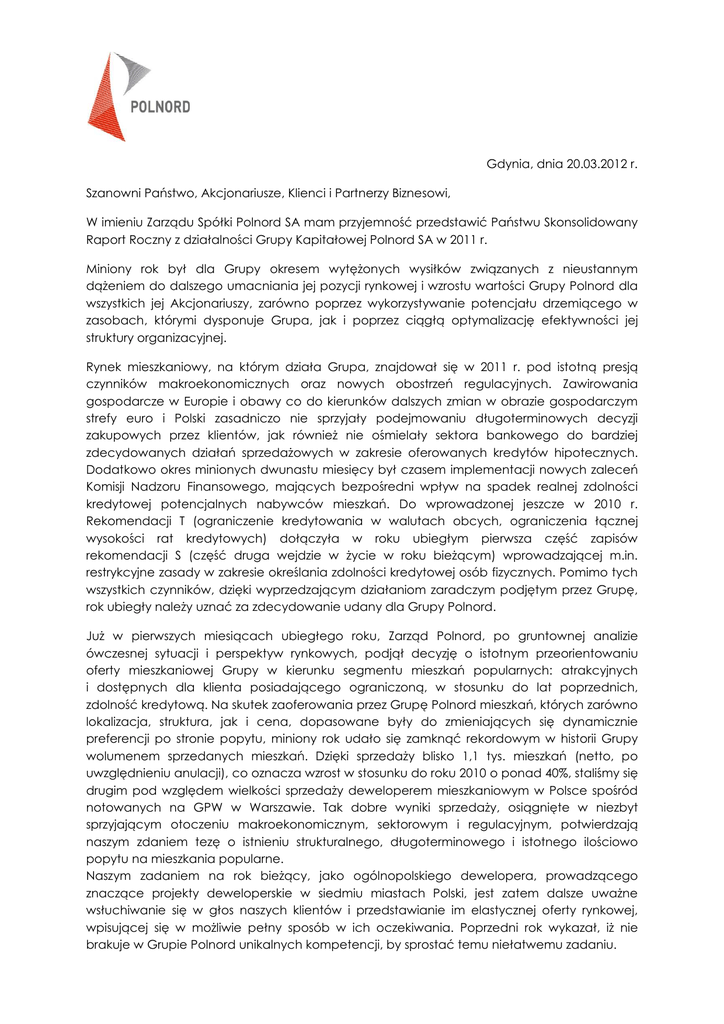 Gdynia, dnia 20.03.2012 r. Szanowni Państwo, Akcjonariusze, Klienci i Partnerzy Biznesowi, W imieniu Zarządu Spółki Polnord SA mam przyjemność przedstawić Państwu Skonsolidowany Raport Roczny z działalności Grupy Kapitałowej Polnord SA w 2011 r. Miniony rok był dla Grupy okresem wytęŜonych wysiłków związanych z nieustannym dąŜeniem do dalszego umacniania jej pozycji rynkowej i wzrostu wartości Grupy Polnord dla wszystkich jej Akcjonariuszy, zarówno poprzez wykorzystywanie potencjału drzemiącego w zasobach, którymi dysponuje Grupa, jak i poprzez ciągłą optymalizację efektywności jej struktury organizacyjnej. Rynek mieszkaniowy, na którym działa Grupa, znajdował się w 2011 r. pod istotną presją czynników makroekonomicznych oraz nowych obostrzeń regulacyjnych. Zawirowania gospodarcze w Europie i obawy co do kierunków dalszych zmian w obrazie gospodarczym strefy euro i Polski zasadniczo nie sprzyjały podejmowaniu długoterminowych decyzji zakupowych przez klientów, jak równieŜ nie ośmielały sektora bankowego do bardziej zdecydowanych działań sprzedaŜowych w zakresie oferowanych kredytów hipotecznych. Dodatkowo okres minionych dwunastu miesięcy był czasem implementacji nowych zaleceń Komisji Nadzoru Finansowego, mających bezpośredni wpływ na spadek realnej zdolności kredytowej potencjalnych nabywców mieszkań. Do wprowadzonej jeszcze w 2010 r. Rekomendacji T (ograniczenie kredytowania w walutach obcych, ograniczenia łącznej wysokości rat kredytowych) dołączyła w roku ubiegłym pierwsza część zapisów rekomendacji S (część druga wejdzie w Ŝycie w roku bieŜącym) wprowadzającej m.in. restrykcyjne zasady w zakresie określania zdolności kredytowej osób fizycznych. Pomimo tych wszystkich czynników, dzięki wyprzedzającym działaniom zaradczym podjętym przez Grupę, rok ubiegły naleŜy uznać za zdecydowanie udany dla Grupy Polnord. JuŜ w pierwszych miesiącach ubiegłego roku, Zarząd Polnord, po gruntownej analizie ówczesnej sytuacji i perspektyw rynkowych, podjął decyzję o istotnym przeorientowaniu oferty mieszkaniowej Grupy w kierunku segmentu mieszkań popularnych: atrakcyjnych i dostępnych dla klienta posiadającego ograniczoną, w stosunku do lat poprzednich, zdolność kredytową. Na skutek zaoferowania przez Grupę Polnord mieszkań, których zarówno lokalizacja, struktura, jak i cena, dopasowane były do zmieniających się dynamicznie preferencji po stronie popytu, miniony rok udało się zamknąć rekordowym w historii Grupy wolumenem sprzedanych mieszkań. Dzięki sprzedaŜy blisko 1,1 tys. mieszkań (netto, po uwzględnieniu anulacji), co oznacza wzrost w stosunku do roku 2010 o ponad 40%, staliśmy się drugim pod względem wielkości sprzedaŜy deweloperem mieszkaniowym w Polsce spośród notowanych na GPW w Warszawie. Tak dobre wyniki sprzedaŜy, osiągnięte w niezbyt sprzyjającym otoczeniu makroekonomicznym, sektorowym i regulacyjnym, potwierdzają naszym zdaniem tezę o istnieniu strukturalnego, długoterminowego i istotnego ilościowo popytu na mieszkania popularne. Naszym zadaniem na rok bieŜący, jako ogólnopolskiego dewelopera, prowadzącego znaczące projekty deweloperskie w siedmiu miastach Polski, jest zatem dalsze uwaŜne wsłuchiwanie się w głos naszych klientów i przedstawianie im elastycznej oferty rynkowej, wpisującej się w moŜliwie pełny sposób w ich oczekiwania. Poprzedni rok wykazał, iŜ nie brakuje w Grupie Polnord unikalnych kompetencji, by sprostać temu niełatwemu zadaniu. Miniony rok był takŜe okresem waŜnych wydarzeń w projektach z segmentu komercyjnego, którego ciągły rozwój jest jednym z najwaŜniejszych elementów strategii Grupy Polnord. Dzięki nieustannej, wytęŜonej pracy całego naszego zespołu udało się nie tylko utrzymać, ale takŜe znacznie zintensyfikować tempo komercjalizacji i budowy kolejnych projektów biurowych realizowanych w ramach kompleksu Wilanów Office Park. Jeszcze w pierwszej połowie 2011 roku zakończyliśmy z sukcesem budowę w pełni wynajętego budynku B-1 (7,3 tys. m kw. powierzchni pod wynajem), by niemal w tym samym momencie rozpocząć budowę prawie całkowicie juŜ wynajętego budynku B-3 (9,4 tys. m kw. powierzchni pod wynajem). Obecnie więc, Wilanów Office Park to kompleks biurowy o łącznej wybudowanej powierzchni uŜytkowej równej blisko 40 tys. m kw., który wpisał się na stałe w krajobraz wysokiej jakości nieruchomości komercyjnych Warszawy. Jestem przekonany, iŜ, mając na uwadze wciąŜ istotny potencjał rozwojowy tej lokalizacji (realizacja kolejnych budynków w ramach tego projektu to skala ponad 100 tys. m kw. powierzchni uŜytkowej), Wilanów Office Park będzie, w roku bieŜącym i w kolejnych latach, jednym z głównych projektów wpływających znacząco pozytywnie na wyniki ekonomiczne Grupy Polnord oraz na jej wycenę rynkową. Planujemy takŜe, iŜ bieŜący rok, będzie okresem zwieńczenia intensywnej pracy specjalistów z Grupy Polnord i Globe Trade Centre SA, jaka miała miejsce w 2011 roku, zmierzającej do złoŜenia wniosku o pozwolenie na budowę Centrum Handlowego w Wilanowie. Jesteśmy przekonani, Ŝe ta tak wyczekiwana przez mieszkańców Wilanowa inwestycja, będąca zarazem najbardziej doniosłym przedsięwzięciem w zakresie komercyjnych powierzchni handlowych w Warszawie, stanie się kolejną wizytówką najwyŜszych kompetencji Grupy Polnord oraz znajdzie swe odzwierciedlenie w zyskach finansowych Grupy w kolejnych okresach. Pozytywny wpływ na pozycję gotówkową i wynik finansowy Grupy w 2011 roku miała sprzedaŜ do instytucji bankowej wierzytelności z tytułu odszkodowania za przejęcie nieruchomości drogowych w ramach inwestycji na terenach Wilanowa. Opierając się na juŜ wydanych, korzystnych rozstrzygnięciach sądowych w tej sprawie, Grupa Polnord w minionym roku podjęła działania zmierzające do uzyskania następnych, naleŜnych jej, wysokich odszkodo
