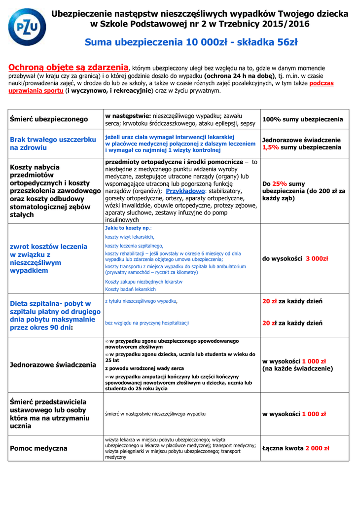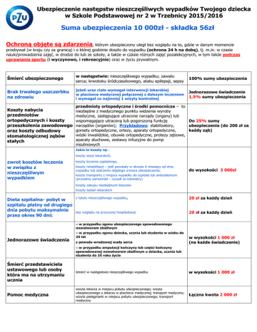 Ubezpieczenie następstw nieszczęśliwych wypadków Twojego dziecka w Szkole Podstawowej nr 2 w Trzebnicy 2015/2016 Suma ubezpieczenia 10 000zł - składka 56zł Ochroną objęte są zdarzenia, którym ubezpieczony uległ bez względu na to, gdzie w danym momencie przebywał (w kraju czy za granicą) i o której godzinie doszło do wypadku (ochrona 24 h na dobę), tj. m.in. w czasie nauki/prowadzenia zajęć, w drodze do lub ze szkoły, a także w czasie różnych zajęć pozalekcyjnych, w tym także podczas uprawiania sportu (i wyczynowo, i rekreacyjnie) oraz w życiu prywatnym. Śmierć ubezpieczonego w następstwie: nieszczęśliwego wypadku; zawału serca; krwotoku śródczaszkowego, ataku epilepsji, sepsy 100% sumy ubezpieczenia Brak trwałego uszczerbku na zdrowiu jeżeli uraz ciała wymagał interwencji lekarskiej w placówce medycznej połączonej z dalszym leczeniem i wymagał co najmniej 1 wizyty kontrolnej Jednorazowe świadczenie 1,5% sumy ubezpieczenia Koszty nabycia przedmiotów ortopedycznych i koszty przeszkolenia zawodowego oraz koszty odbudowy stomatologicznej zębów stałych przedmioty ortopedyczne i środki pomocnicze – to niezbędne z medycznego punktu widzenia wyroby medyczne, zastępujące utracone narządy (organy) lub Do 25% sumy wspomagające utraconą lub pogorszoną funkcję narządów (organów); Przykładowo: stabilizatory, ubezpieczenia (do 200 zł za gorsety ortopedyczne, ortezy, aparaty ortopedyczne, każdy ząb) wózki inwalidzkie, obuwie ortopedyczne, protezy zębowe, aparaty słuchowe, zestawy infuzyjne do pomp insulinowych Jakie to koszty np.: koszty wizyt lekarskich, zwrot kosztów leczenia w związku z nieszczęśliwym wypadkiem koszty leczenia szpitalnego, koszty rehabilitacji – jeśli powstały w okresie 6 miesięcy od dnia wypadku lub zdarzenia objętego umowa ubezpieczenia; koszty transportu z miejsca wypadku do szpitala lub ambulatorium (prywatny samochód – ryczałt za kilometry) do wysokości 3 000zł Koszty zakupu niezbędnych lekarstw Koszty badań lekarskich Dieta szpitalna- pobyt w szpitalu płatny od drugiego dnia pobytu maksymalnie przez okres 90 dni: z tytułu nieszczęśliwego wypadku, 20 zł za każdy dzień bez względu na przyczynę hospitalizacji 20 zł za każdy dzień • w przypadku zgonu ubezpieczonego spowodowanego nowotworem złośliwym Jednorazowe świadczenia • w przypadku zgonu dziecka, ucznia lub studenta w wieku do 25 lat z powodu wrodzonej wady serca w wysokości 1 000 zł (na każde świadczenie) • w przypadku amputacji kończyny lub części kończyny spowodowanej nowotworem złośliwym u dziecka, ucznia lub studenta do 25 roku życia Śmierć przedstawiciela ustawowego lub osoby która ma na utrzymaniu ucznia śmierć w następstwie nieszczęśliwego wypadku w wysokości 1 000 zł Pomoc medyczna wizyta lekarza w miejscu pobytu ubezpieczonego; wizyta ubezpieczonego u lekarza w placówce medycznej; transport medyczny; wizyta pielęgniarki w miejscu pobytu ubezpieczonego; transport medyczny Łączna kwota 2 000 zł • organizacja procesu rehabilitacji Pomoc rehabilitacyjna i pielęgnacyjna Pomoc psychologa Lekcje prywatne • dostawa drobnego sprzętu rehabilitacyjnego lub medycznego • dostarczenie do miejsca pobytu leków przepisanych przez lekarza Do 500 zł na każdy wypadek Do 300 zł na każdy wypadek • domowa opieka pielęgniarska po hospitalizacji powyżej 2 dni Do 1 000 zł na każdy wypadek pomoc psychologa Do 1 500 zł na każdy wypadek dla uczniów – jeżeli na skutek zaistnienia nieszczęśliwego wypadku uczeń nie może uczęszczać do szkoły dłużej niż 10 dni od dnia wypadku PZU SA organizuje i pokrywa koszty indywidualnych korepetycji z wybranych przedmiotów (maksymalnie 2) wchodzących w zakres programu nauczania szkoły Do 400 zł na każdy nieszczęśliwy wypadek Zgłaszanie szkód w PZU S.A. i pomoc powypadkowa 801-102-102, dostępne 24h/7 lub PZU SA Oddział Trzebnica ul. Głowackiego 15a w godz. 8:00-16:00 www.pzu.pl Podstawa: ogólne warunki ubezpieczenia następstw nieszczęśliwych wypadków dzieci, młodzieży i personelu ustalone uchwałą UZ/102/2013 z dnia 29 marca 2013r. oraz postanowienia odmienne (dostępne w sekretariacie szkoły)