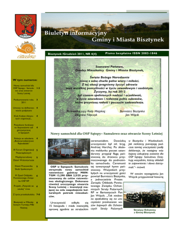 Biuletyn informacyjny Gminy i Miasta Bisztynek Bisztynek /Grudzień 2011, NR 4(4) Pismo bezpłatne ISSN 2083-1846 Szanowni Państwo, Drodzy Mieszkańcy Gminy i Miasta Bisztynek, W tym numerze: Nowy samochód dla OSP Sątopy– Samule- 1-2 wo oraz otwarcie Sceny Letniej Podsumowanie roku 2011 3 Umowy na dofinanso- 4 wanie podpisane Klub Kobiet Aktywnych organizuje... Pozyskano fundusze na doposażenie sali gimnastycznej w Sątopach Relacja ze szkolenia „Bożonarodzeniowe Rękodzieło” 4 Święta Bożego Narodzenia niosą z sobą chwile pełne wiary i miłości. Z tej okazji pragniemy życzyć zdrowia oraz wszelkiej pomyślności w życiu zawodowym i osobistym. Życzymy, by rok 2012 był czasem spełnionych nadziei i oczekiwań, a życie zawodowe i rodzinne pełne sukcesów, które przyniosą radość i poczucie zadowolenia. Przewodniczący Rady Miejskiej Zbigniew Filipczyk 4 Nowy samochód dla OSP Sątopy– Samulewo oraz otwarcie Sceny Letniej 4 III Forum Organizacji 5 Pozarządowych Międzynarodowy 5 Dzień Wolontariusza Dzień Pracownika Służb Społecznych 5 III Zjazd Oddziału 6 Powiatowego Związku OSP RP Projekt „Potyczki ze sztuką” trwa Burmistrz Bisztynka Jan Wójcik 6 Z życia przedszkolaka 7-8 Bisztynek w Mikołaj- 8 kowym Turnieju Piłki Nożnej OSP w Sątopach- Samulewie otrzymała nowy samochód ratowniczo- gaśniczy MANTGM 13,290 GBA 2,5/25 przystosowany do celów ratownictwa ekologicznego. Dokonano również uroczystego otwarcia Sceny Letniej – inwestycji mającej na celu zaspokojenie kulturalnych potrzeb mieszkańców. Uroczystość odbyła się 15 listopada i miała niezwykłą oprawę zgodnie ze strażackim ceremoniałem. Dowódcą uroczystości był mł. bryg. Andrzej Harchaj. Po złożeniu meldunku poczet sztandarowy przypiął flagę państwową do drzewca przymocowanego do podnośnika samochodu. Ceremonii tej towarzyszył hymn państwowy. Wszystkich przybyłych na uroczystość gości powitał Burmistrz Bisztynka, a jednocześnie Prezes Zarządu Oddziału Powiatowego Związku Ochotniczych Straży Pożarnych RP w Bartoszycach Pan Jan Wójcik. „Tak niedawno spotkaliśmy się na uroczystości przekazania wozów bojowych dla Ochotniczych Straży Pożarnych w Bisztynku i Wozławkach. Jak niektórzy pamiętają podczas tamtej uroczystości padły deklaracje, że następny wóz bojowy zakupiony zostanie dla OSP Sątopy- Samulewo. Dziękuję wszystkim, którzy składali te zapewnienia i słowa dotrzymali.”- mówił. W swoim wystąpieniu Jan Wójcik przypomniał historię Strażacy Ochotnicy z Gminy Bisztynek. Str. 2 AKTUALNOŚCI powietrzne i pięć radiostacji nasobnych. Tego rodzaju pojazd poprawi zabezpieczenie regionu na wypadek klęsk żywiołowych i katastrof ekologicznych oraz przyczyni się do sprawniejszego usuwania skutków wypadków drogowych i innych zagrożeń. Podczas uroczystości do użytku wszystkich mieszkańców Sątop- Samulewa oraz całej gminy oddano ScePrzybyłych gości powitał nę Letnią. Na realizację inwestycji Burmistrz Jan Wójcik. otrzymano dofinansowanie w wysokości 221 tys. zł. w ramach działania jednostki „Odnowa i Rozwój OSP w SątoWsi” objętego Propach- Samugramem Rozwoju lewie. ProObszarów Wiejskich jekt pn. na lata 2007-2013. „Zakup saProjekt był realizomochodu wany pn. „Przestrzeń ratowniczopubliczna miejscowogaśniczego ści Sątopy- Samulewo przystosowarozwojem tożsamonego do ceści społecznej.” Samochód oraz scenę poświęcił lów ratowW zakresie przeproKs. Leonard Klimek. nictwa ekolowadzonych prac gicznego dla powstała plenerowa OSP Sątopyscena letnia bez zadaSamulewo” szenia oraz budynek otrzymał socjalno- sanitarny. dofinansowaPlac przed sceną zonie z Regiostał wyposażony nalnego Prow oświetlenie zegramu Opewnętrzne oraz zagoracyjnego spodarowany: wykoWarmia nano przyłącza oraz Uroczyste przecięcie wstęgi. i Mazury na chodnik przy budynlata 2007ku. Wokół placu po2013, działanie 6.2 Ochrona środo- wstały estetyczne trawniki oraz nasawiska przez zanieczyszczeniami, dzenia krzewów. Całkowita wartość zniszczeniami. Całkowita wartość inwestycji wyniosła 364 tys. zł. projektu wyniosła 687 494 zł., Spośród zaproszonych gości głos zaw tym dofinansowanie ze środków brał m.in. Poseł na Sejm RP Pan Miron europejskich w wys. 550 tys. zł., co Sycz, gratulując wspaniałych inwestystanowiło 80 % ogólnej wartości. cji. Po przemówieniach nastąpiło wręNowy samochód posiada napęd na czenie aktu przekazania oraz kluczy4 koła i zbiornik wodny o pojem- ków do samochodu Prezesowi OSP ności 2500 l. Jest wyposażony Sątopy- Samulewo Panu Adamowi w autopompę, działko szybkiego Sujecie. Poświęcenia samochodu oraz natarcia, wyciągarkę, najaśnicę sceny dokonał Proboszcz Parafii Sątoi aparat prądotwórczy, aparaty py Ks. Leonard Klimek. Przecięcia Wręczenie aktu przekazania oraz kluczyków do samochodu. wstęgi symbolizującego otwarcie Sceny Letniej dokonali: Miron Sycz, Jan Wójcik, Krystyna Zawistowska, Zbigniew Nadolny oraz Zbigniew Filipczyk. Po oficjalnej części uroczystości odbyła się prezentacja sprzętu. Na wszystkich zaproszonych gości oraz przybyłych mieszkańców czekała słynna już „grochówka strażaczek”, którą specjalnie na ten cel przygotowali: Pani Iwona Stańko, Pani Ewa Rogalska oraz Pan Zbigniew Ziółkowski. Prezentacja nowego sprzętu. Na wszystkich czekała słynna „grochówka strażaczek”. Wraz z końcem roku przystępujemy do refleksji i podsumowań. Jaki był to rok dla Gminy Bisztynek? Jakie inwestycje zostały zrealizowane? Przypominamy, co działo się na terenie gminy w mijającym 2011roku. PODSUMOWANIE ROKU 2011 Str. 3 Nowy rok, nowe władze. Przełom roku 2010/2011 odbył się pod hasłem wyboru władz samorządowych. Na stanowisko Burmistrza Bisztynka po raz kolejny wybrano Jana Wójcika, Przewodniczącym Rady Miejskiej w Bisztynku nieprzerwanie od 1999r. został Zbigniew Filipczyk . Podczas wyborów m